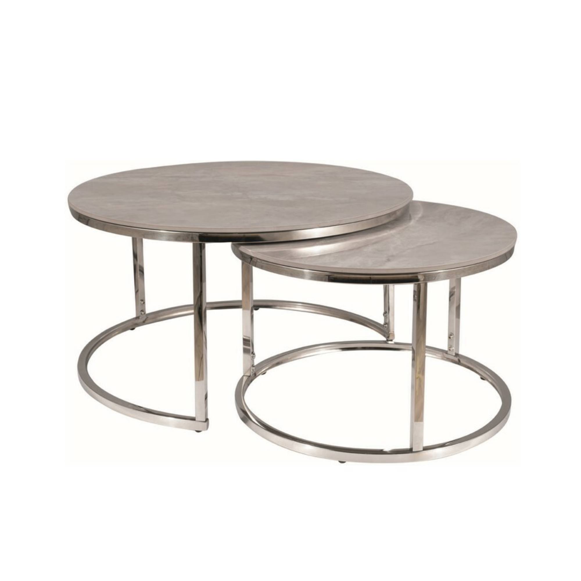 Kruhové odkladacie dosky sú vyrobené z keramiky. Ladené sú do dekora mramoru, ktorý interiéru prepožičia punc luxusu. Maximálnu stabilitu zaisťuje kovová konštrukcia. Odlišná veľkosť stolíkov umožňuje zasunúť menší stolík pod väčší, čím v prípade potreby ušetríte cenné miesto.