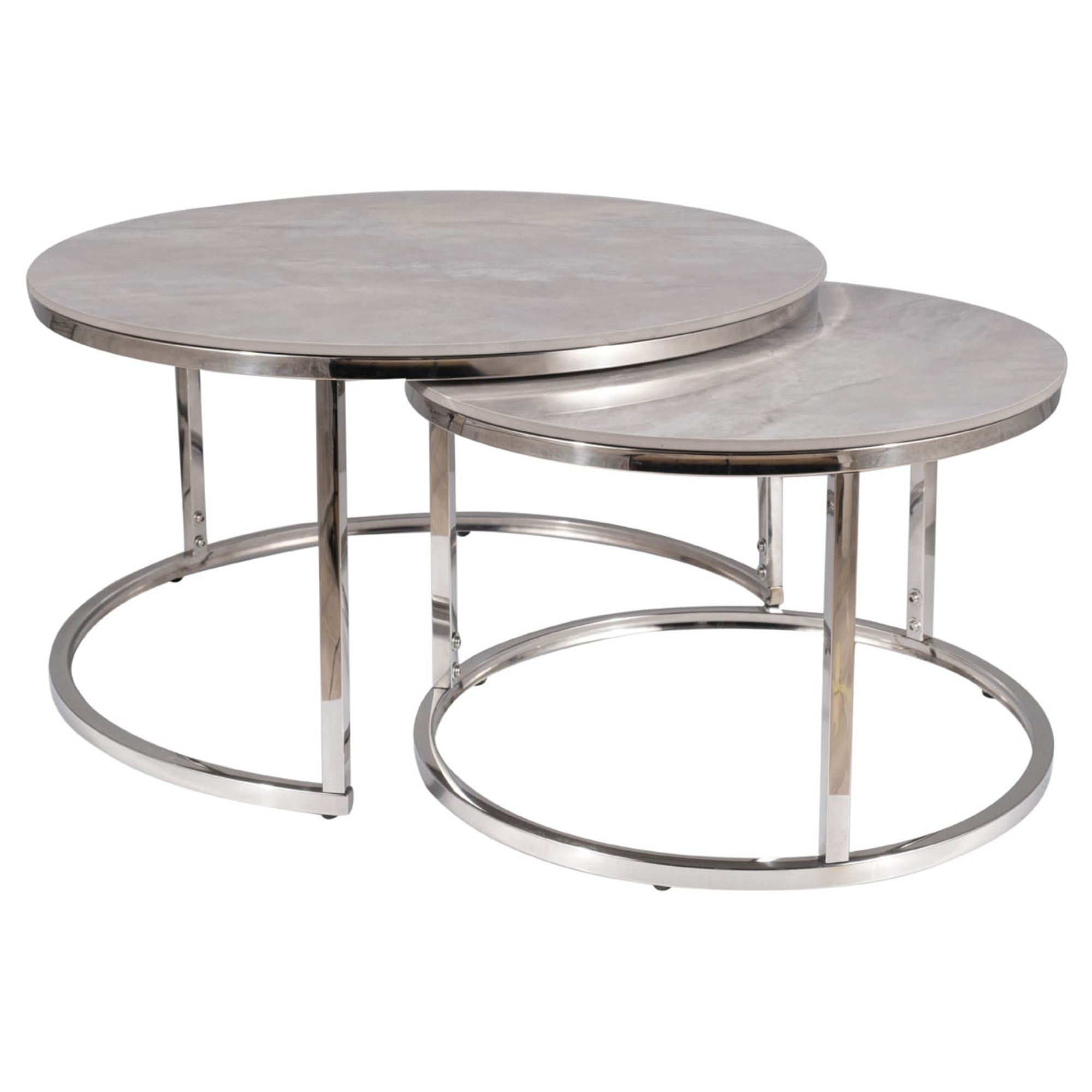 Kruhové odkladacie dosky sú vyrobené z keramiky. Ladené sú do dekora mramoru, ktorý interiéru prepožičia punc luxusu. Maximálnu stabilitu zaisťuje kovová konštrukcia. Odlišná veľkosť stolíkov umožňuje zasunúť menší stolík pod väčší, čím v prípade potreby ušetríte cenné miesto.