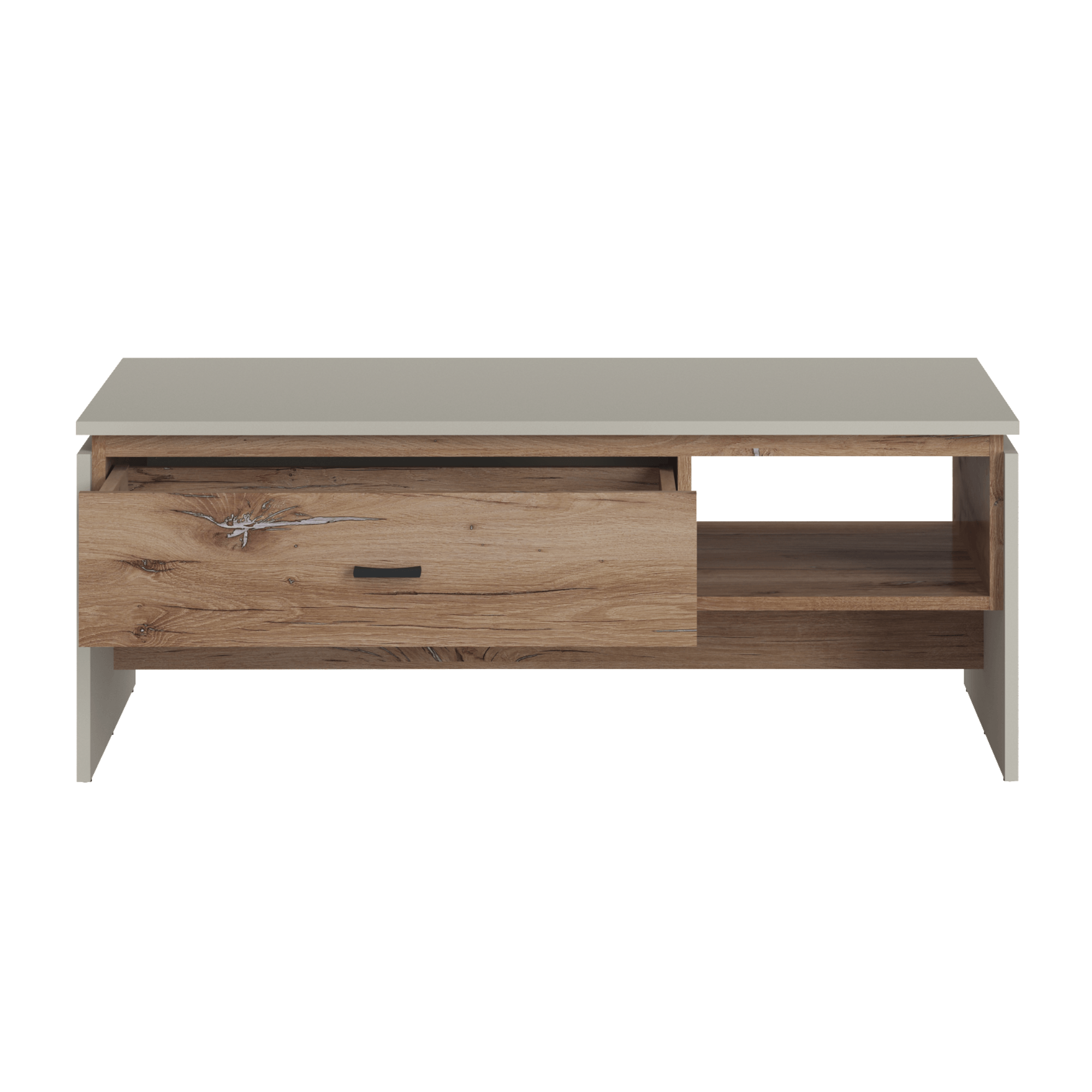 Vyrobený je z laminovaného dreveného materiálu, pre ktorý je typická jednoduchá udržiavateľnosť aj dlhá životnosť. Hlavná odkladacia plocha je doplnená o dodatočný úložný priestor v podobe jednej priestrannej zásuvky a bočnej otvorenej sekcie vedľa nej. Kontrastné farebné vyhotovenie, v ktorom sa stretáva sivá s dekorom duba tmavého, navyše domácnosti vdýchne dojem prírody.