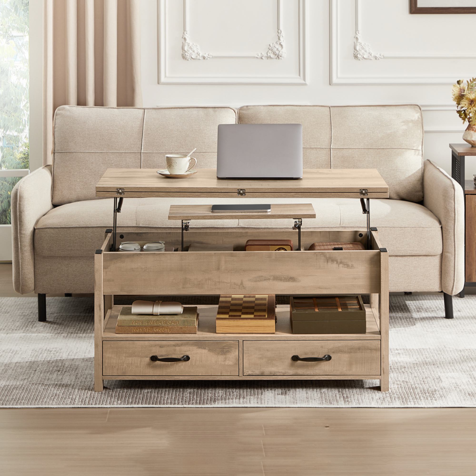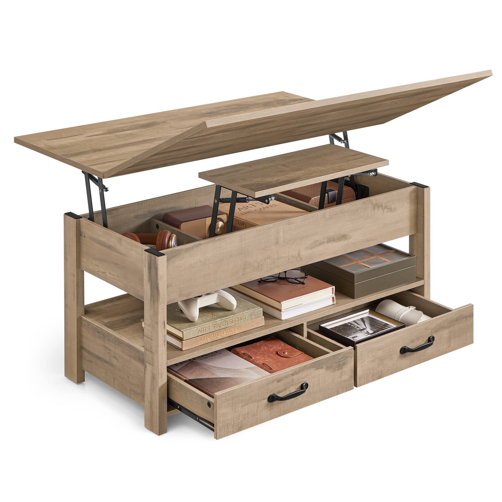 Jeho súčasťou sú nielen 2 zásuvky, ktoré sú pre ľahšiu manipuláciu vybavené rúčkami, ale aj 3 priehradky umiestnené pod hornou doskou. Pod hornou doskou sa nachádza aj malá vnútorná nastaviteľná plocha. Stolík je výškovo nastaviteľný v rozmedzí 50-65 cm.