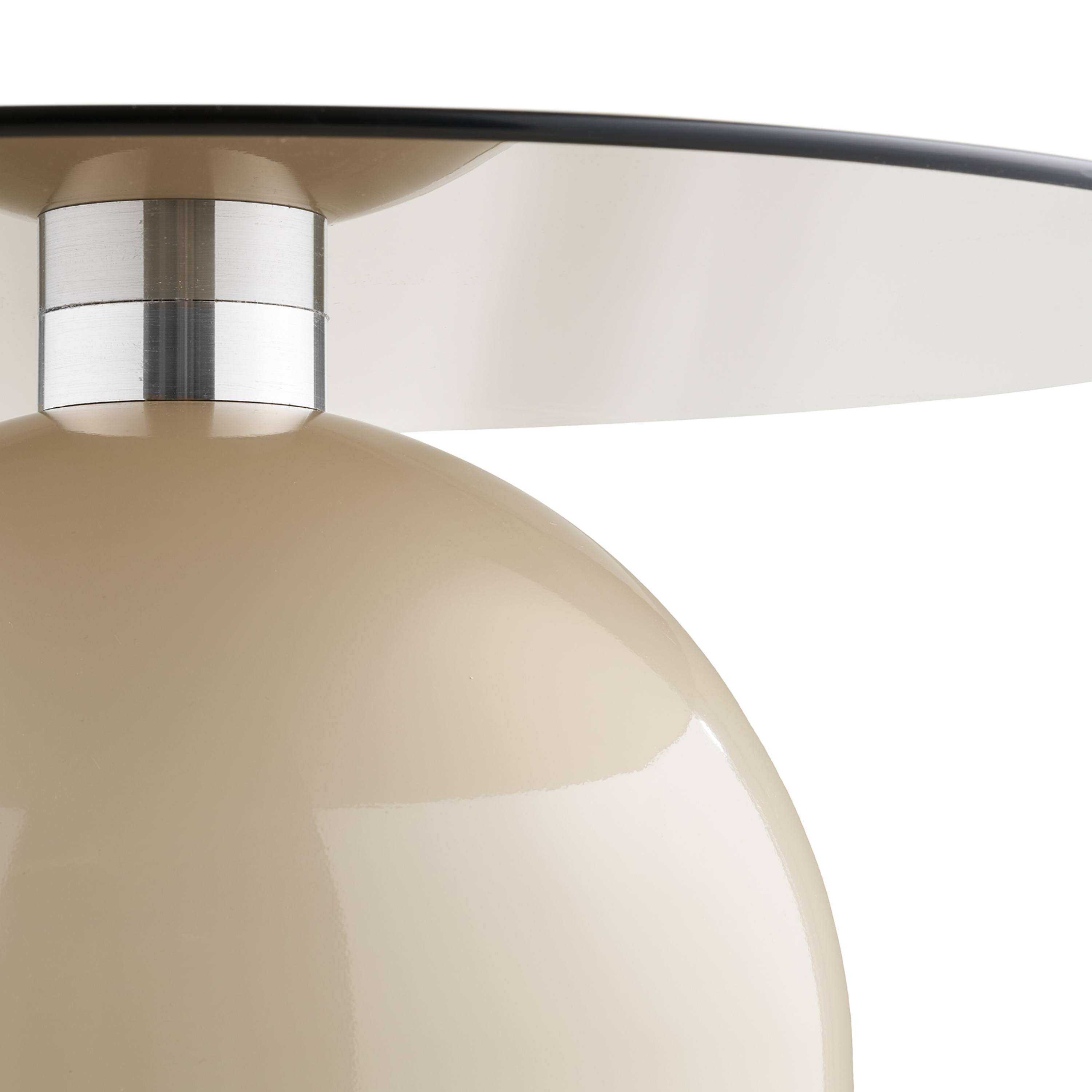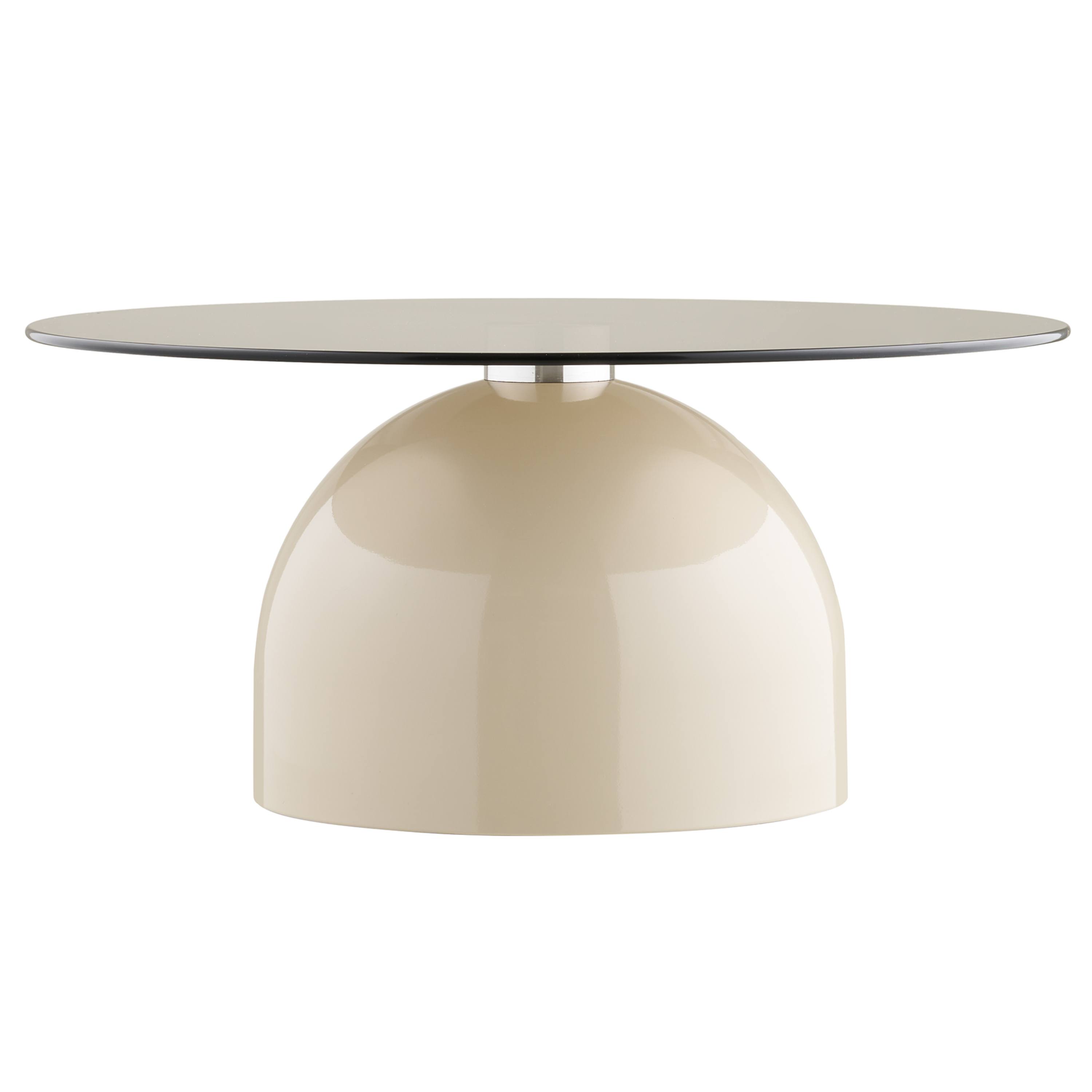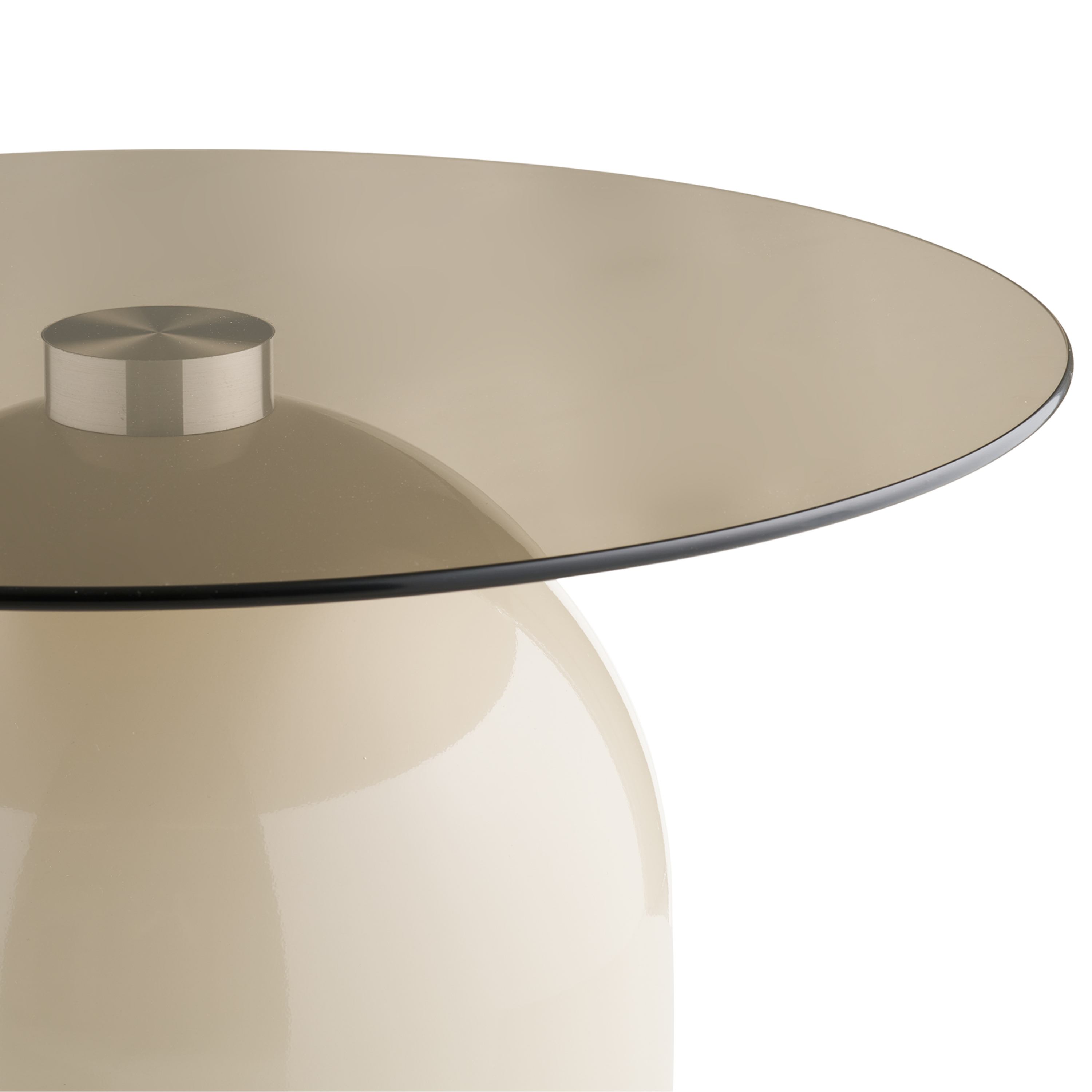 Kombinácia okrúhlej dosky a plného podstavca v jemnom béžovom odtieni pôsobí elegantným a harmonickým dojmom, zatiaľ čo dymové sklo dodáva celku ľahkosť a vizuálny kontrast. Veľkorysá kruhová plocha ponúka dostatok miesta na servírovanie kávy, dekorácie aj obľúbené knihy. Stabilná centrálna podnož zabezpečuje pevnú oporu a vyvážený vzhľad, vďaka čomu stolík pôsobí kompaktne a zároveň veľmi sofistikovane. Stolík je vyrobený z temperovaného skla a kovu, čo mu dodáva odolnosť, moderný charakter a umožňuje jednoduchú údržbu.