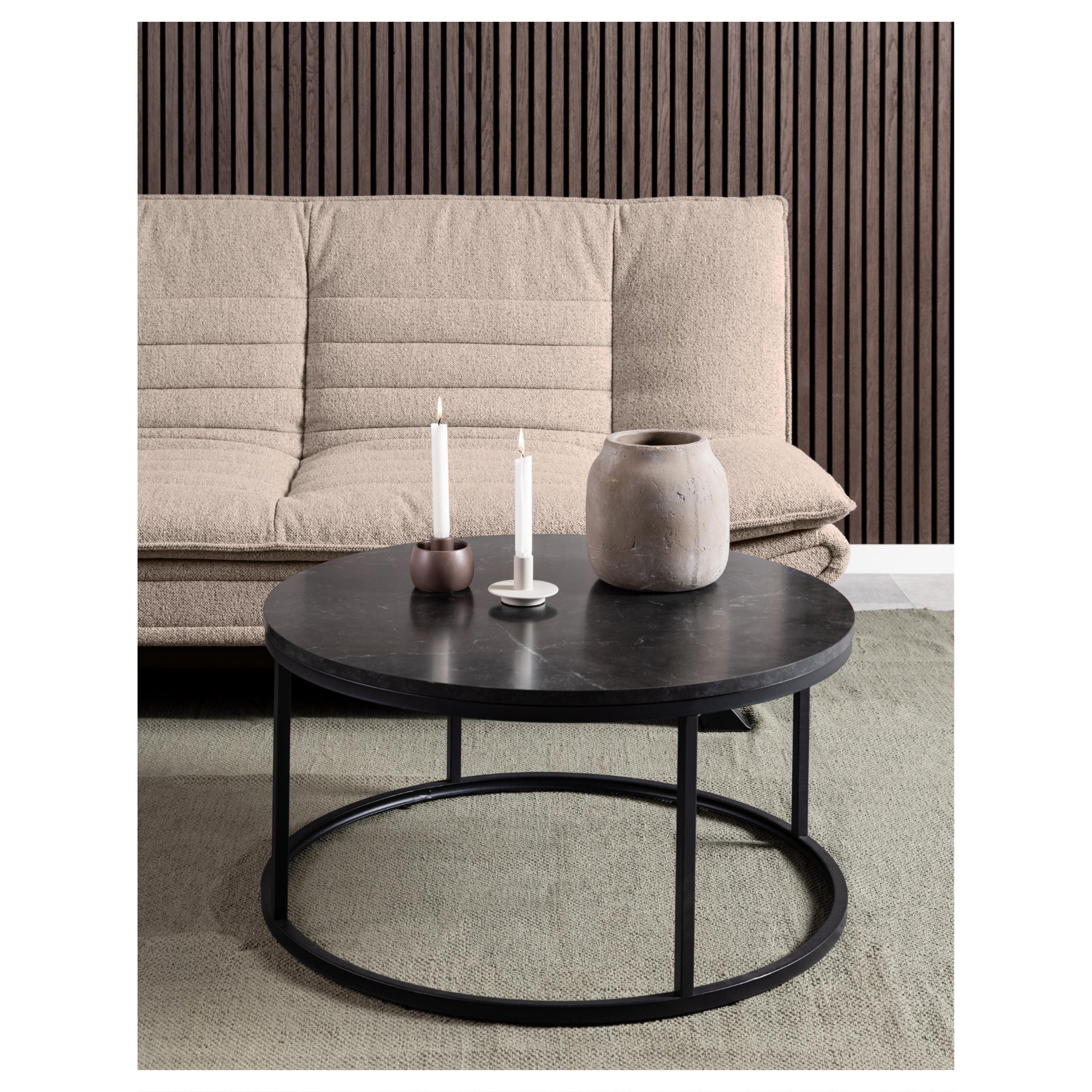 Vďaka výraznej okrúhlej doske a ladiacej okrúhle základni dodá konferenčný stolík SPIRO vášmu domovu moderný nádych a zároveň ho obohatí o praktický kus nábytku. Dekor mramoru v kombinácii s pevnou kovovou podnožou jednoducho zapadne do mnohých rôznych interiérov. Podnož je navyše doplnená o plastové klzáky chrániace podlahu pred poškodením. Vzhľadom k použitým materiálom sa vám bude stolík ľahko udržiavať v čistote.