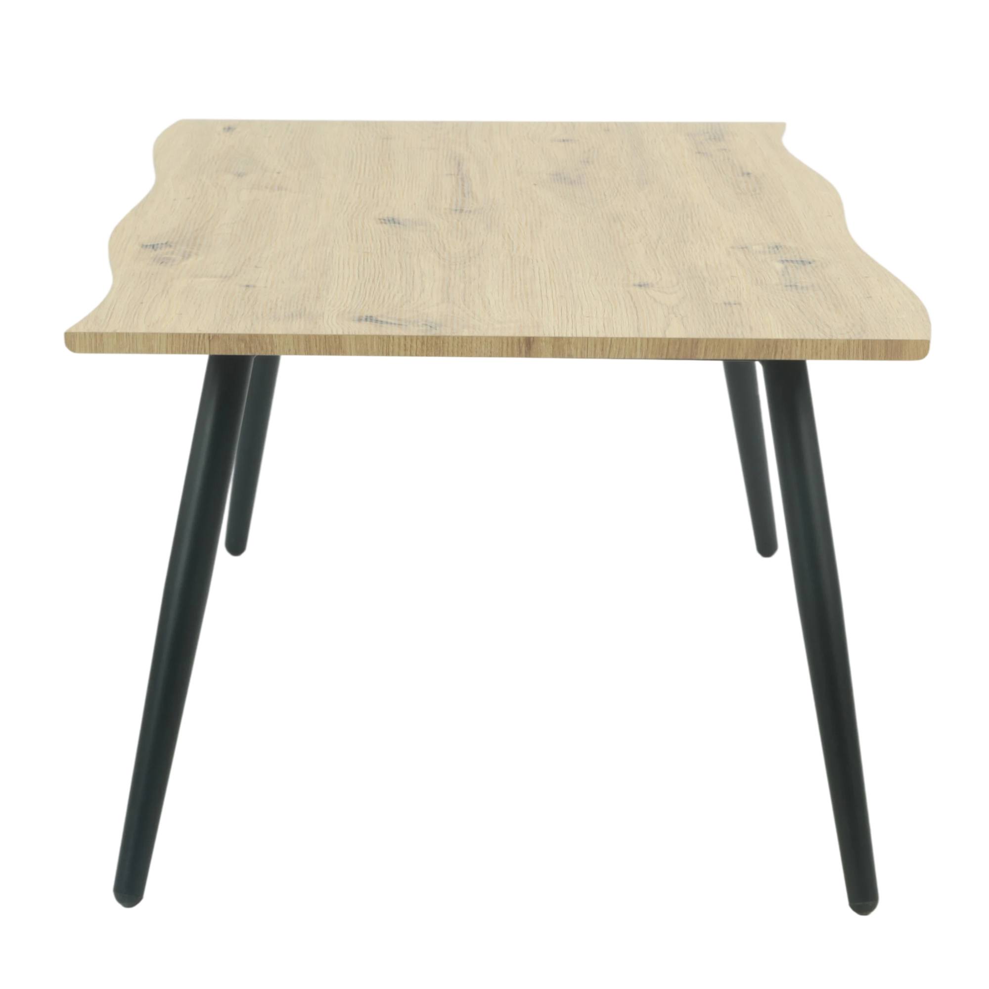 O stabilitu tohto stola sa starajú jeho pevné kovové nohy. Horná doska je z laminovaného dreveného materiálu.