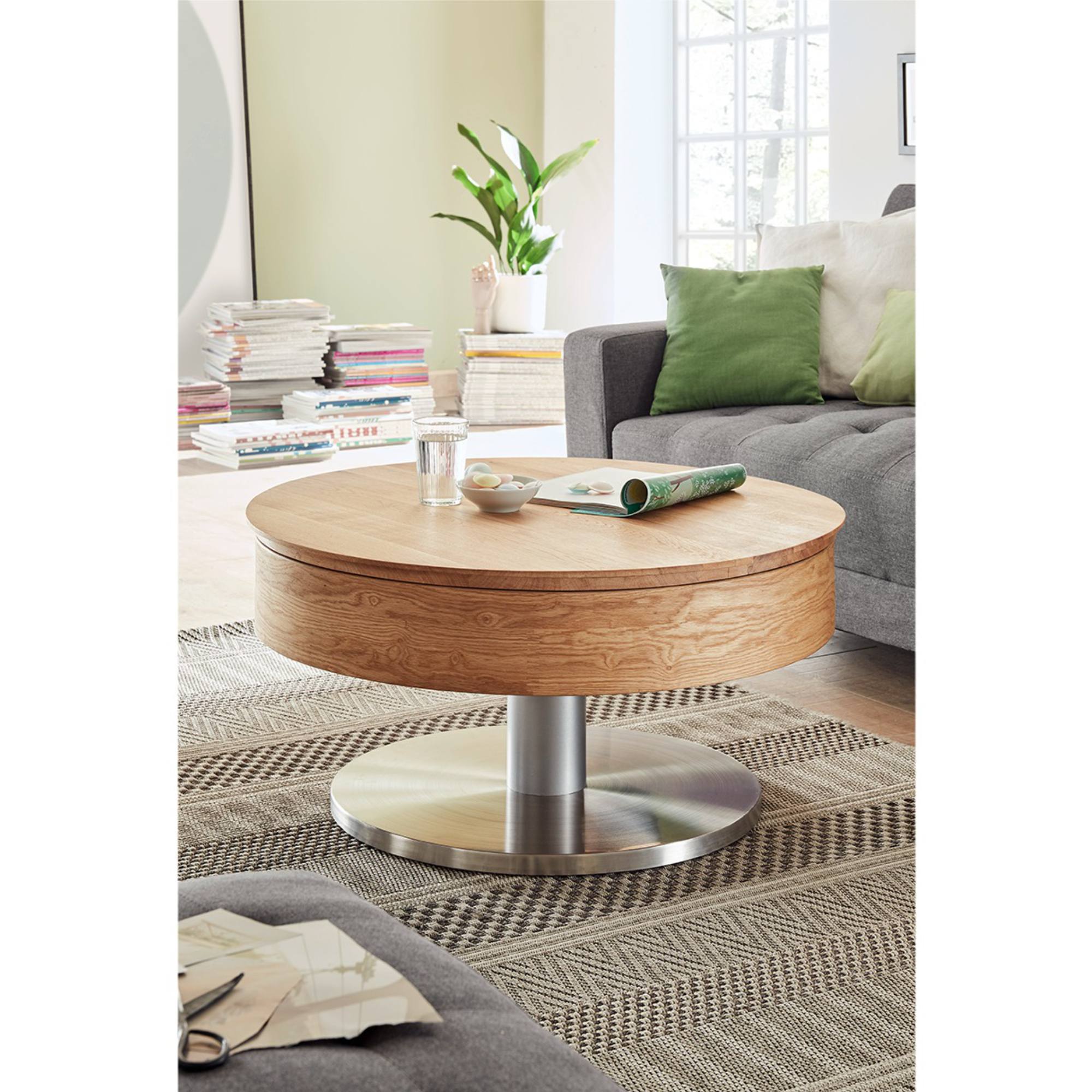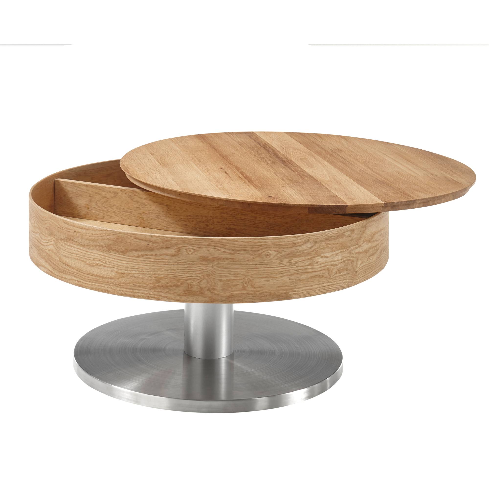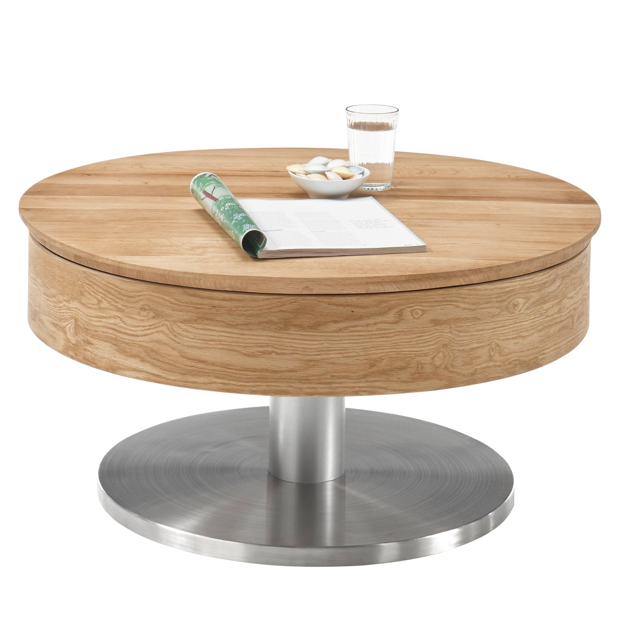 Moderný konferenčný stolík SUDI narobí veľa parády v každej domácnosti. Horná otočná a snímateľná doska je vyrobená zo sukovitej dubovej dyhy a ošetrená olejom, ktorý zvyšuje pevnosť aj životnosť. Stredový stĺpik v kovovom dekore sa spája s veľkou základňou z MDF materiálu, ktorý je potiahnutý kovom a odetý do vzhľadu kefovanej nehrdzavejúcej ocele.
