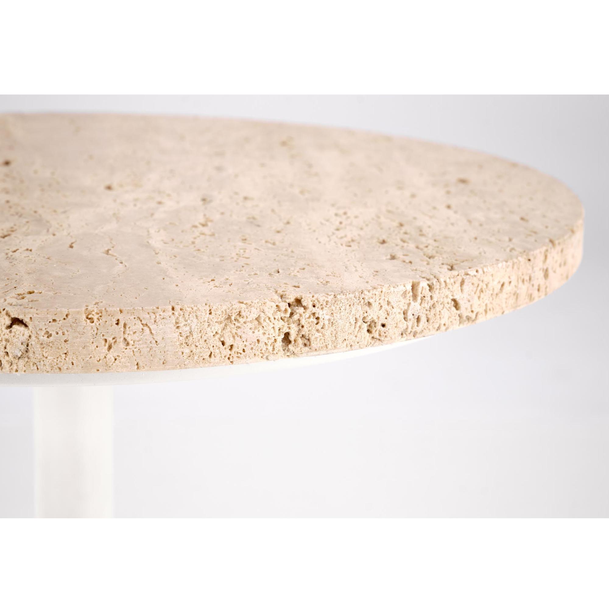 Za svoju stabilitu vďačí stolík pevnej kovovej konštrukcii, ktorá je pokrytá práškovým nástrekom. Horná doska je vyrobená z travertínu.