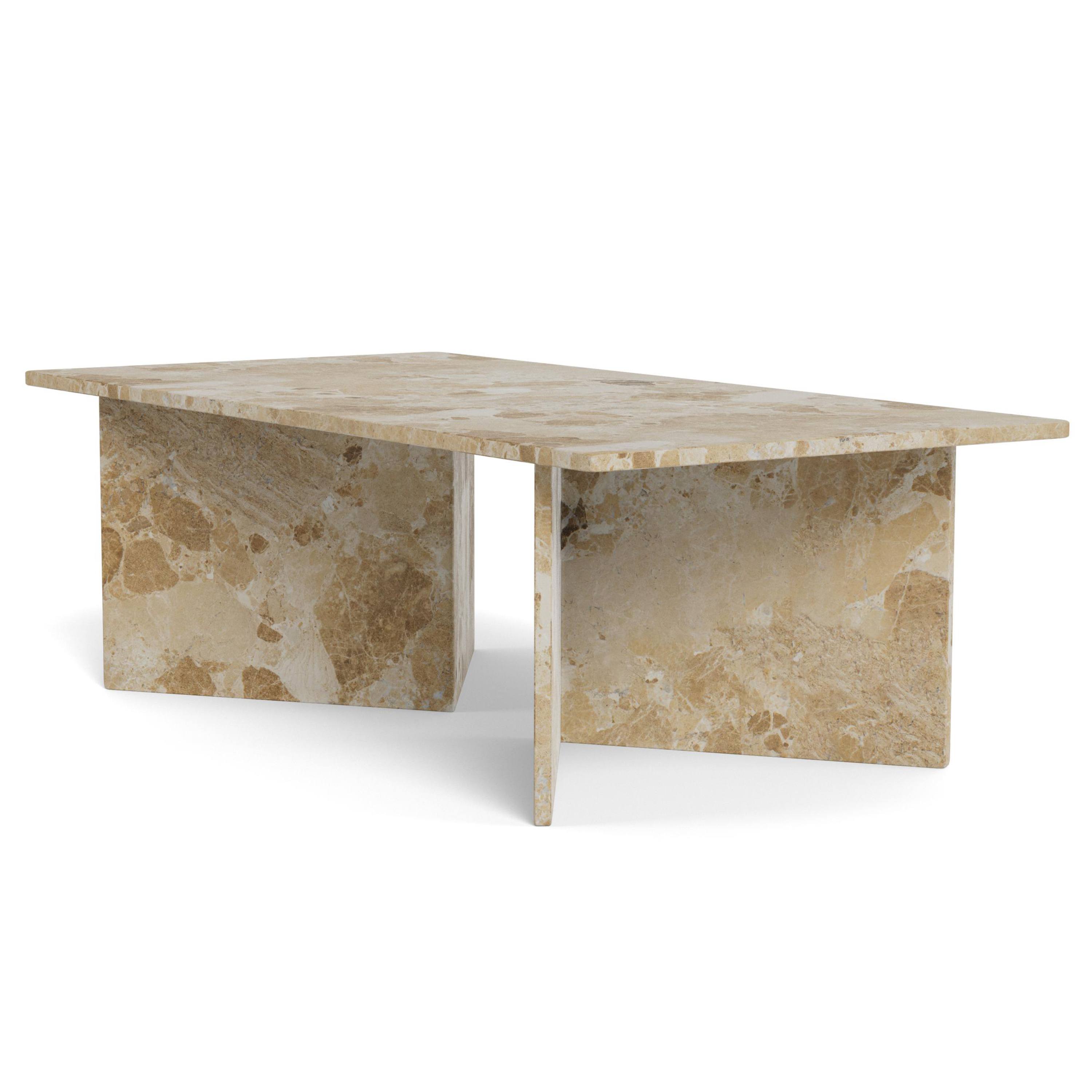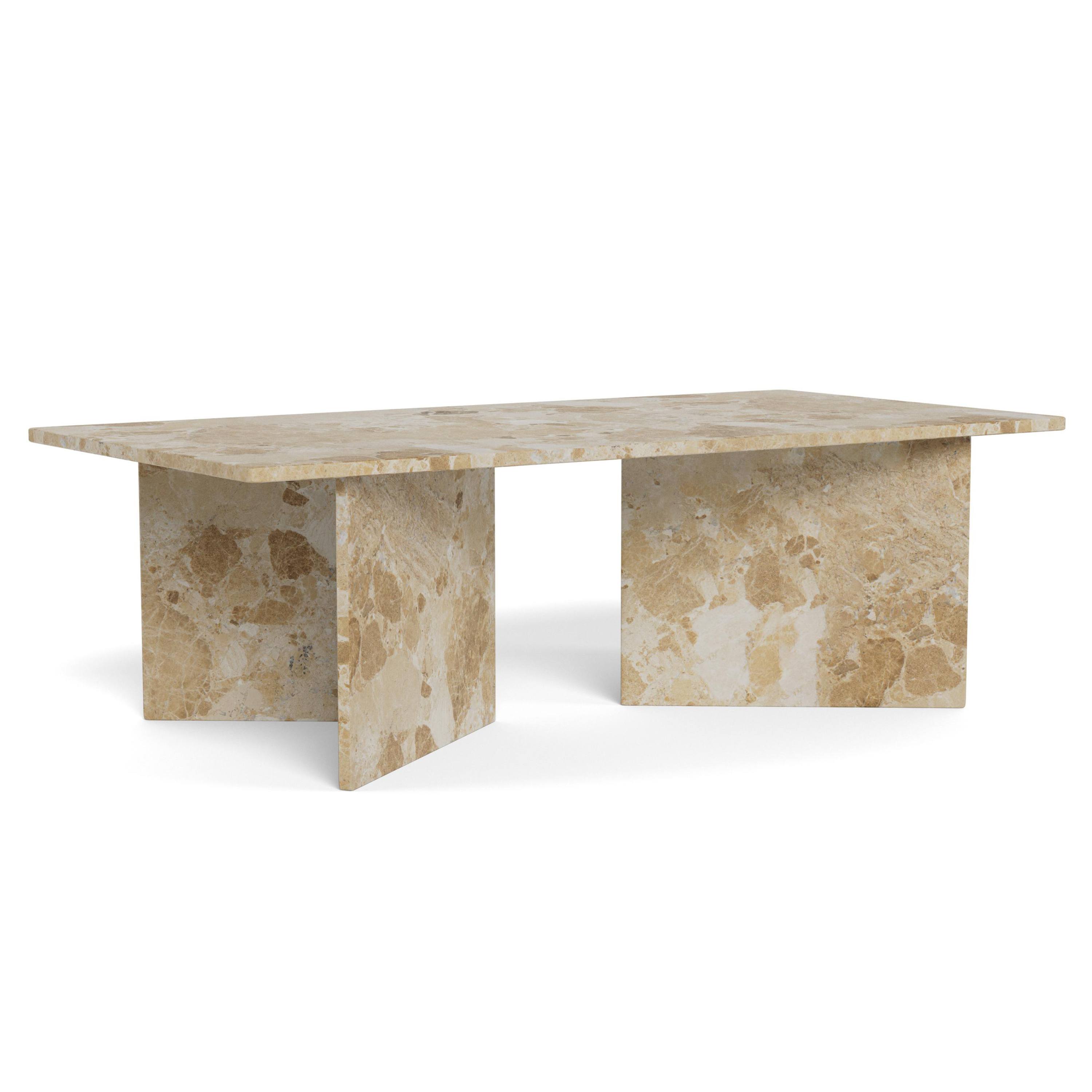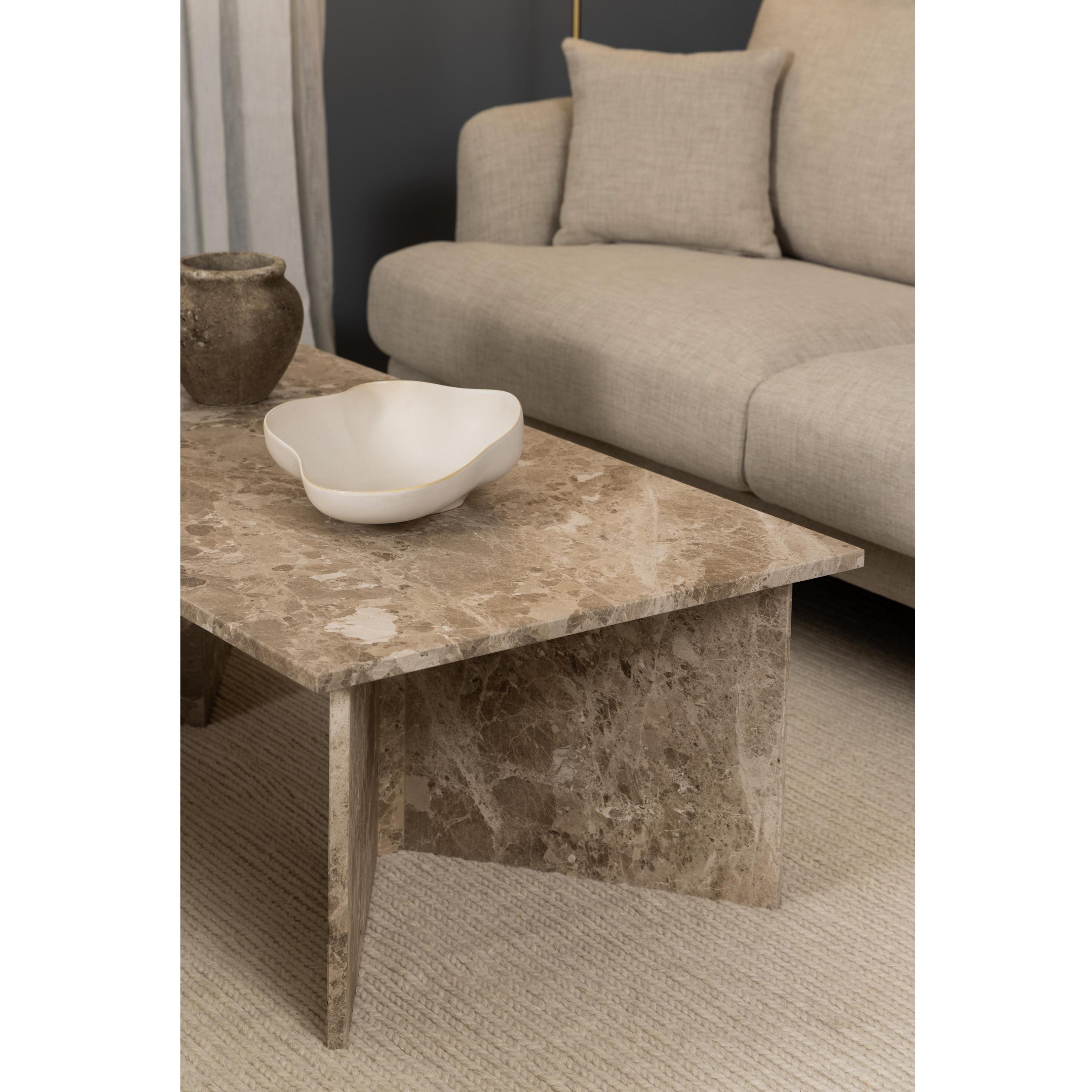Priestranná obdĺžniková doska je uložená na masívnych doskových nohách, ktoré zaisťujú potrebnú stabilitu a vytvárajú robustný dojem. Vďaka výraznej kresbe mramorového dekoru pôsobí stolík nadčasovo a ľahko zapadne do moderných, industriálnych aj klasicky ladených interiérov. Perfektne doplní obývaciu zónu a poskytne dostatok miesta na odloženie kníh, dekorácií či servírovanie občerstvenia.