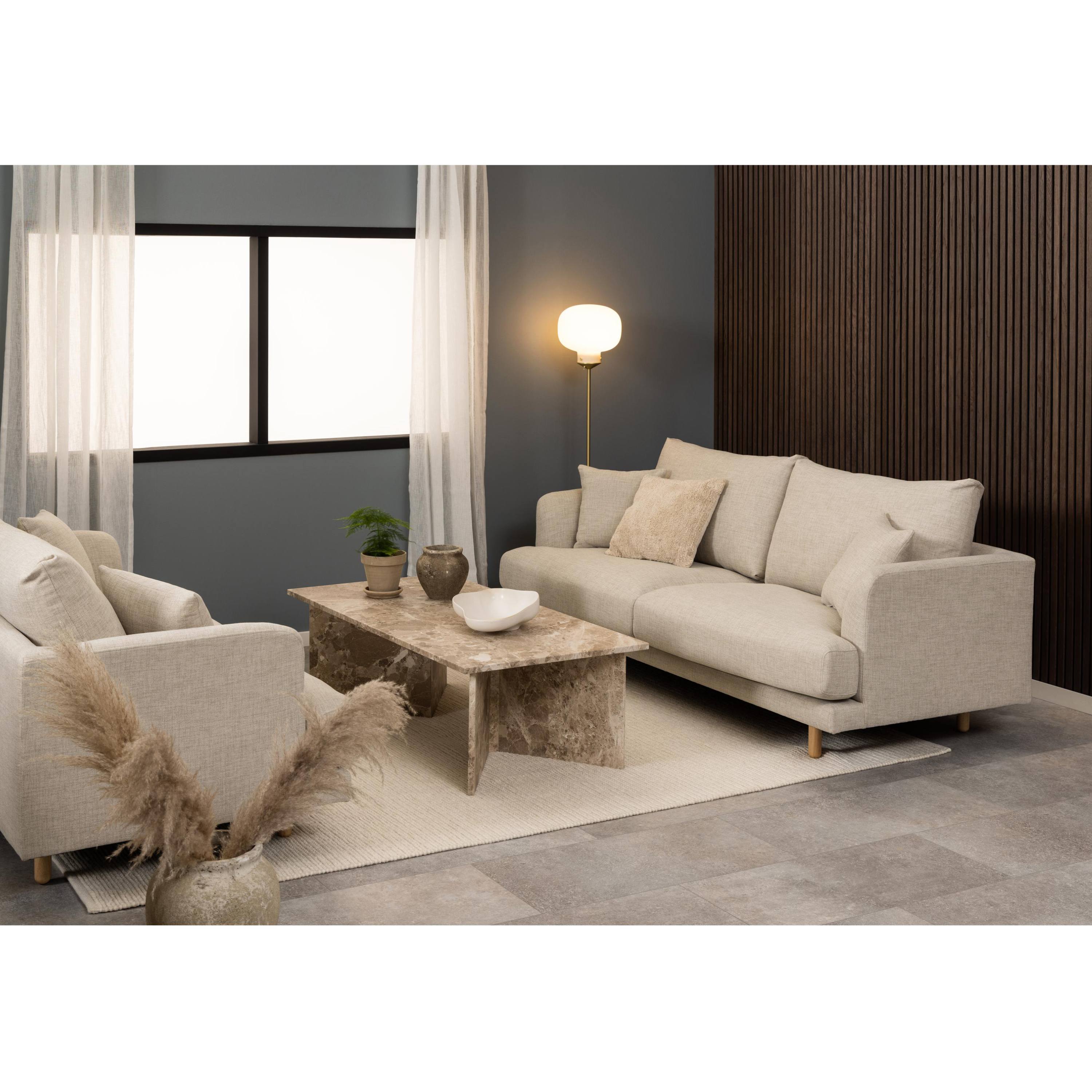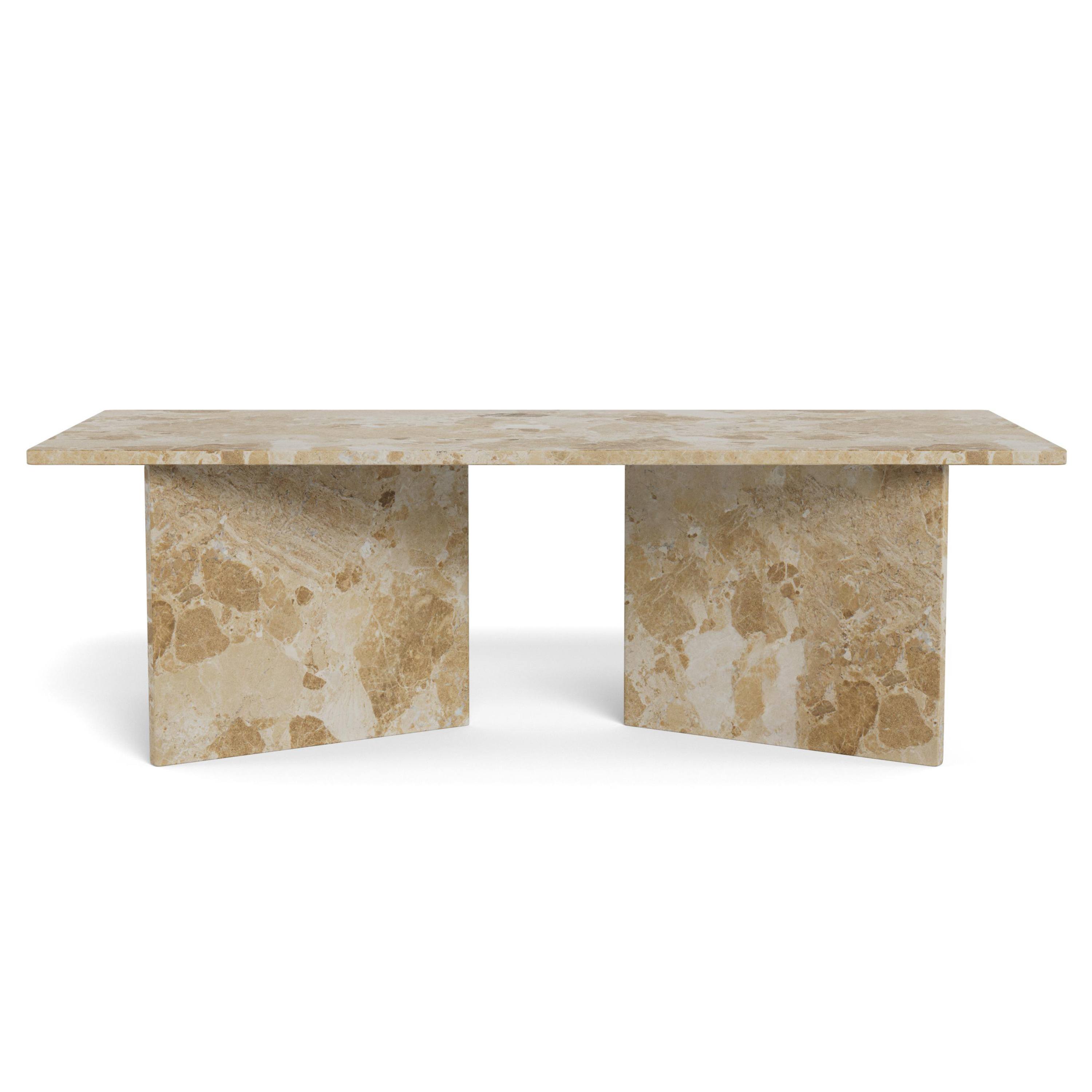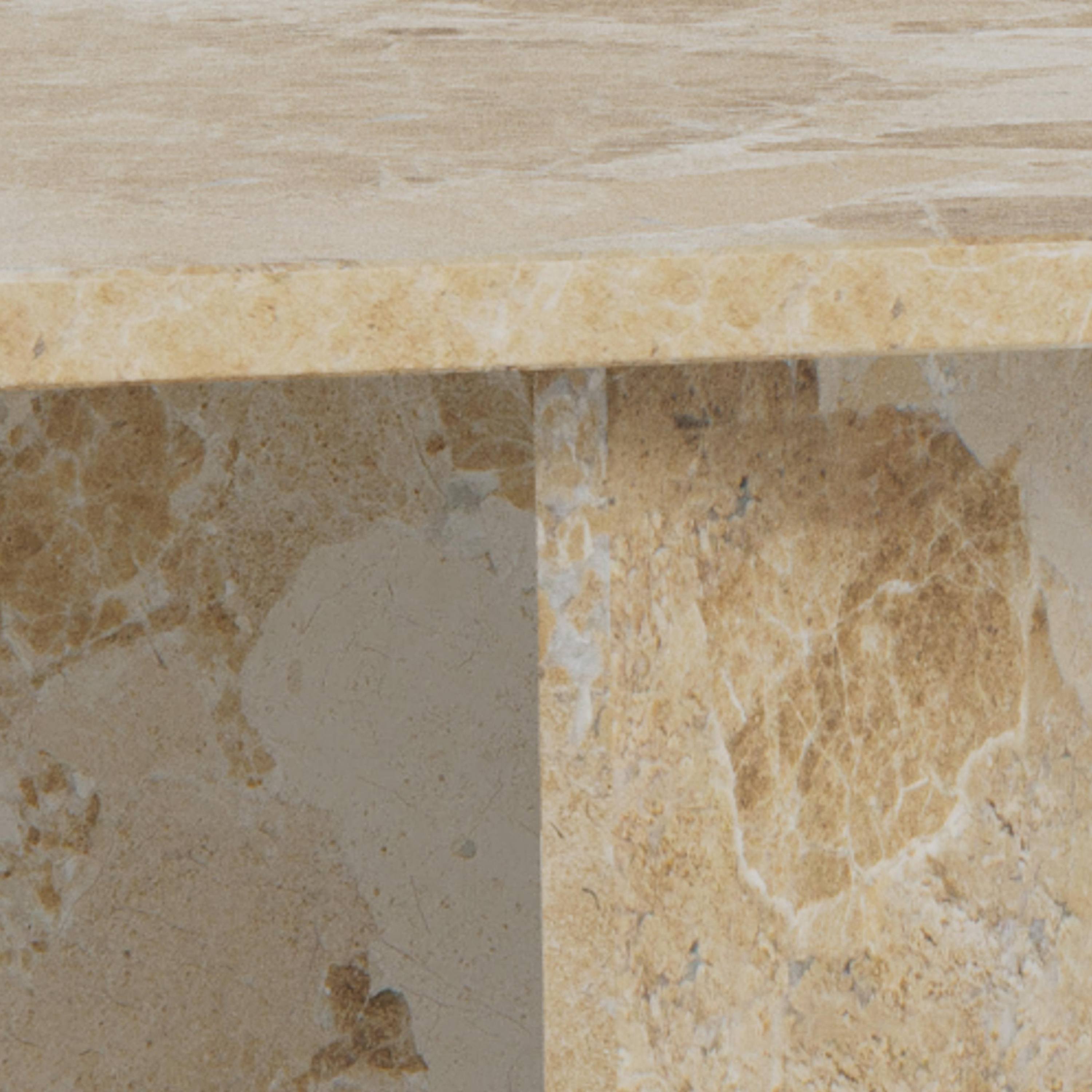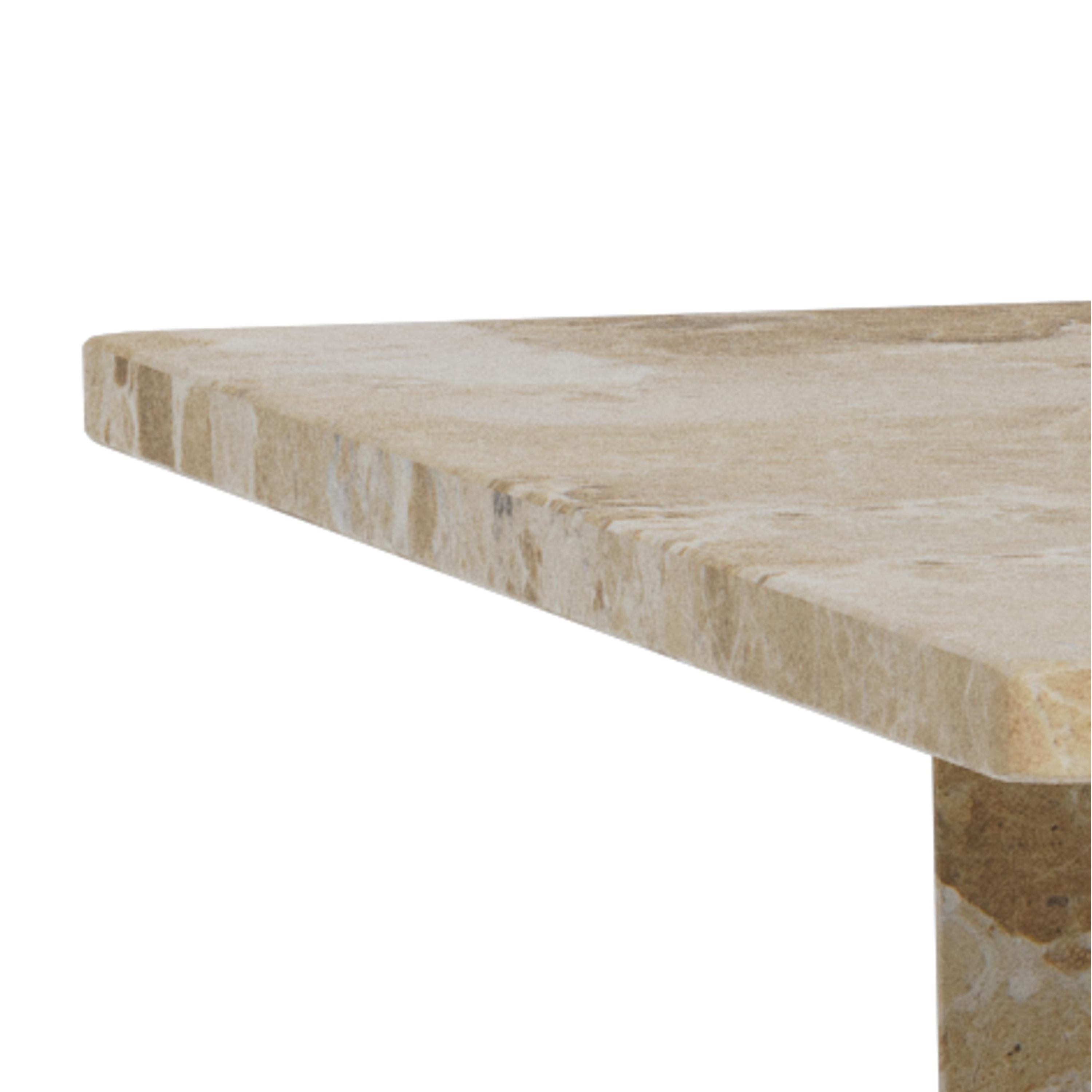 Priestranná obdĺžniková doska je uložená na masívnych doskových nohách, ktoré zaisťujú potrebnú stabilitu a vytvárajú robustný dojem. Vďaka výraznej kresbe mramorového dekoru pôsobí stolík nadčasovo a ľahko zapadne do moderných, industriálnych aj klasicky ladených interiérov. Perfektne doplní obývaciu zónu a poskytne dostatok miesta na odloženie kníh, dekorácií či servírovanie občerstvenia.