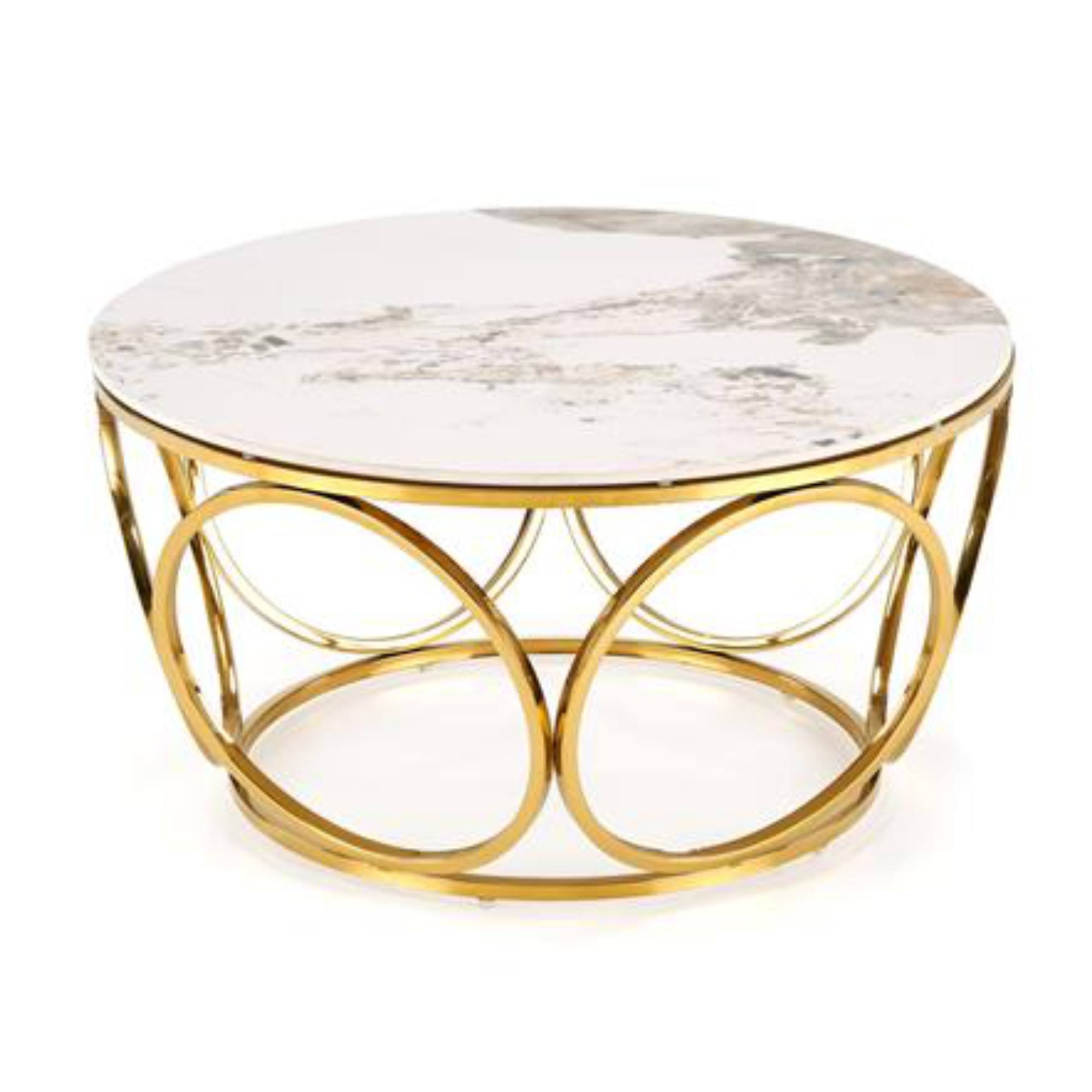 Stolík je z kombinácie spekaného kameňa a kovu, hlavná doska kruhového tvaru je vyrobená v dekore bieleho mramoru, ktorý interiér obohacuje o punc luxusu. Stabilitu obstaráva netradičná podnož z kovu v zlatej farbe.