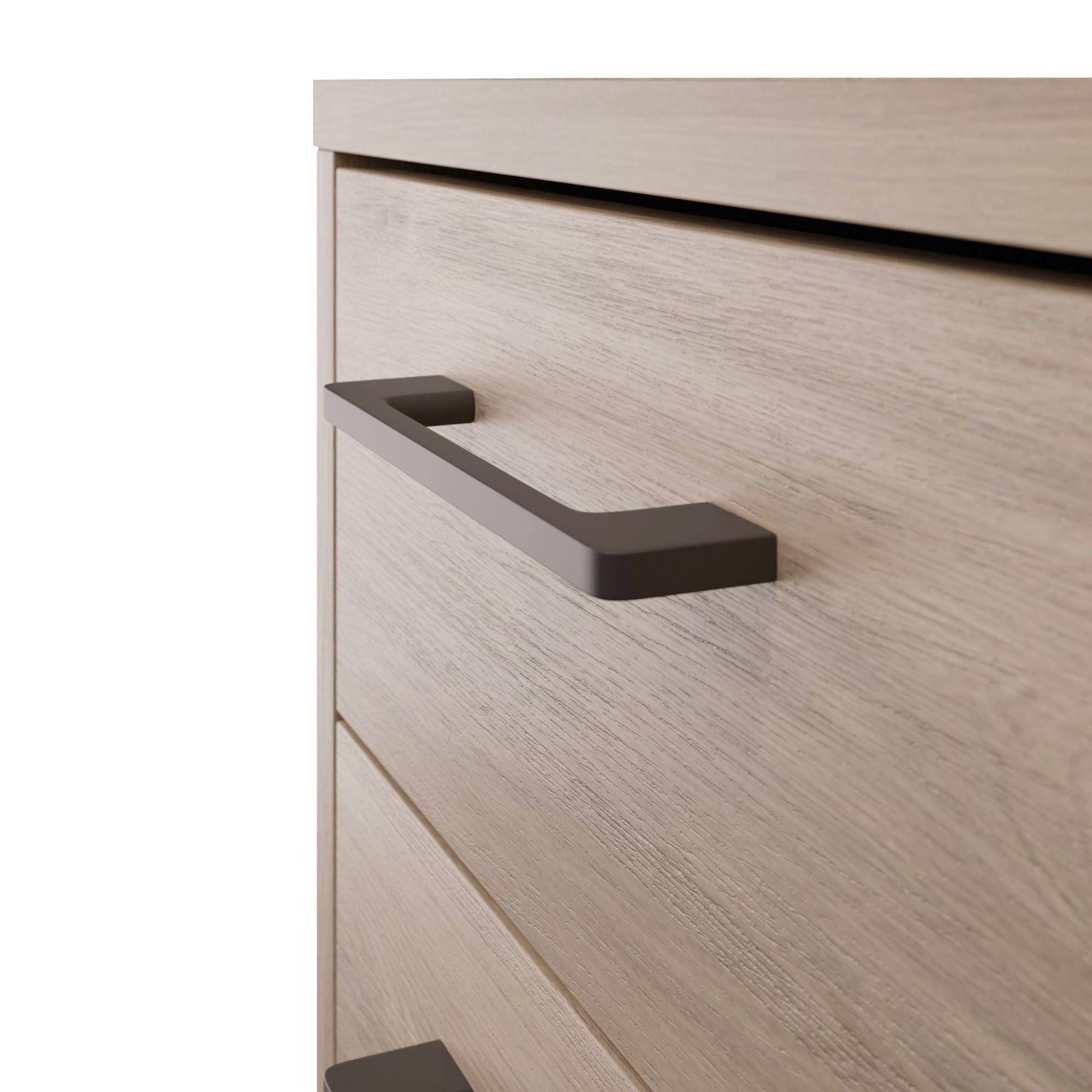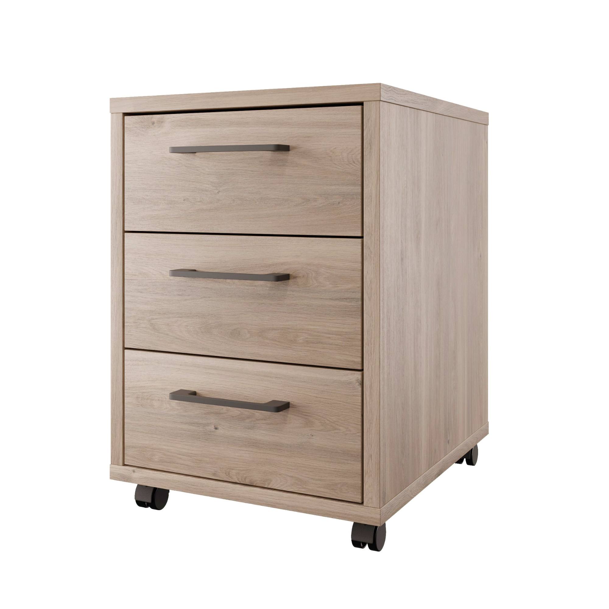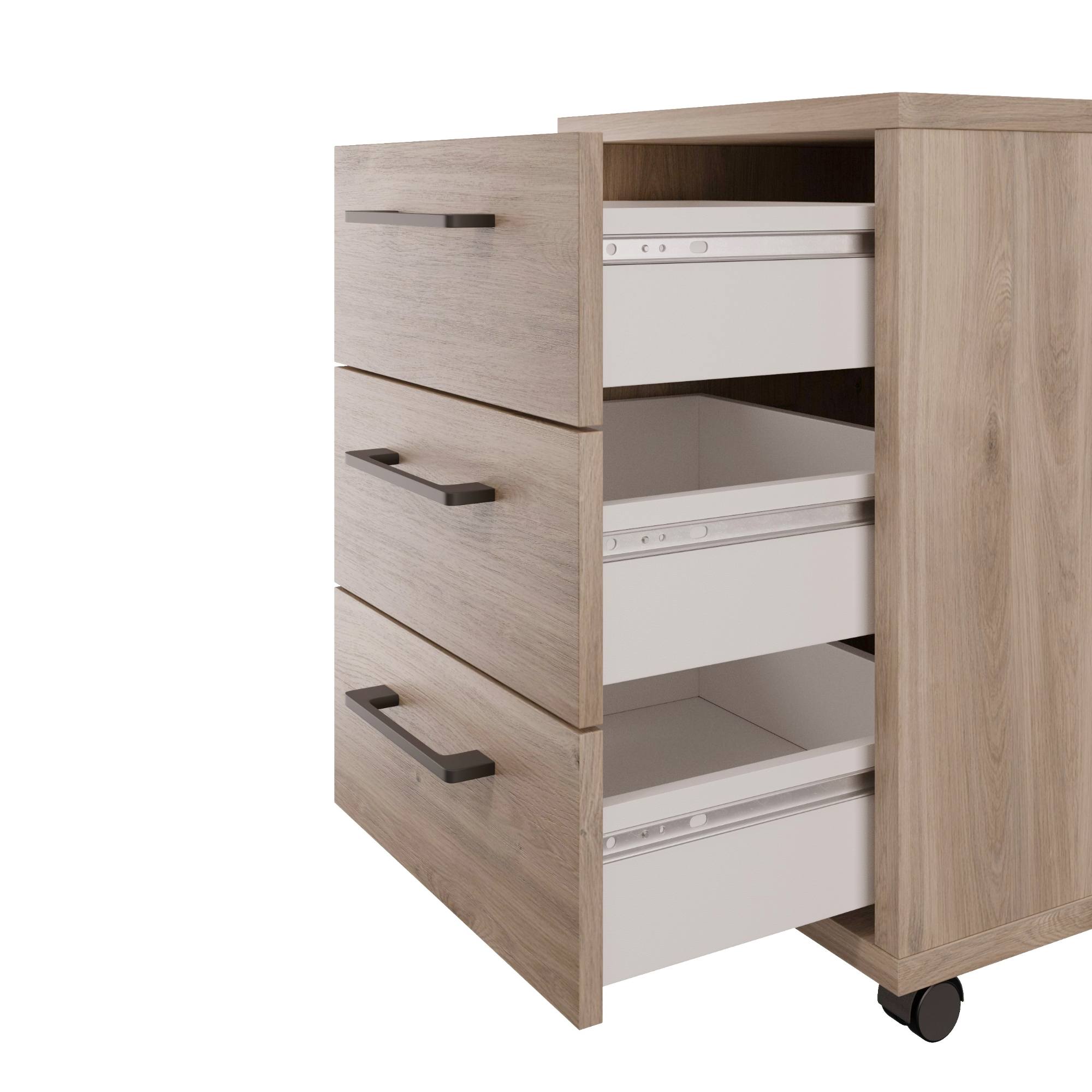 Kontajner disponuje 3 zásuvkami. Aby sa s ním ľahko manipulovalo, je vybavený pojazdnými kolieskami. Kontajner je vyrobený z laminovaného dreveného materiálu, ktorý vyniká ľahkou udržiavateľnosťou, a má čierne rúčky z kovu.