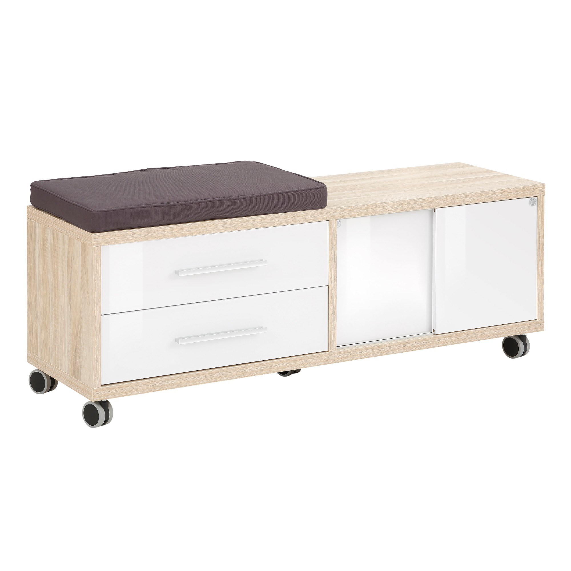 Kontajner MUDDY so šírkou 133 cm je veľmi jednoducho mobilný vďaka 5 kolieskam, ktoré sú vhodné na tvrdé podlahy, ako sú parkety alebo dlažba. Úložný priestor s hĺbkou 40 cm je tvorený 2 zásuvkami so spodnými výsuvmi a tlmeným dovieraním a ďalším úložným priestorom za 2 posuvnými dvierkami. Kontajner tak predstavuje ideálny doplnok k písaciemu stolu MUDDY nielen vďaka úložnému priestoru, ale zároveň vďaka extra miestu na sedenie. Sedák v antracitovej farbe je súčasťou. Povrchovou úpravou korpusu je odolné a na údržbu nenáročné lamino s ABS hranami. Predné strany jednotlivých zásuviek a dvierok, ktoré majú biele alebo sivé farebné vyhotovenie, sú vybavené vrstvou bezpečnostného skla a dotvárajú tak elegantný dojem celého vzhľadu. Kancelárskym nábytkom MUDDY, ktorý je charakteristický kombináciou čistého dizajnu a dobre organizovaného úložného priestoru, ľahko vybavíte akúkoľvek kanceláriu. Jedná sa o nábytok s kovovými rúčkami so zaoblenými hranami. Kontajner je dodávaný v demontovanom stave.