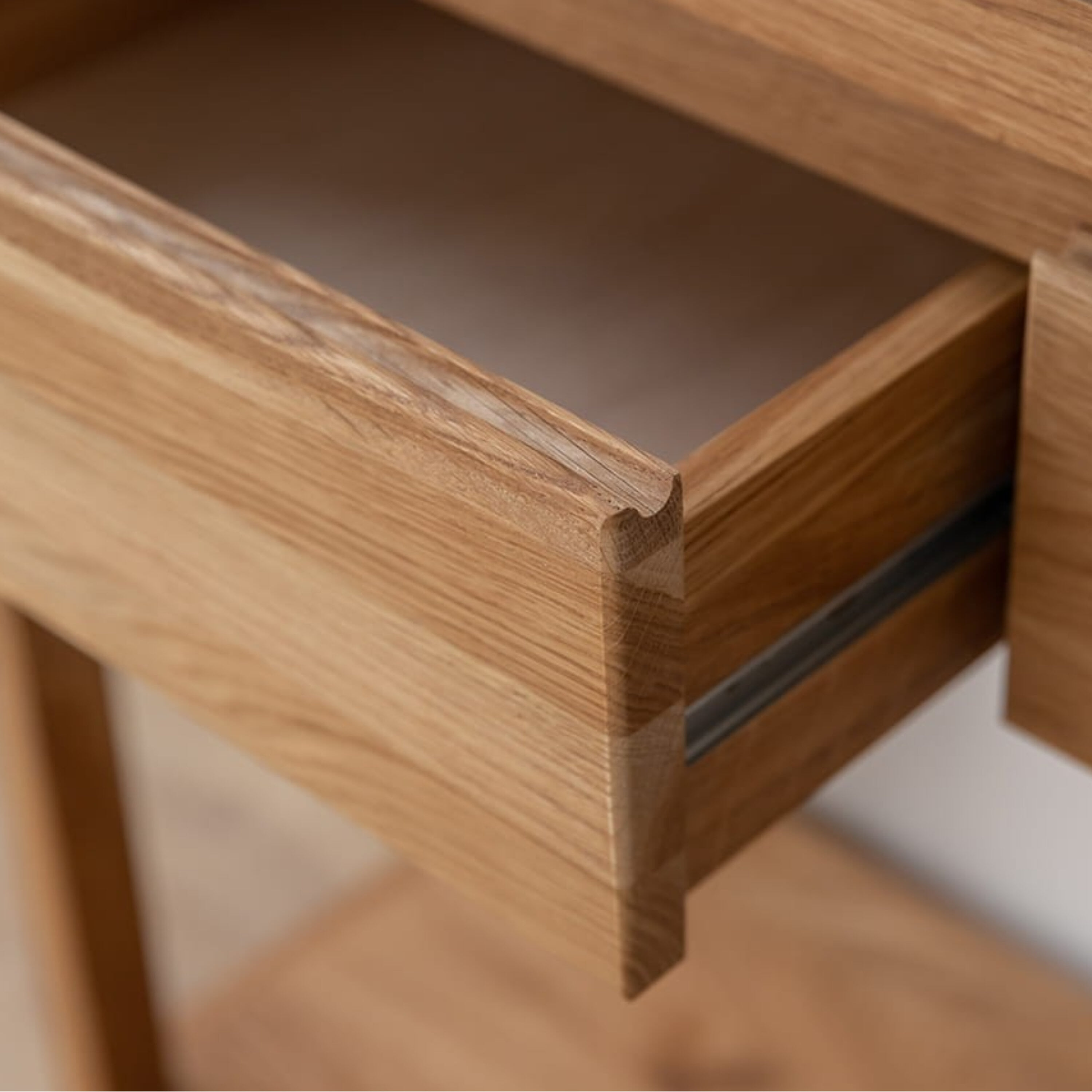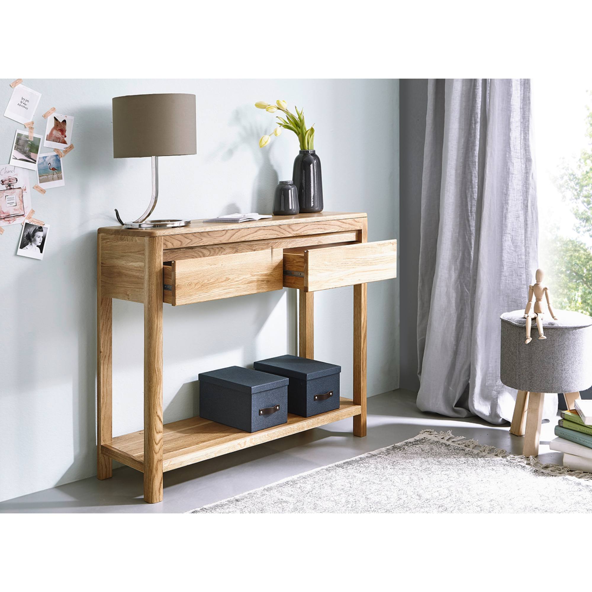 Stolík je vyrobený z masívneho dubového dreva, ktoré je veľmi obľúbené pre svoju pevnosť a odolnosť. Nájdete tu dostatok miesta na uloženie a vystavenie všetkých vašich predmetov, a to vďaka kombinácii priestrannej dosky, zásuviek a spodnej police. Dve praktické zásuvky sa skvele hodia na odloženie dokumentov, kľúčov, ale aj rôznych doplnkov. Pod zásuvkami sa nachádza pevná polica, ktorá vám poskytne priestor na usporiadanie dekoratívnych organizérov alebo košíkov.