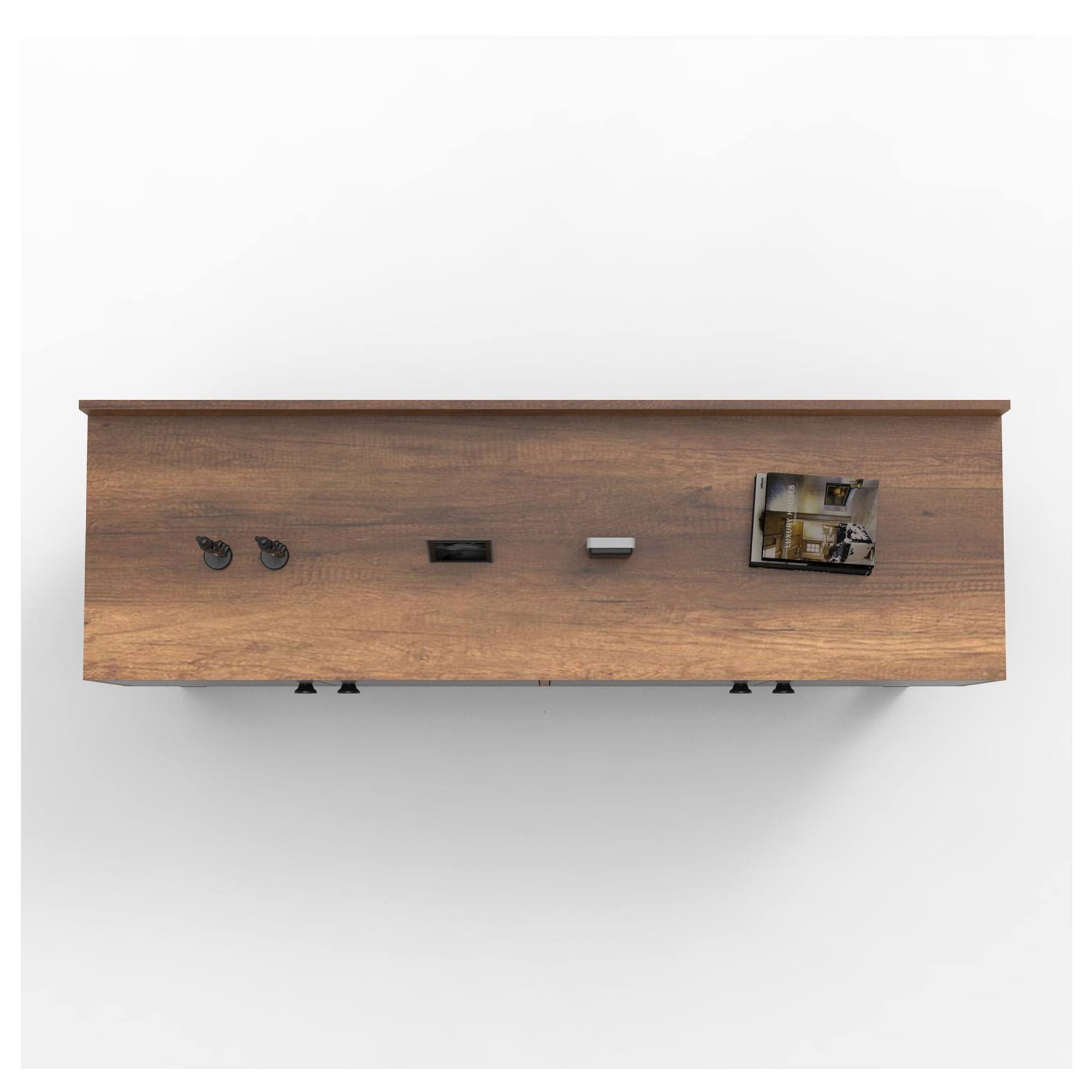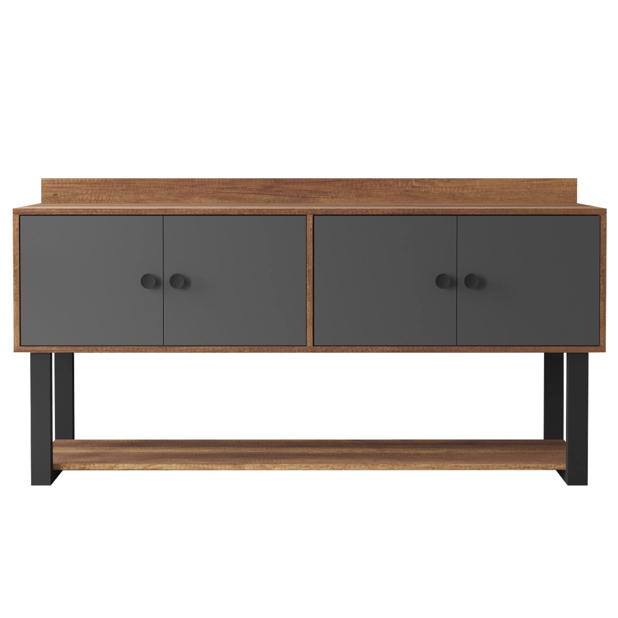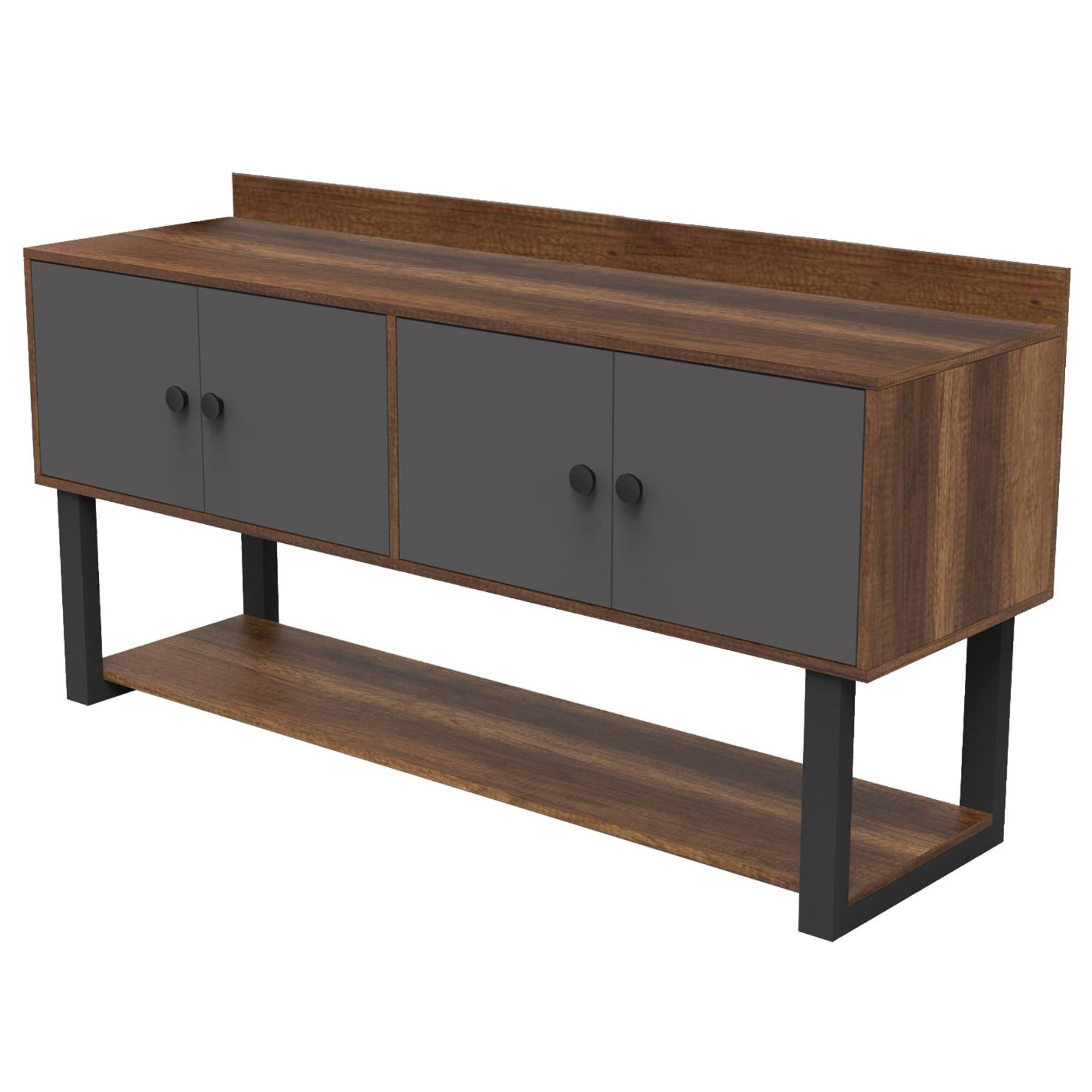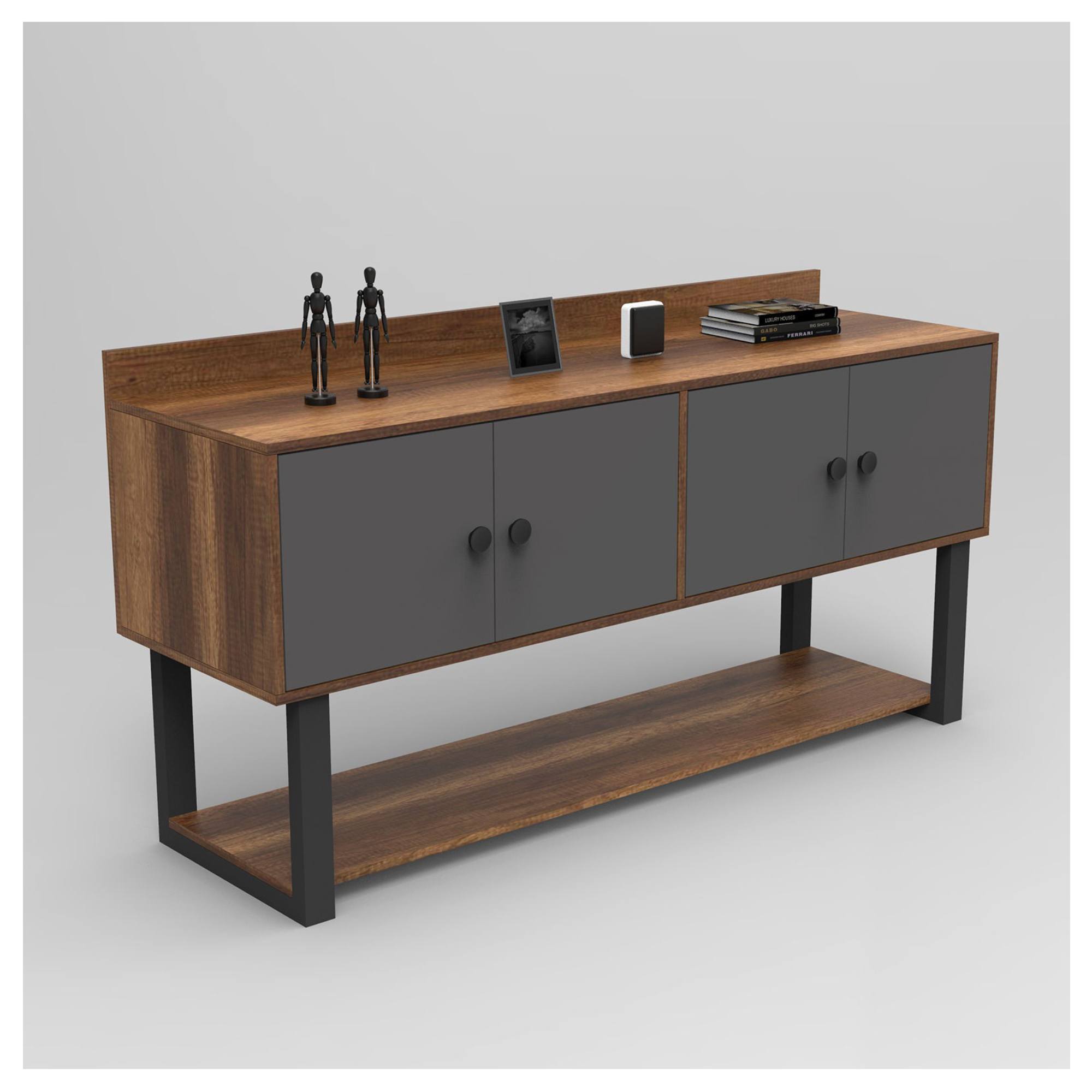 Korpus je vyrobený z laminovanej drevotrieskovej dosky v dekore orech, ktorá sa ľahko udržuje a zároveň dodáva stolíku príjemný prírodný vzhľad. Robustná kovová podnož zaisťuje maximálnu stabilitu a odolnosť. Funkčnosť stolíka oceníte vďaka kombinácii otvoreného a krytého úložného priestoru. Za dvoma pármi dvierok sa nachádza vnútorná polica, ktorá umožňuje uloženie predmetov, ktoré chcete mať po ruke, ale zároveň nie priamo na očiach. Otvorená spodná polica poskytuje praktický priestor na knihy, košíky alebo dekorácie, zatiaľ čo horná doska je ideálna na vystavenie fotografií, kvetov a sviečok.