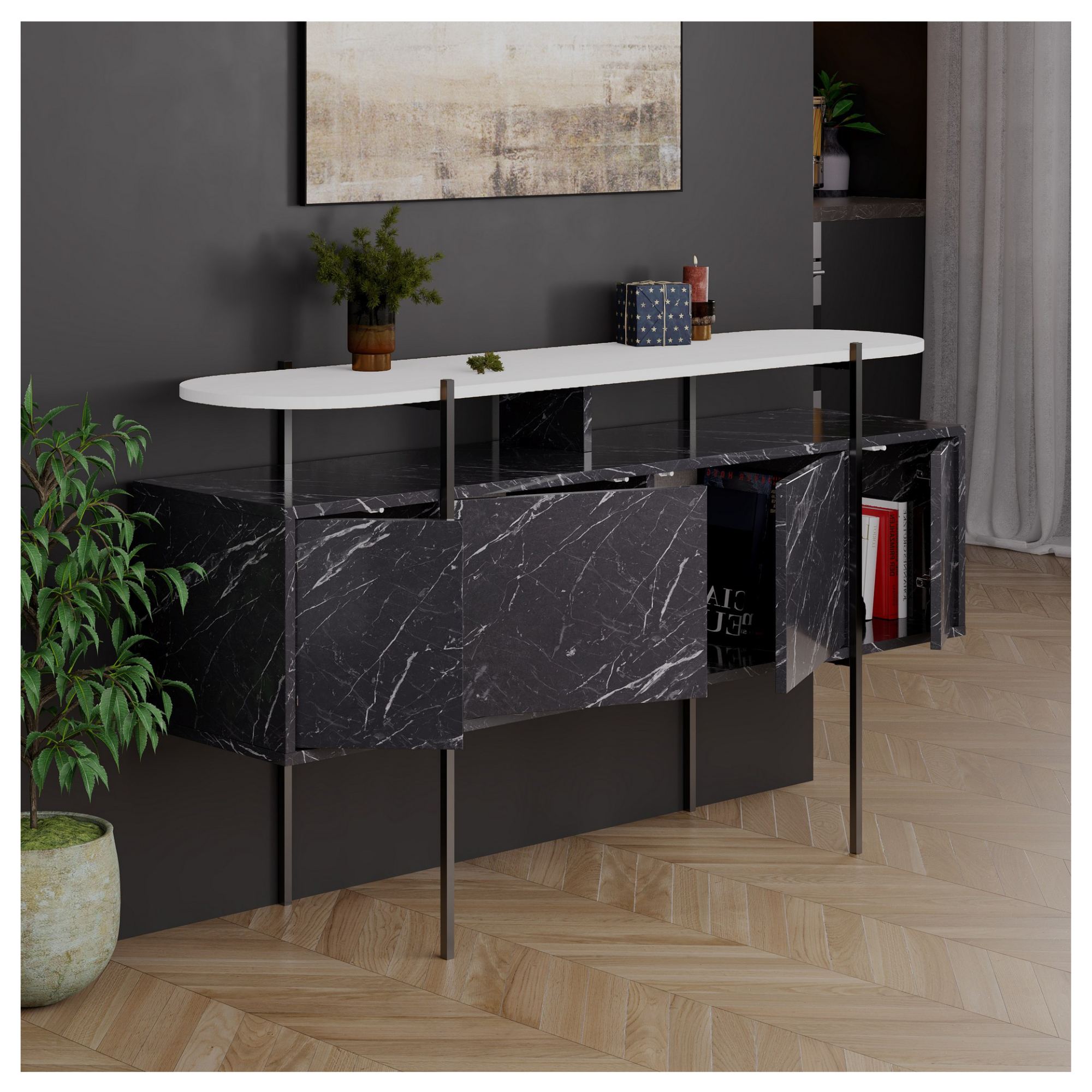 Funkčnosť stolíka HANLEY oceníte vďaka kombinácii otvoreného a krytého úložného priestoru. Dve priestranné horné dosky sú ideálne na vystavenie kníh, kvetov, dekorácií či iných doplnkov, ktoré dotvárajú atmosféru miestnosti. Spodná časť je vybavená 4 dvierkami, za ktorými sa ukrýva dostatok miesta na uloženie všetkého, čo nie je potrebné mať neustále na očiach. Vďaka tomu pomáha stolík udržať poriadok a čistý vzhľad miestnosti.