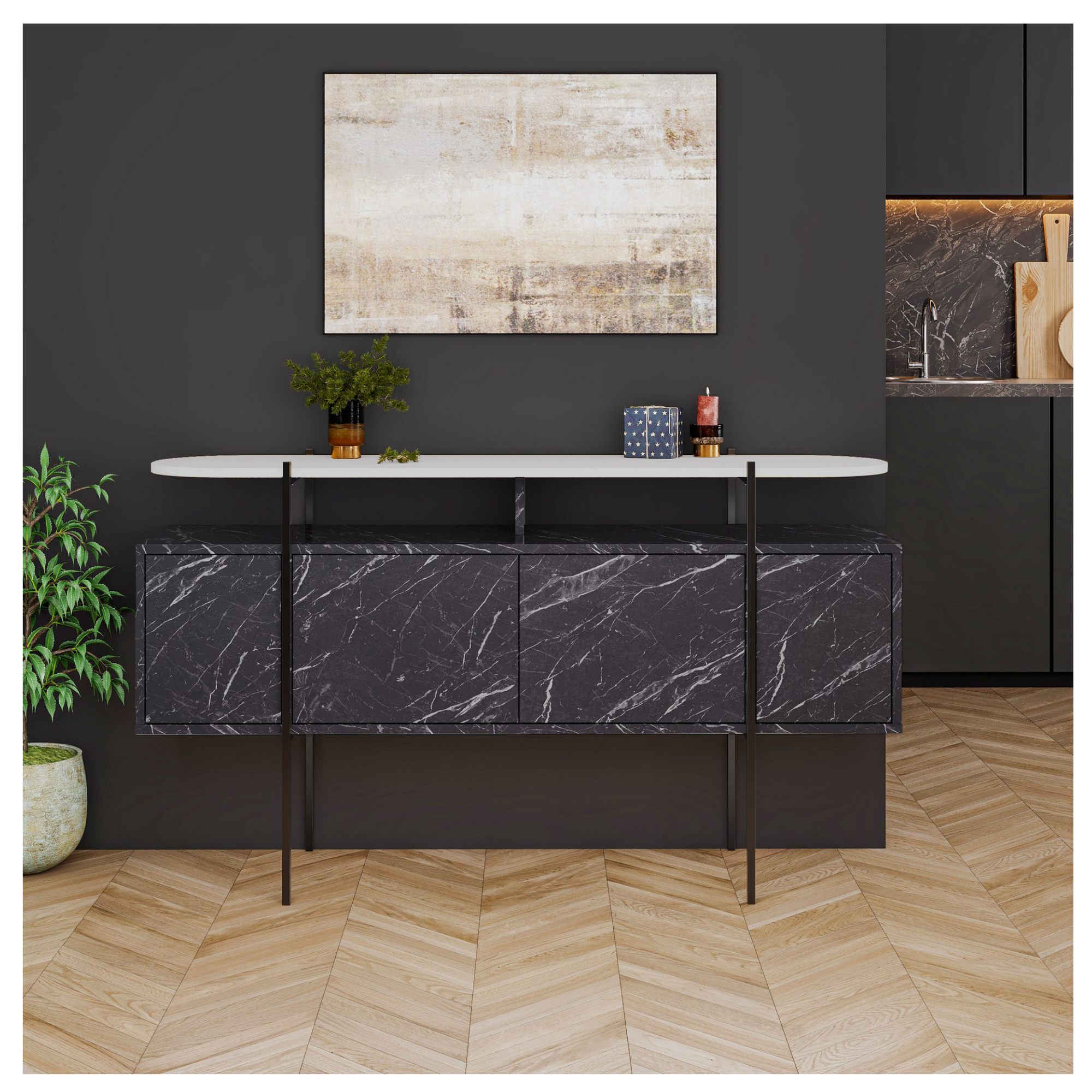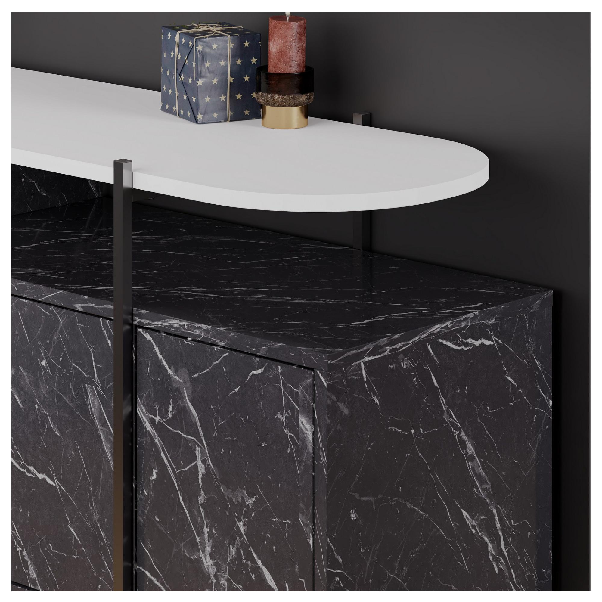 Stolík je vyrobený z drevotrieskovej dosky, ktorá verne imituje mramor s jemným bielym žilkovaním. Stabilitu a pevnosť mu dodáva odolný kovový rám, ktorý zvýrazňuje jeho moderný vzhľad.