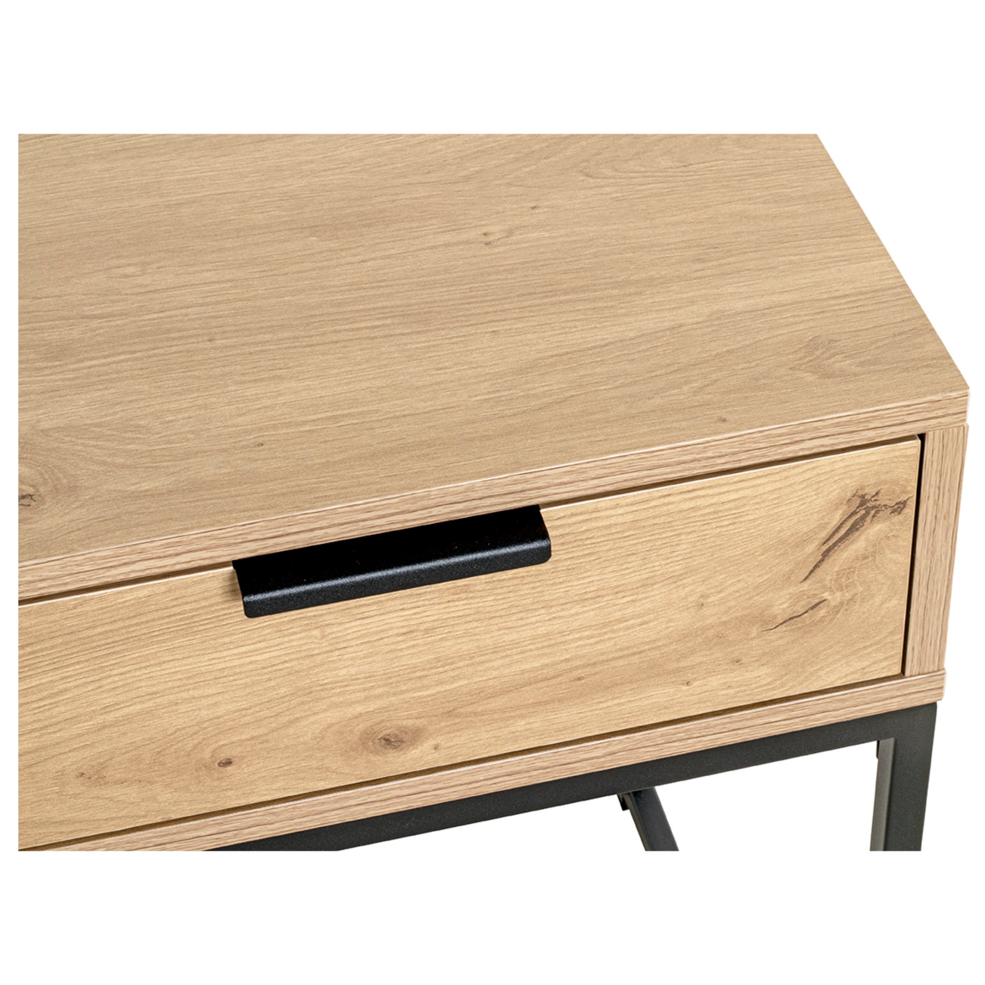 Horná doska je vyrobená z laminovanej drevotrieskovej dosky v dekore svetlého duba, ktorá sa vyznačuje nielen atraktívnym vzhľadom, ale aj jednoduchou údržbou. Stabilitu zaisťuje pevný kovový rám s práškovým lakovaním v čiernej farbe. Kombinácia prírodného dekora dreva a tmavého kovu skvele zapadne do moderných aj industriálne ladených interiérov. Okrem priestrannej odkladacej plochy ponúka stolík aj praktickú zásuvku, kam môžete uložiť drobnosti, ktoré chcete mať vždy poruke.
