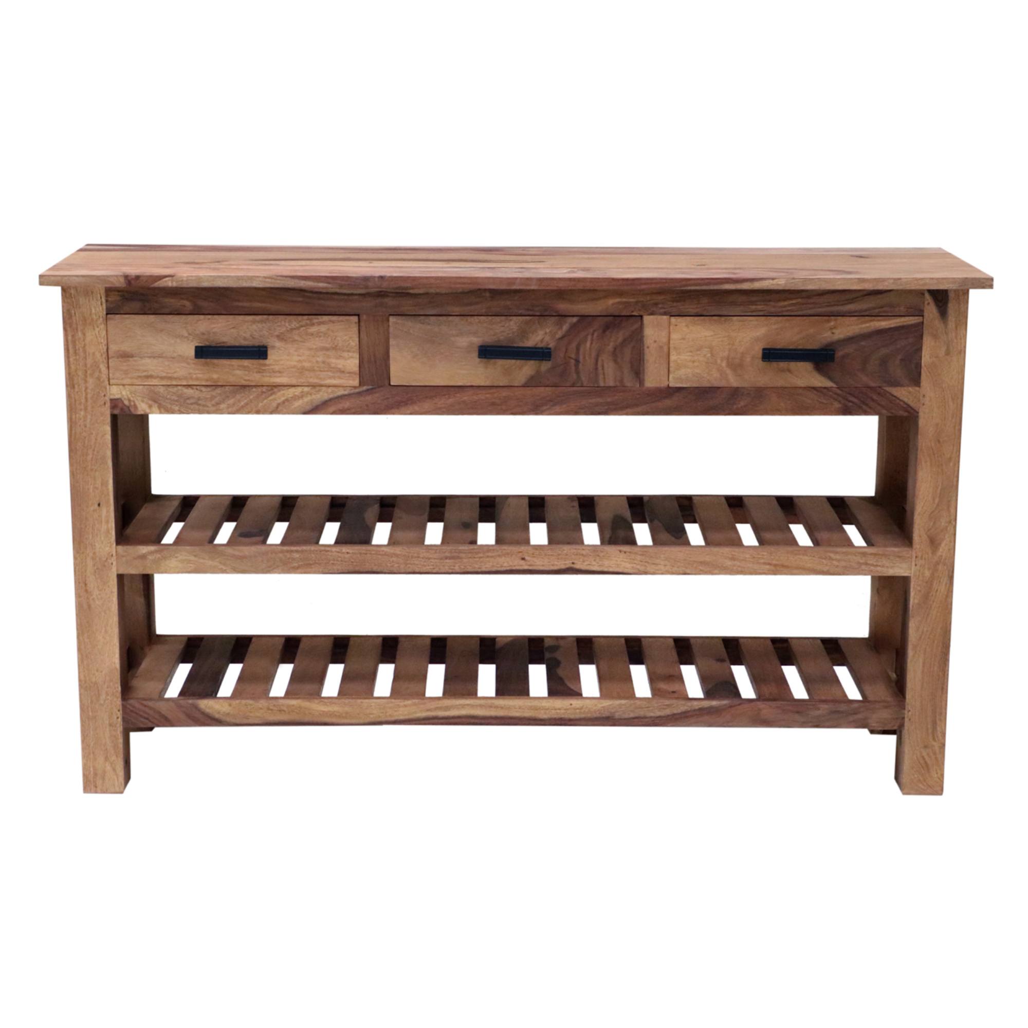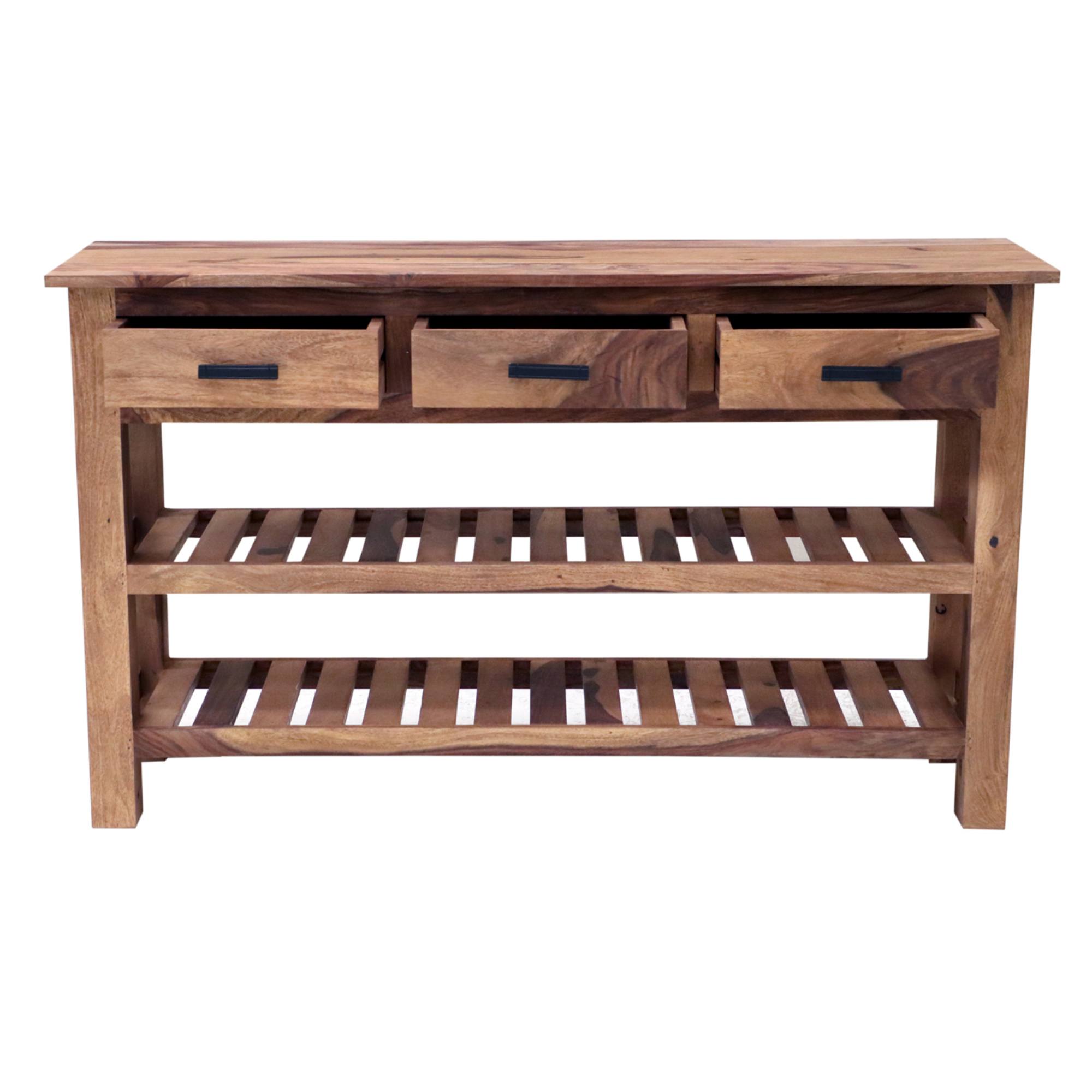 Pokiaľ ide o odkladací priestor, ponúka konzolový stolík RAMIL 130 nielen 3 zásuvky s úchytkami pre jednoduchšiu manipuláciu, ale aj 2 spodné police.