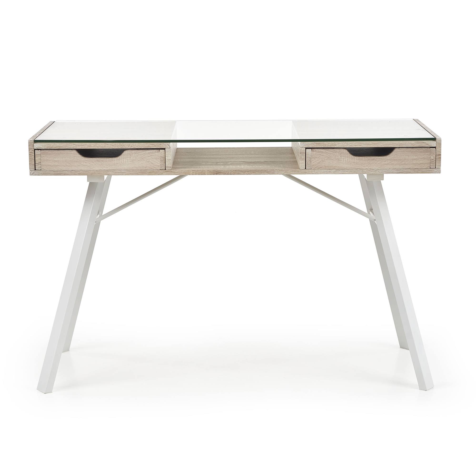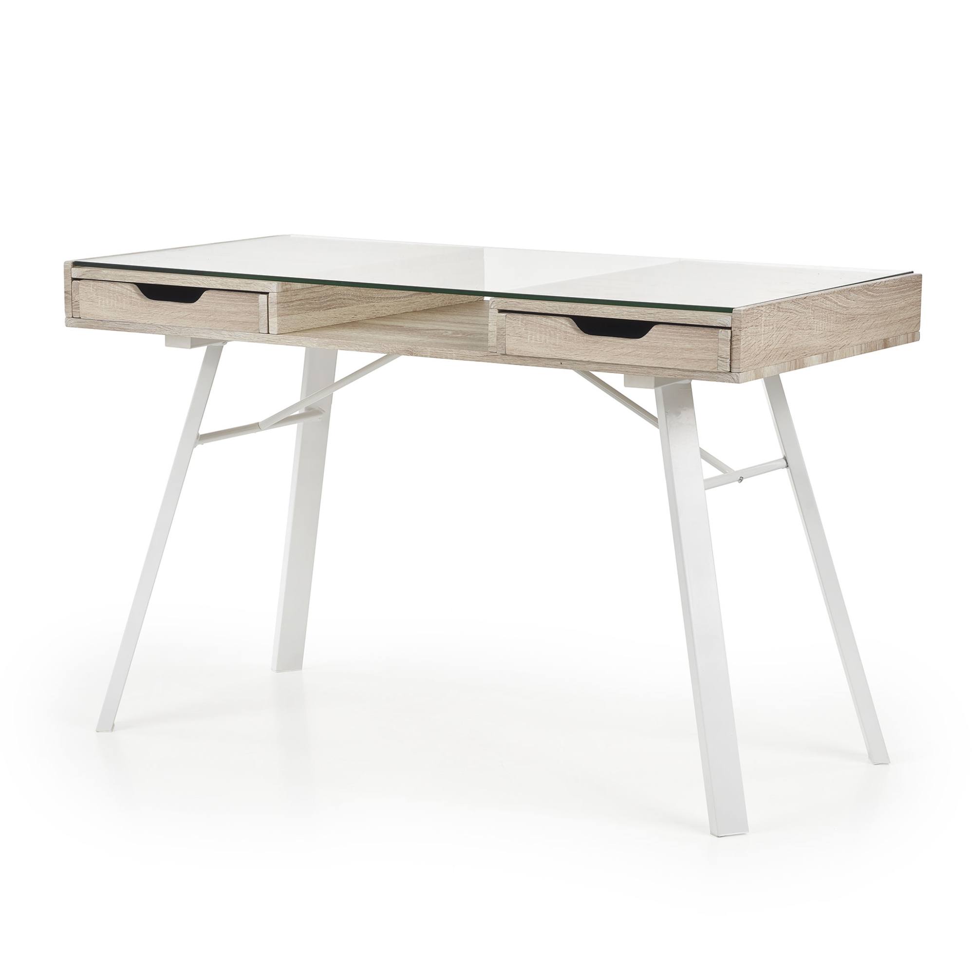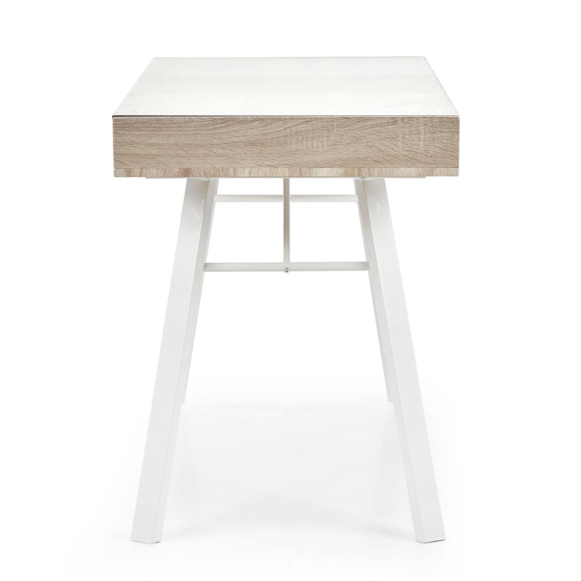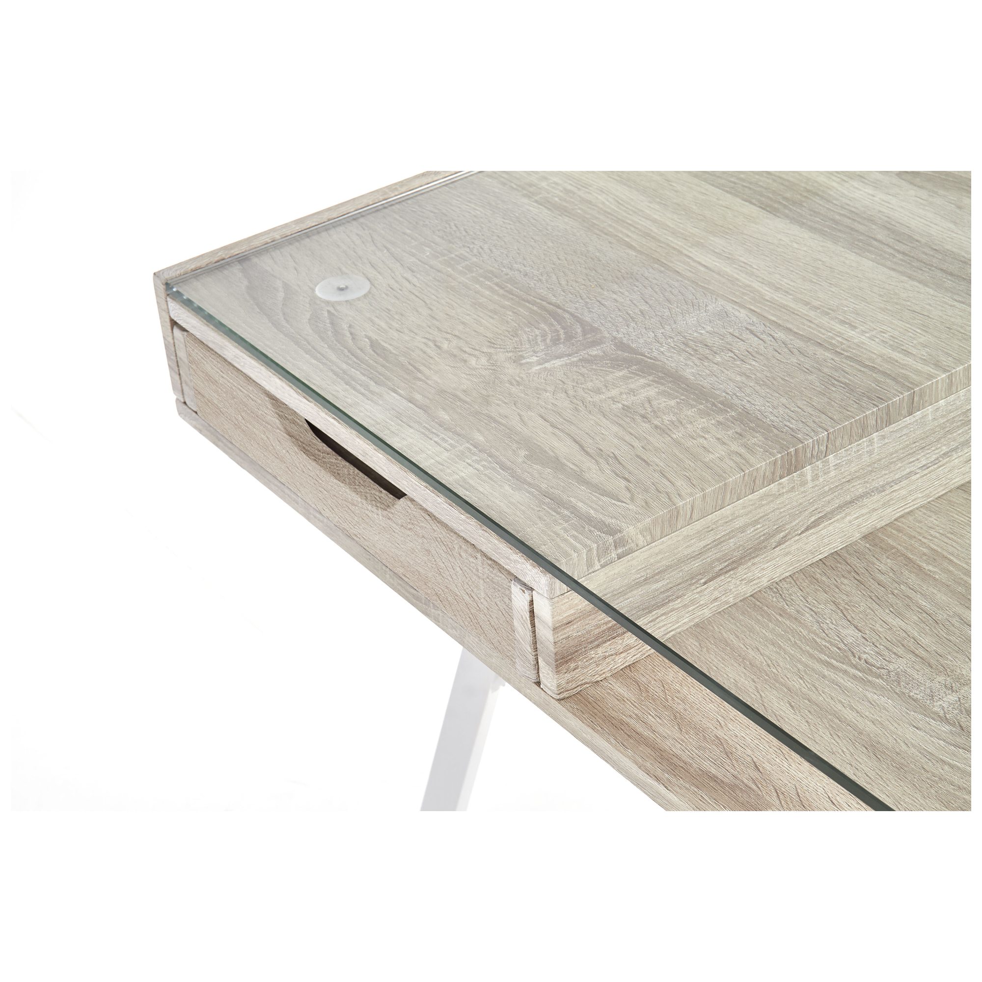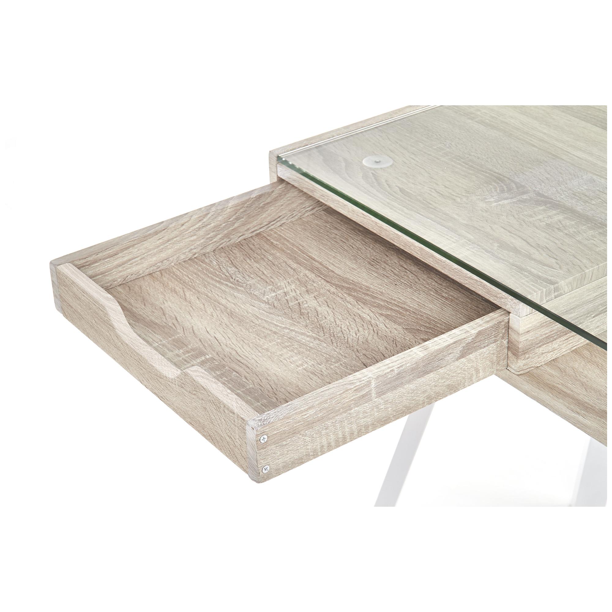 Vyrobený je z laminovaného drevovláknitého materiálu MDF a ladený do dekora duba sonoma – ten interiér obohatí o nádych prírody. Odkladacia doska je zo skla. Stolík ponúka dodatočný úložný priestor v podobe dvoch zásuviek a centrálnej police. Maximálnu stabilitu zaisťuje kovová podnož v bielom práškovom laku.