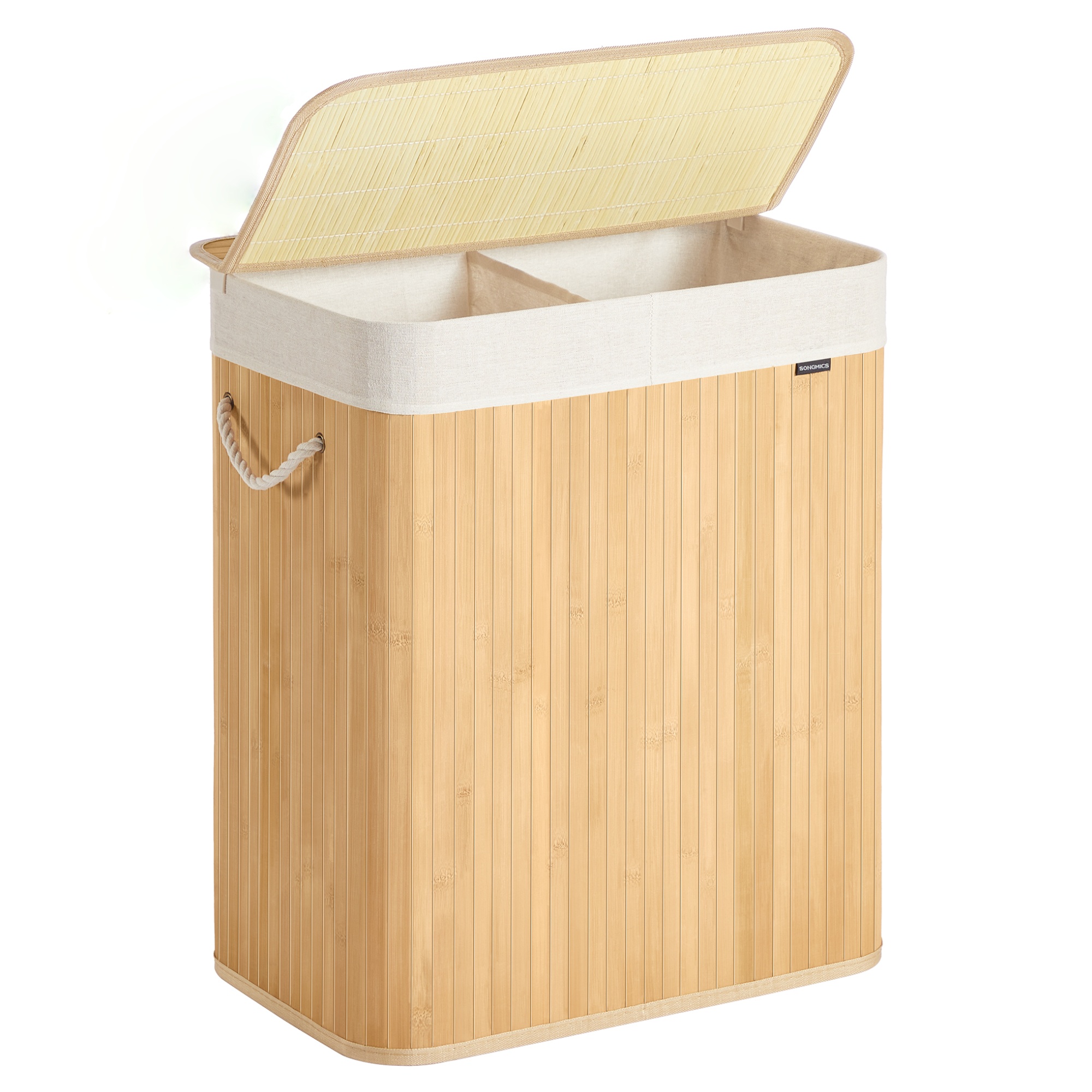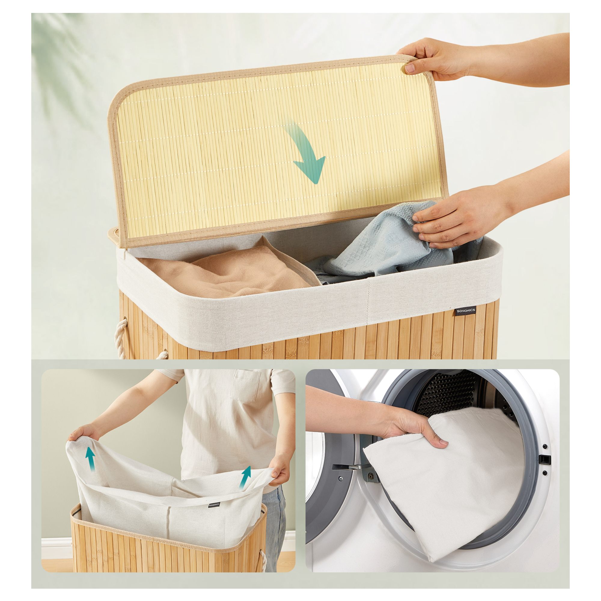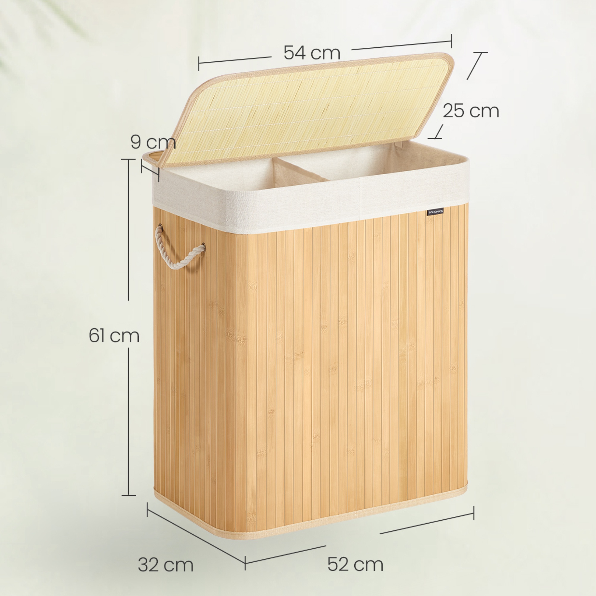Kôš je vyrobený z bambusu a je vybavený vakom zo zmesi bavlny a polyesteru, ktorý pojme až 100 l bielizne. Je rozdelený na dve časti, čo uľahčí triedenie podľa farieb. Dá sa tiež jednoducho vybrať a odniesť k práčke bez ťahania celého koša. Premiestnenie nie je problém vďaka 2 lanovým úchytom. Praktické veko zabraňuje úniku zápachu a zachováva čistý vzhľad interiéru. Dno dopĺňa pevná doska, ktorá udržiava tvar a stabilitu koša.
