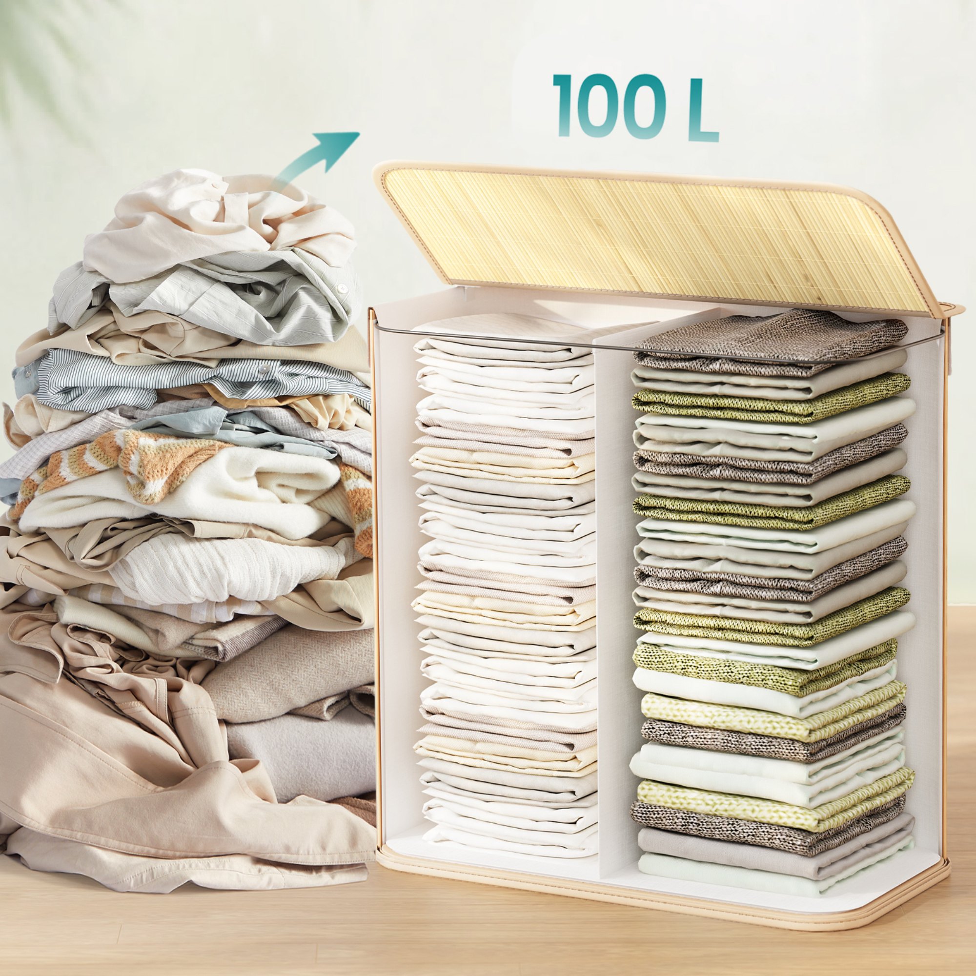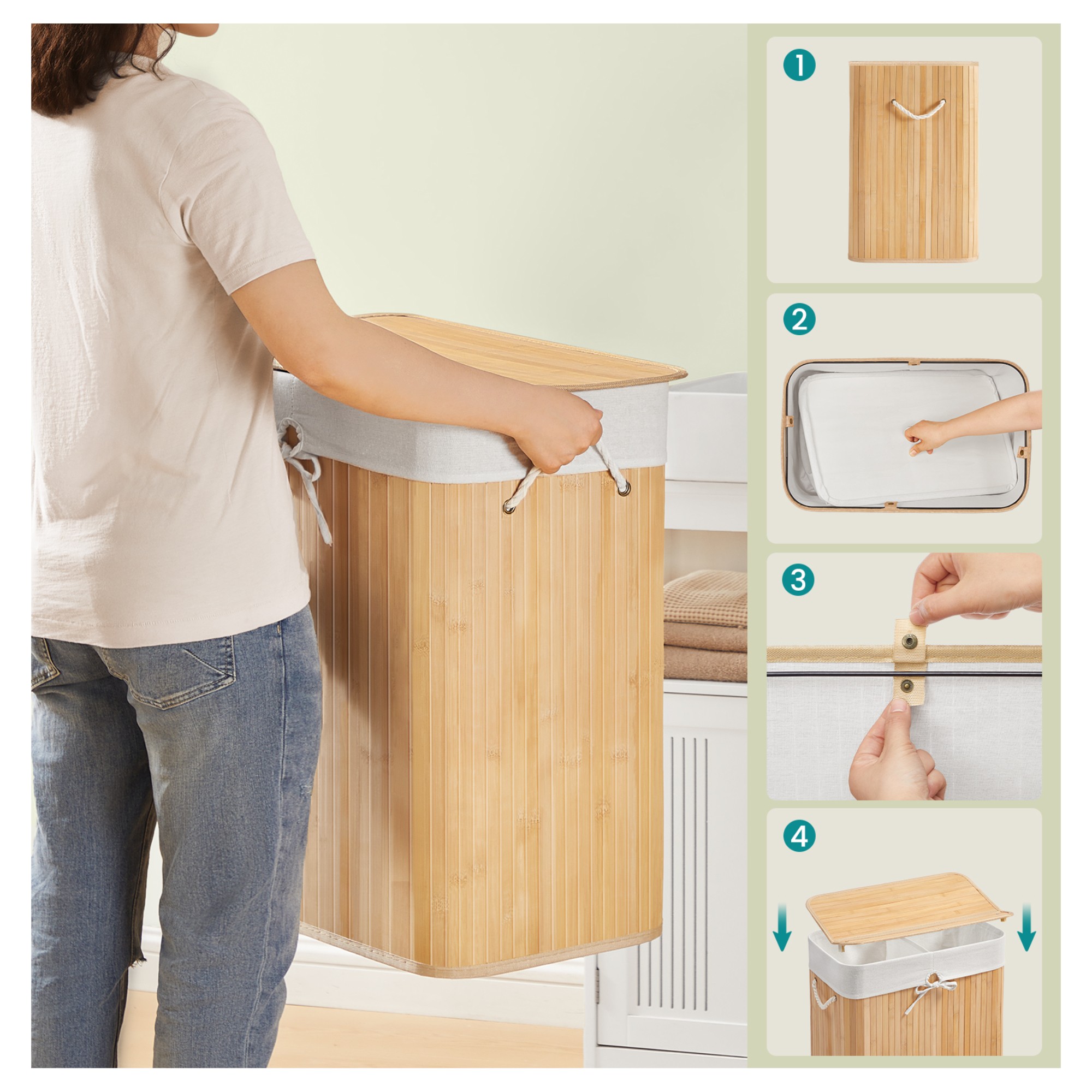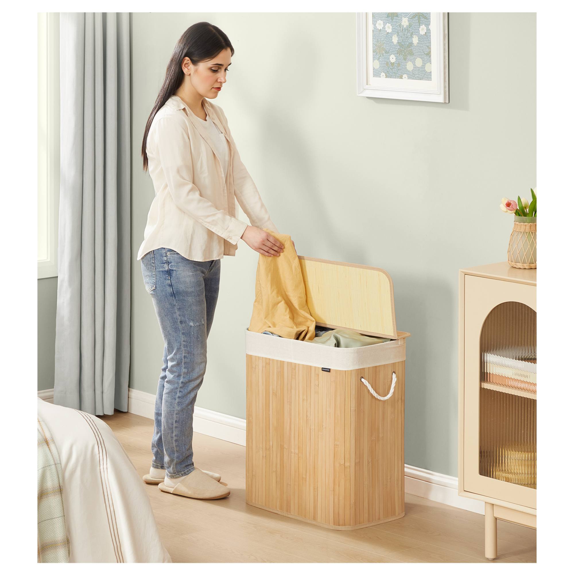 Kôš je vyrobený z bambusu a je vybavený vakom zo zmesi bavlny a polyesteru, ktorý pojme až 100 l bielizne. Je rozdelený na dve časti, čo uľahčí triedenie podľa farieb. Dá sa tiež jednoducho vybrať a odniesť k práčke bez ťahania celého koša. Premiestnenie nie je problém vďaka 2 lanovým úchytom. Praktické veko zabraňuje úniku zápachu a zachováva čistý vzhľad interiéru. Dno dopĺňa pevná doska, ktorá udržiava tvar a stabilitu koša.