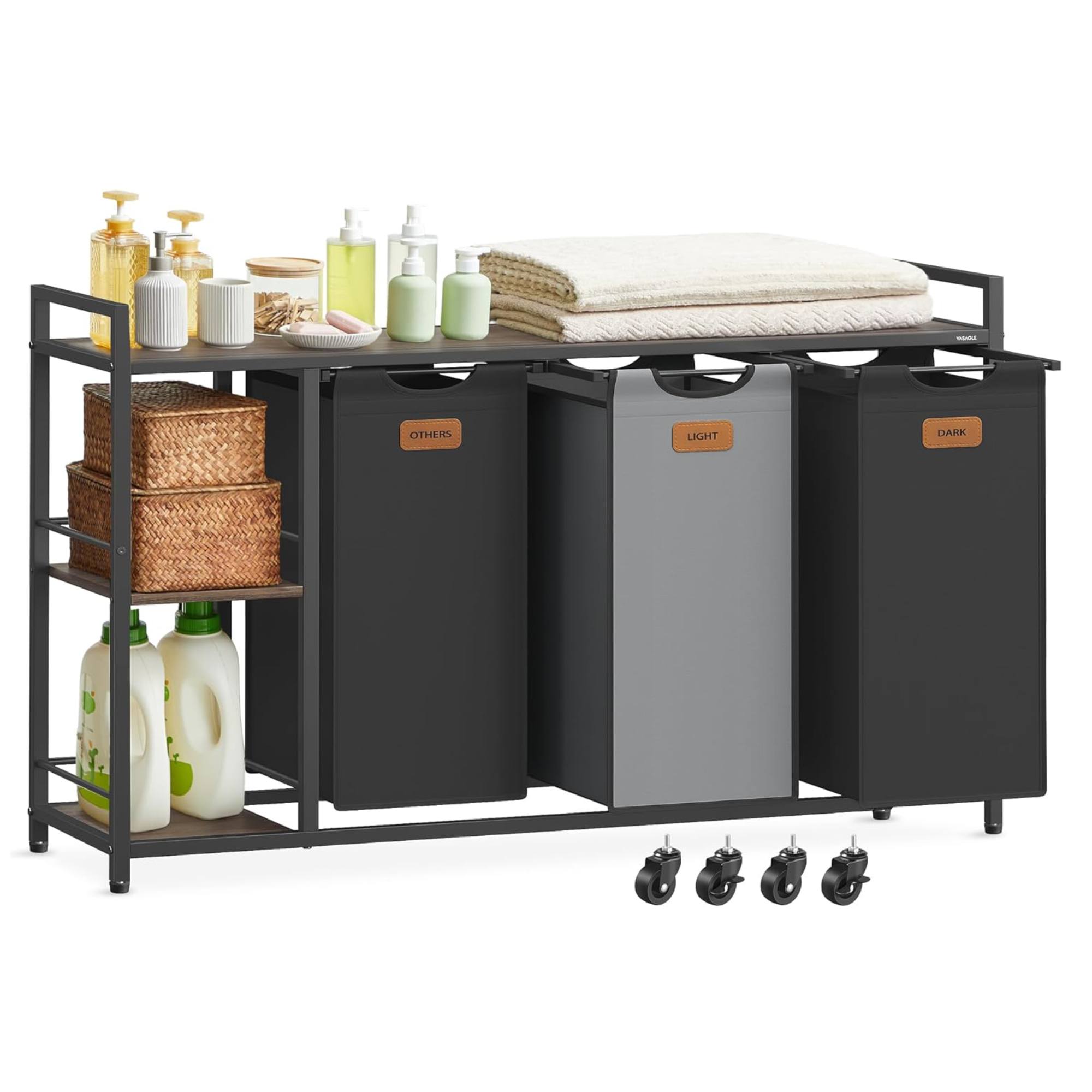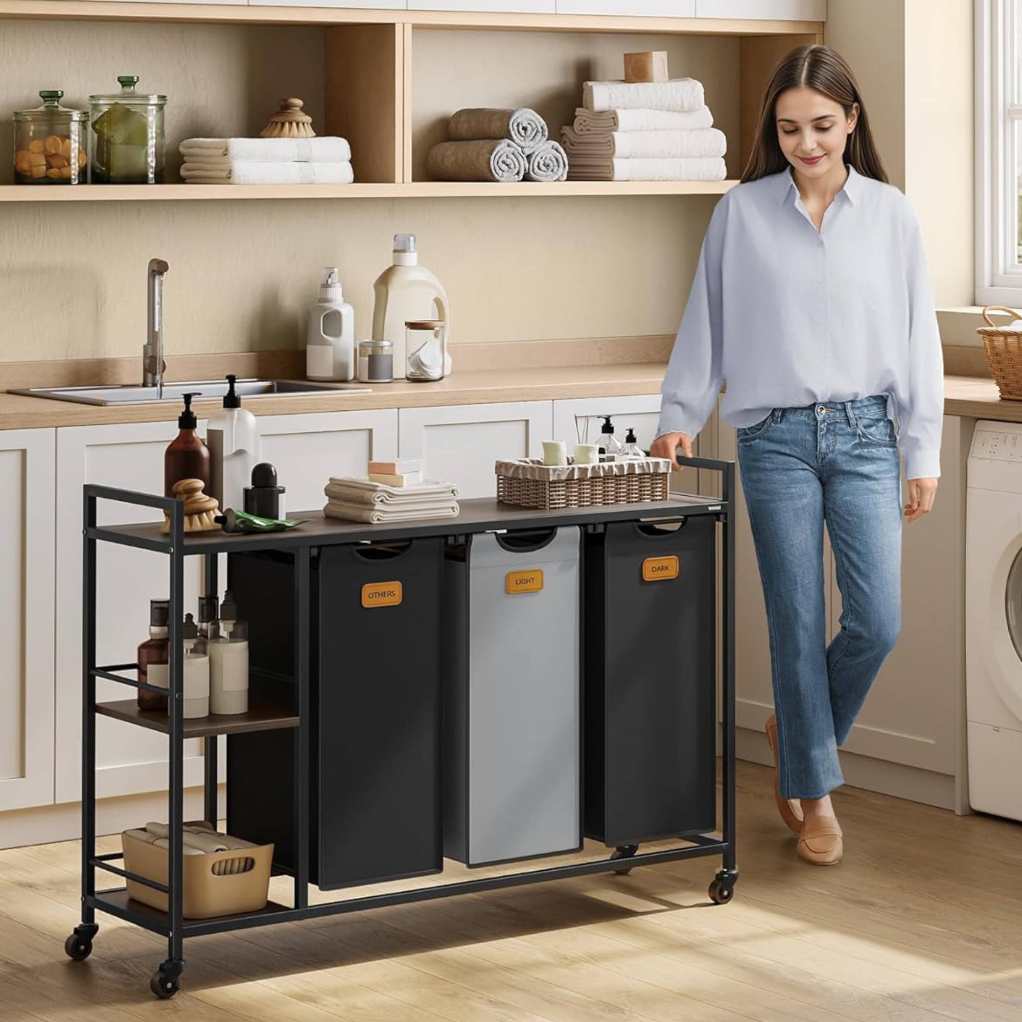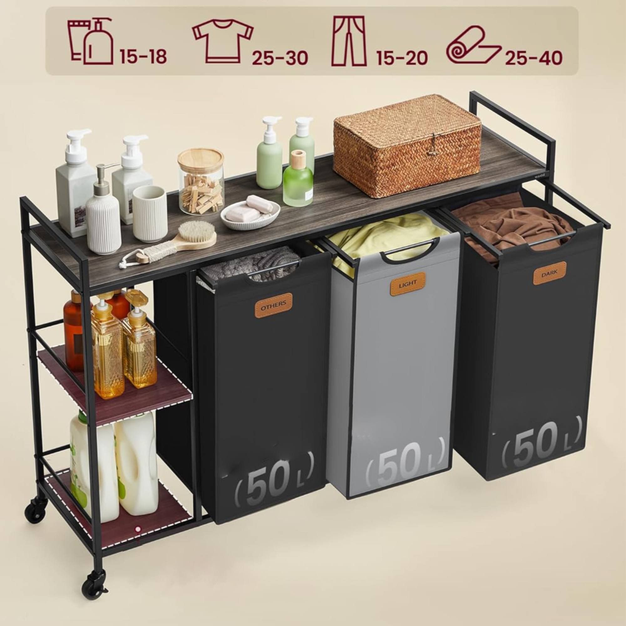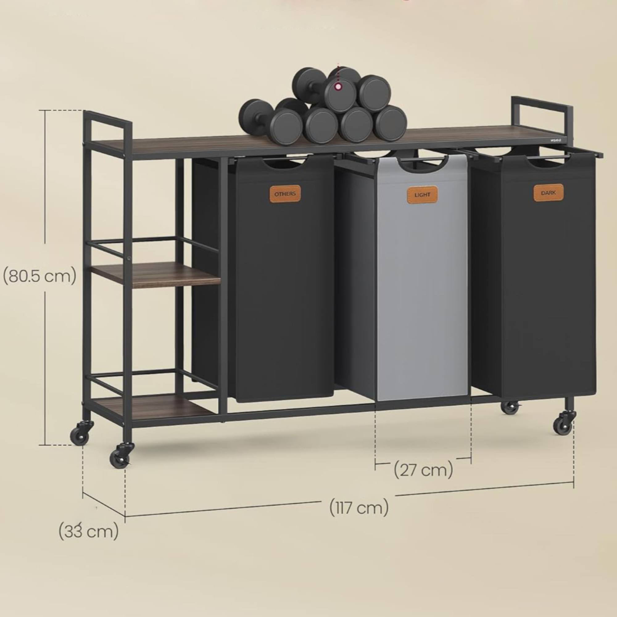 Kôš disponuje 3 veľkými košmi s objemom 50 L. Ich dno je vybavené plastovou doskou, ktorá udržuje tvar koša pri naplnení. Koše sú vyrobené z látky Oxford, ktorá sa vyznačuje svojou pevnosťou, vodeodolnosťou a jednoduchou údržbou. Nechýbajú ani 2 police z ľahko udržiavateľnej laminovanej drevotrieskovej dosky. Koše a police sú umiestnené na oceľovej konštrukcii s praktickou vrchnou doskou.