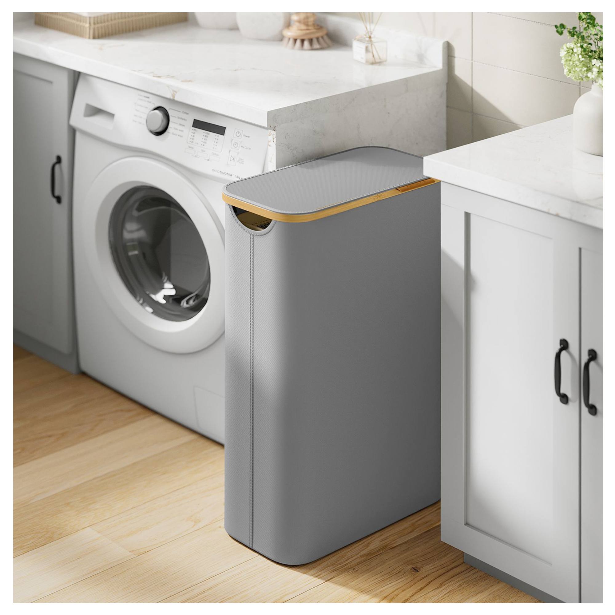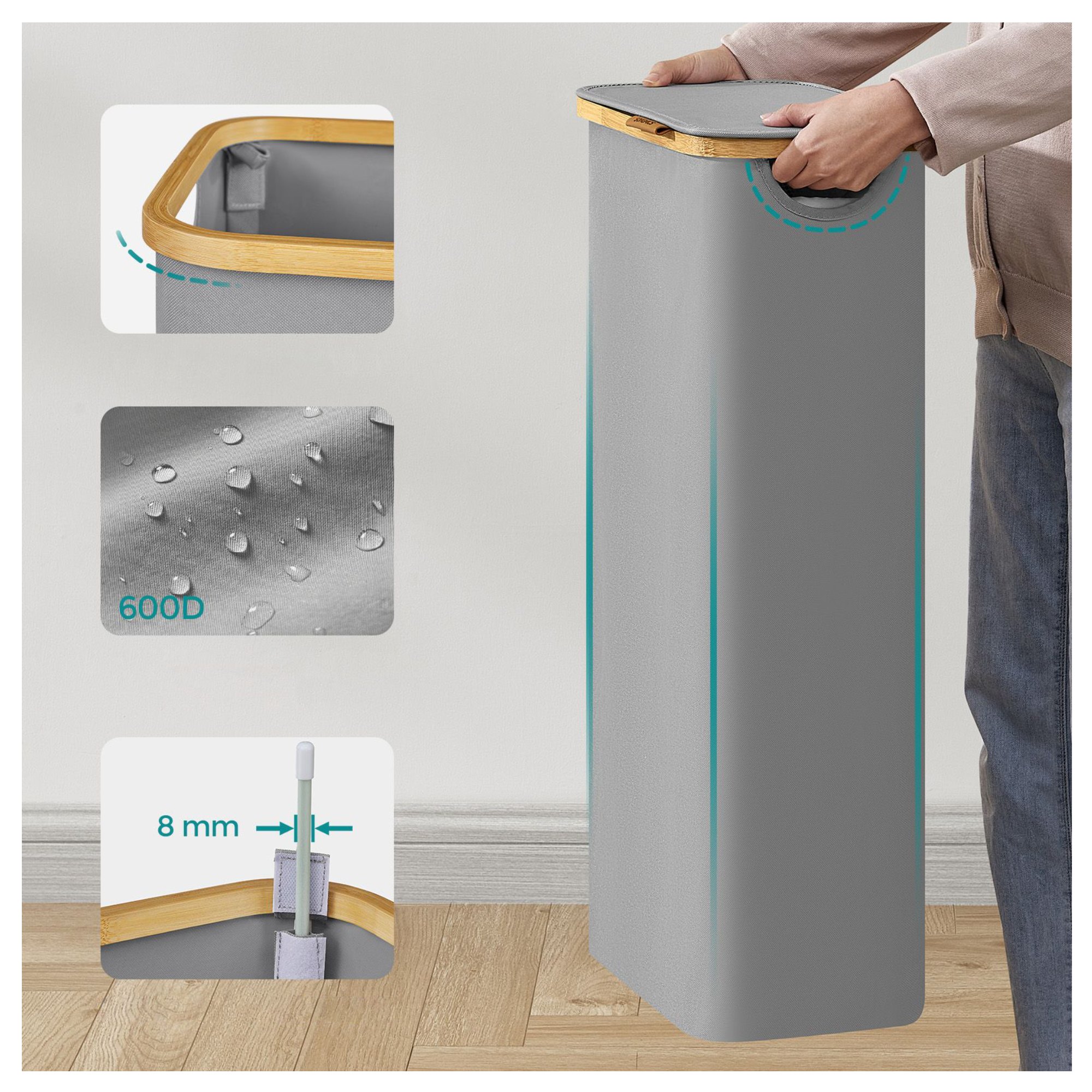 Celkový objem koša je 65 L a vak unesie spolu 5 kg bielizne. Vak je upevnený suchým zipsom a je vyberateľný. Vďaka jeho sťahovacej šnúrke ho pohodlne odnesiete až k práčke. Kôš je vyrobený z látky Oxford, ktorá sa vyznačuje pevnosťou, vodoodolnosťou a jednoduchou údržbou. Látka je napnutá pomocou podperných tyčí a v kombinácii s bambusovým rámom udržiava jeho tvar. Súčasťou koša je veko, ktoré udržiava vo vnútri nežiaduci zápach a zároveň chráni bielizeň pred prachom. Nechýbajú ani praktické úchytky pre pohodlnú manipuláciu. Vďaka svojej kompaktnej veľkosti je ideálny do kúpeľní s nedostatkom miesta.