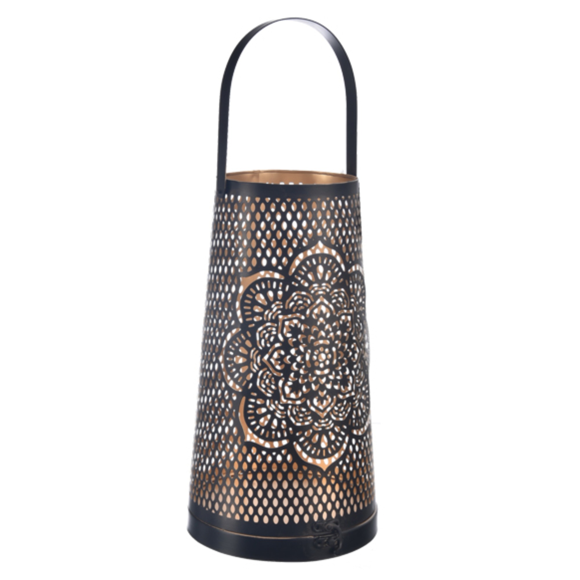 Je vyrobený z kovu ktorý kombinuje kontrastnú čiernu a zlatú farbu. Svojím frézovaným vzorom mandaly zaujímavo rozprestrie svetlo po miestnosti a dodá čarovnú atmosféru počas romantickej večere alebo pri čítaní počas zimných večerov. Svojou veľkosťou 13x20 cm je vhodný na väčšie sviečky. Svietnik je navyše vybavený záklopkou, vďaka ktorej môžete bezpečne sviečku umiestniť dovnútra.
