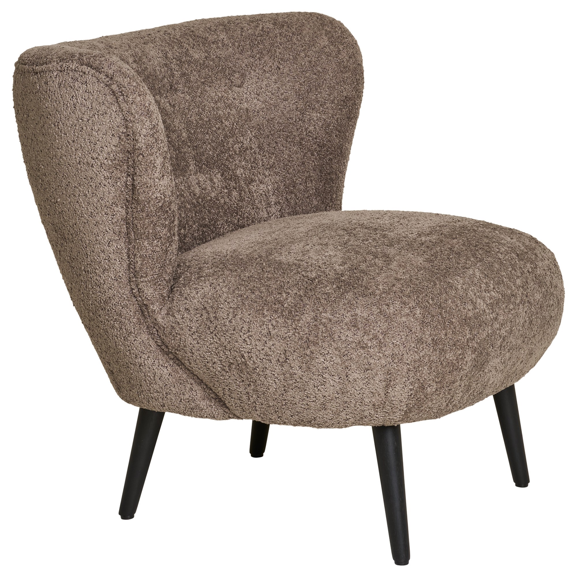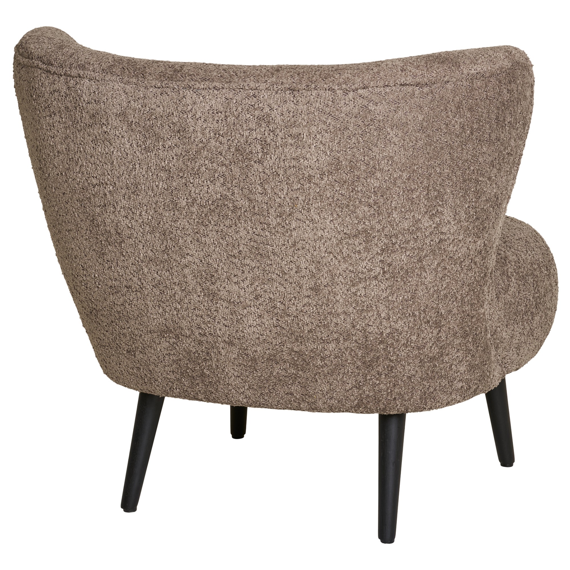 Konštrukcia je potiahnutá štruktúrovanou tkaninou typu bouclé v hnedej farbe, ktorá vytvára na dotyk príjemný a hrejivý povrch. Celočalúnené vyhotovenie je vhodné aj na postavenie do voľného priestoru. Zaoblené tvary a penové jadro zaistia komfortné posedenie. Celú konštrukciu podopierajú nohy z masívneho dreva, ktoré dotvárajú celkový elegantný vzhľad. Oceníte ich však aj z praktického hľadiska, pretože umožňujú ľahké upratovanie pod kreslom.