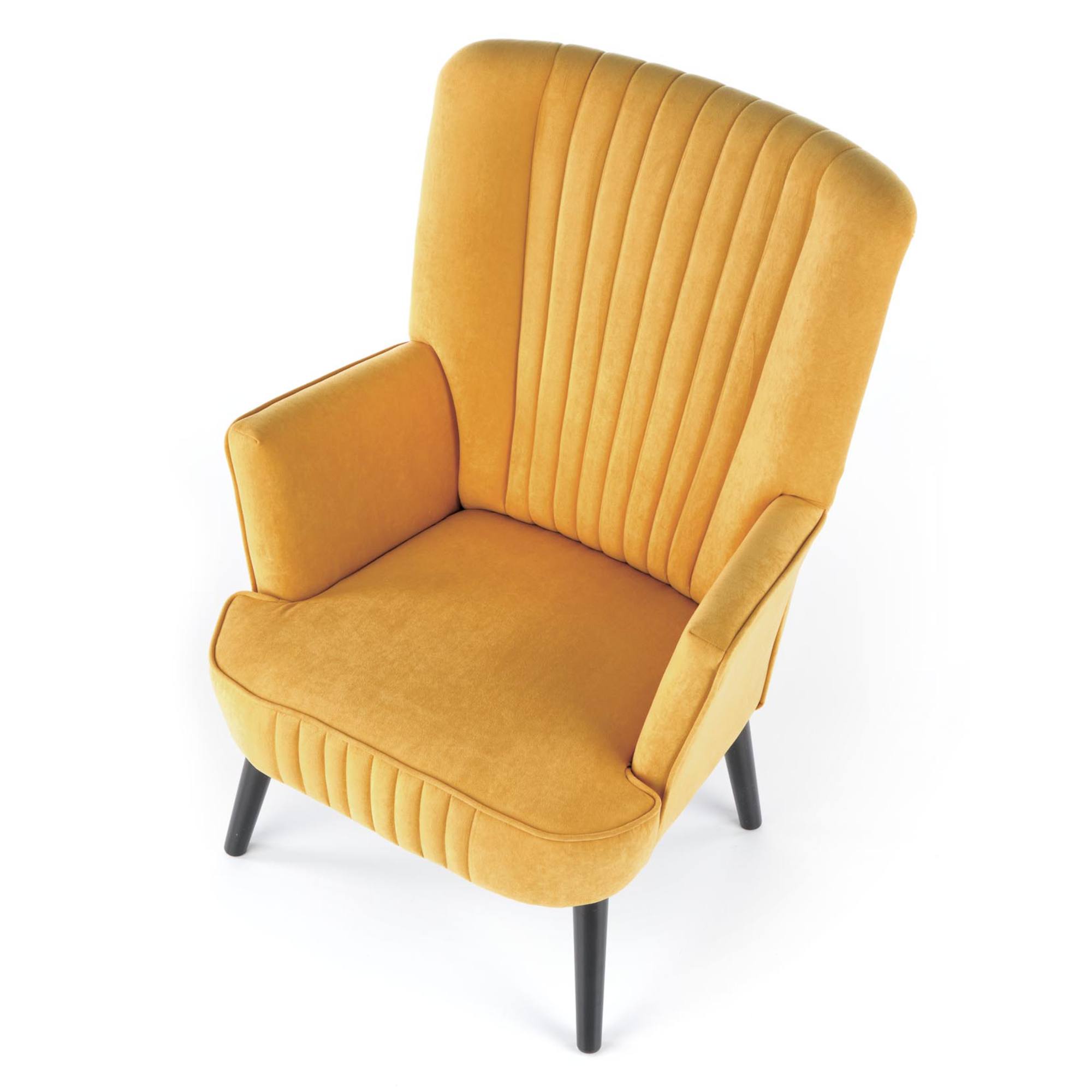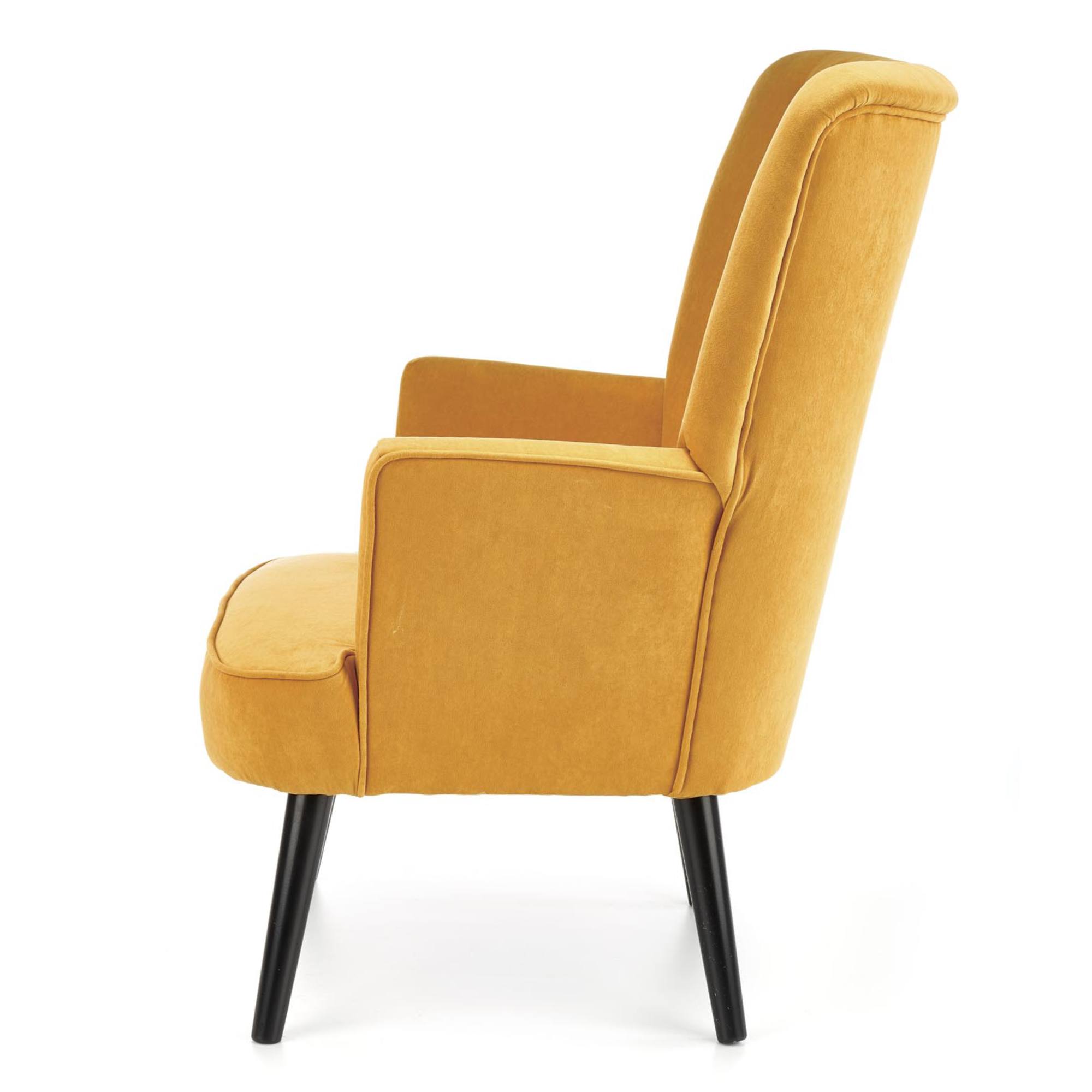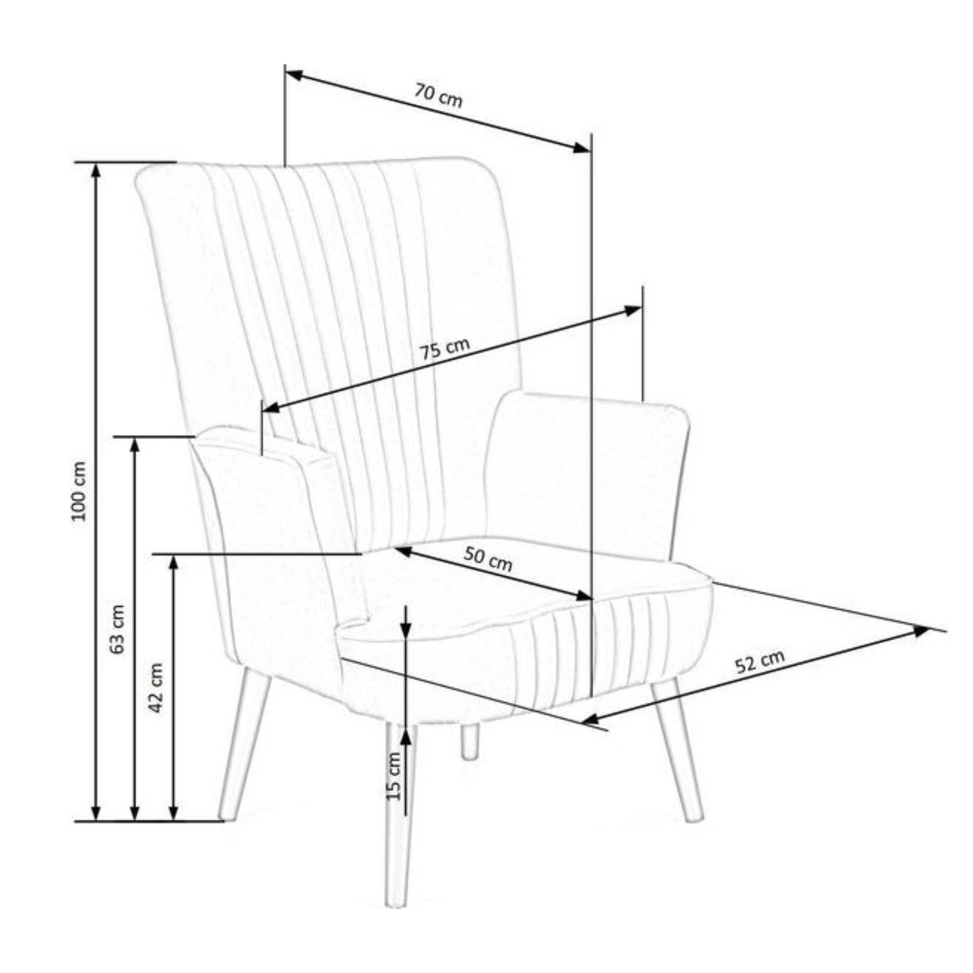 Konštrukcia je čalúnená hladkou tkaninou zamatového vzhľadu, ktorá je veľmi príjemná na dotyk. Vďaka komfortnému sedadlu s penovou výplňou, zaobleným podrúčkam a vysokému chrbtovému operadlu si môžete dopriať zaslúžený odpočinok. Chrbát je z prednej strany ozdobený výrazným prešívaním, ktoré vytvára elegantný vzhľad. Celú konštrukciu podopierajú vysoké nohy z masívneho dreva dodávajúce kreslu potrebnú stabilitu.