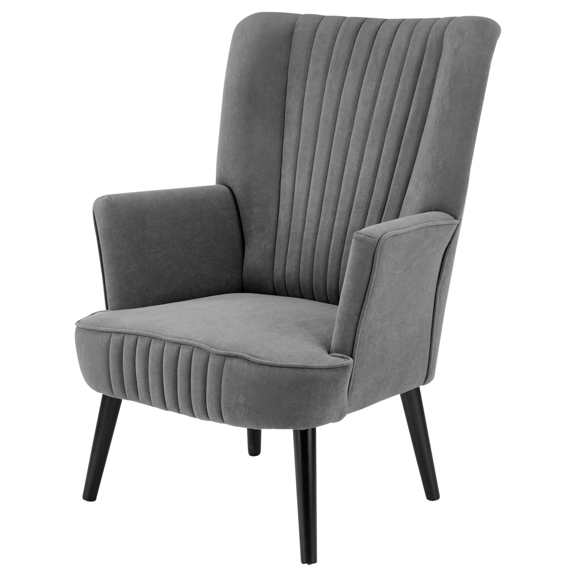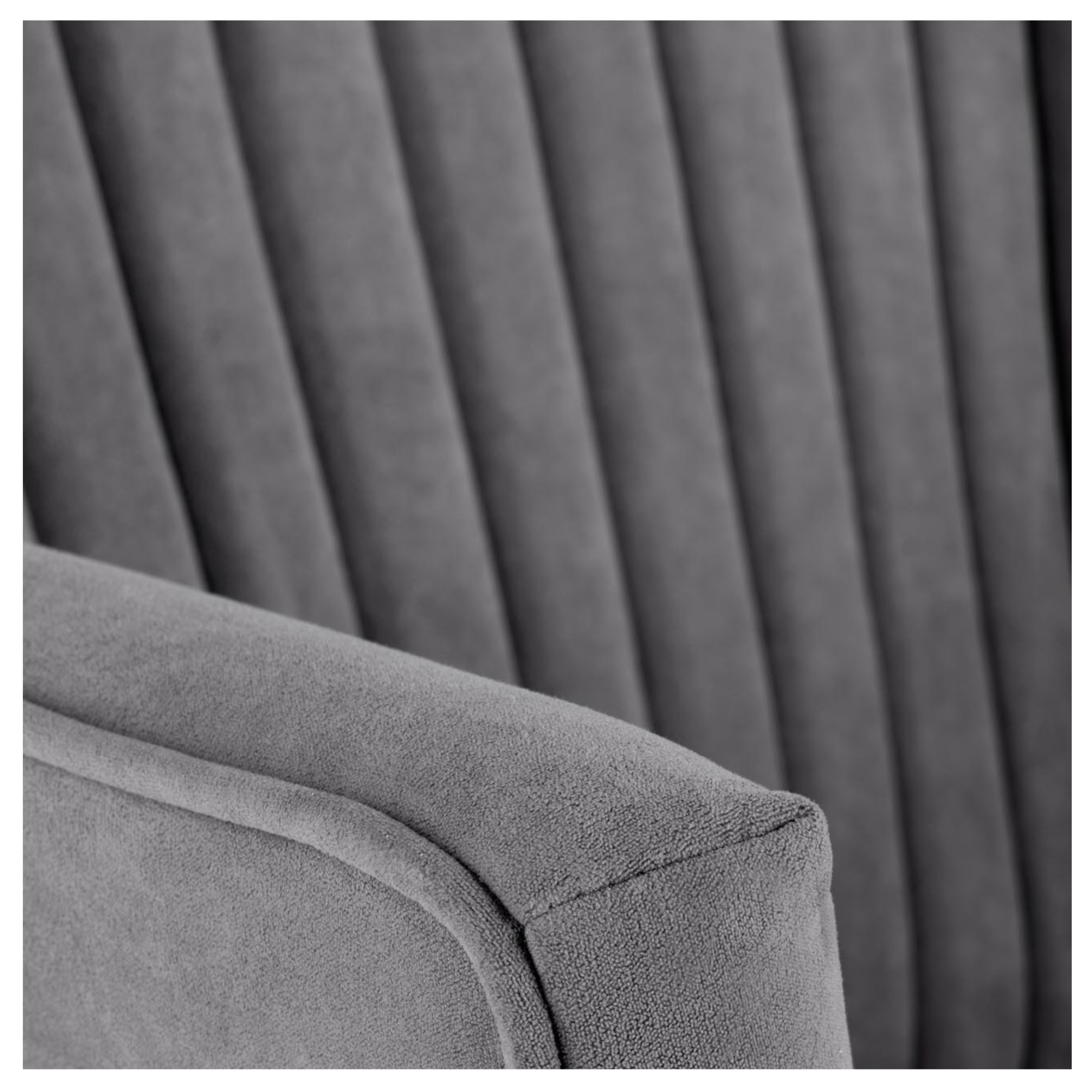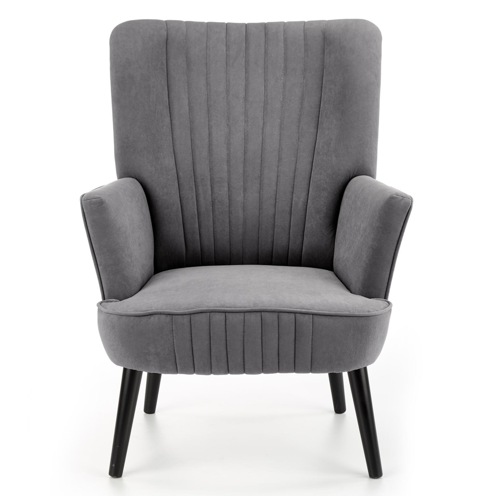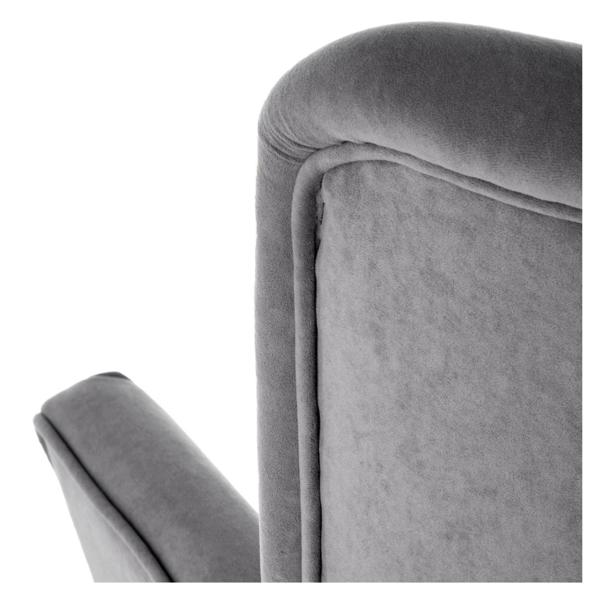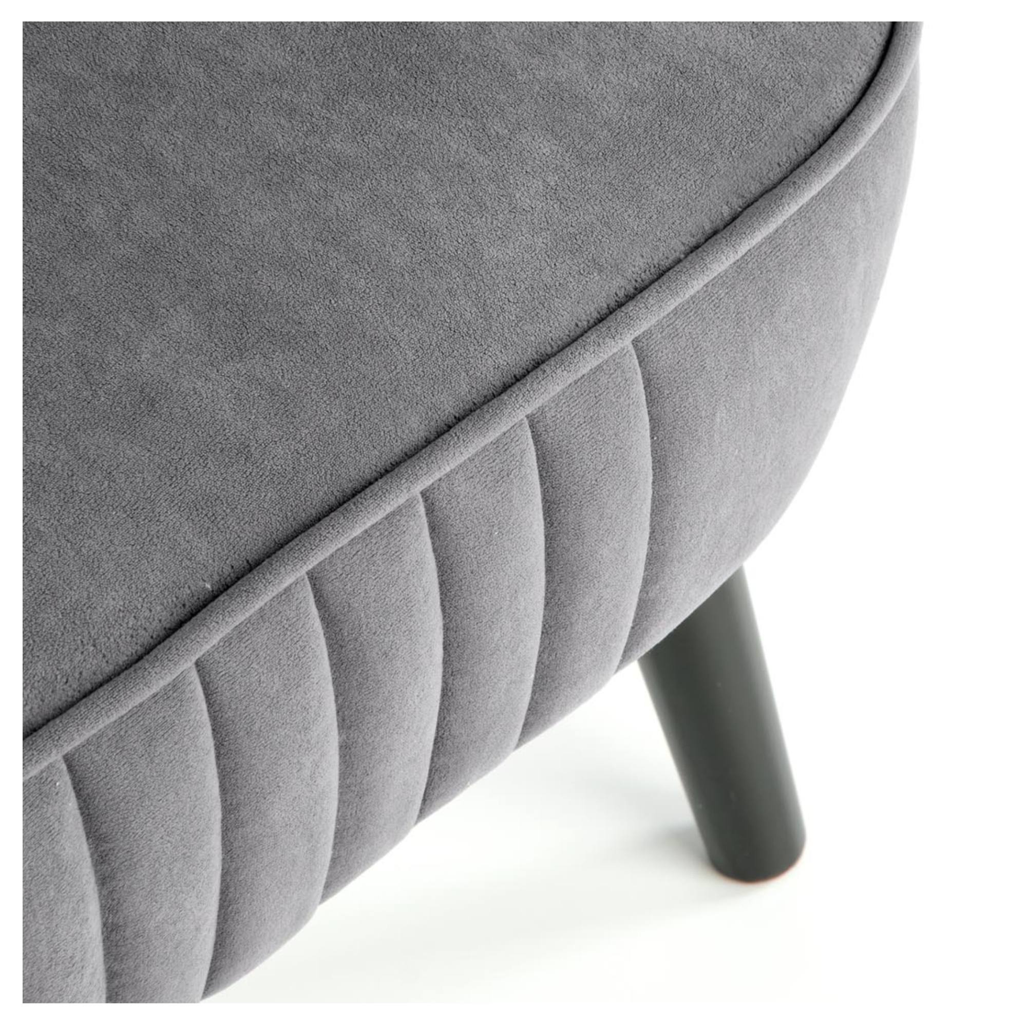 Konštrukcia je čalúnená hladkou tkaninou zamatového vzhľadu, ktorá je veľmi príjemná na dotyk. Vďaka komfortnému sedadlu s penovou výplňou, zaobleným podrúčkam a vysokému chrbtovému operadlu si môžete dopriať zaslúžený odpočinok. Chrbát je z prednej strany ozdobený výrazným prešívaním, ktoré vytvára elegantný vzhľad. Celú konštrukciu podopierajú vysoké nohy z masívneho dreva dodávajúce kreslu potrebnú stabilitu.