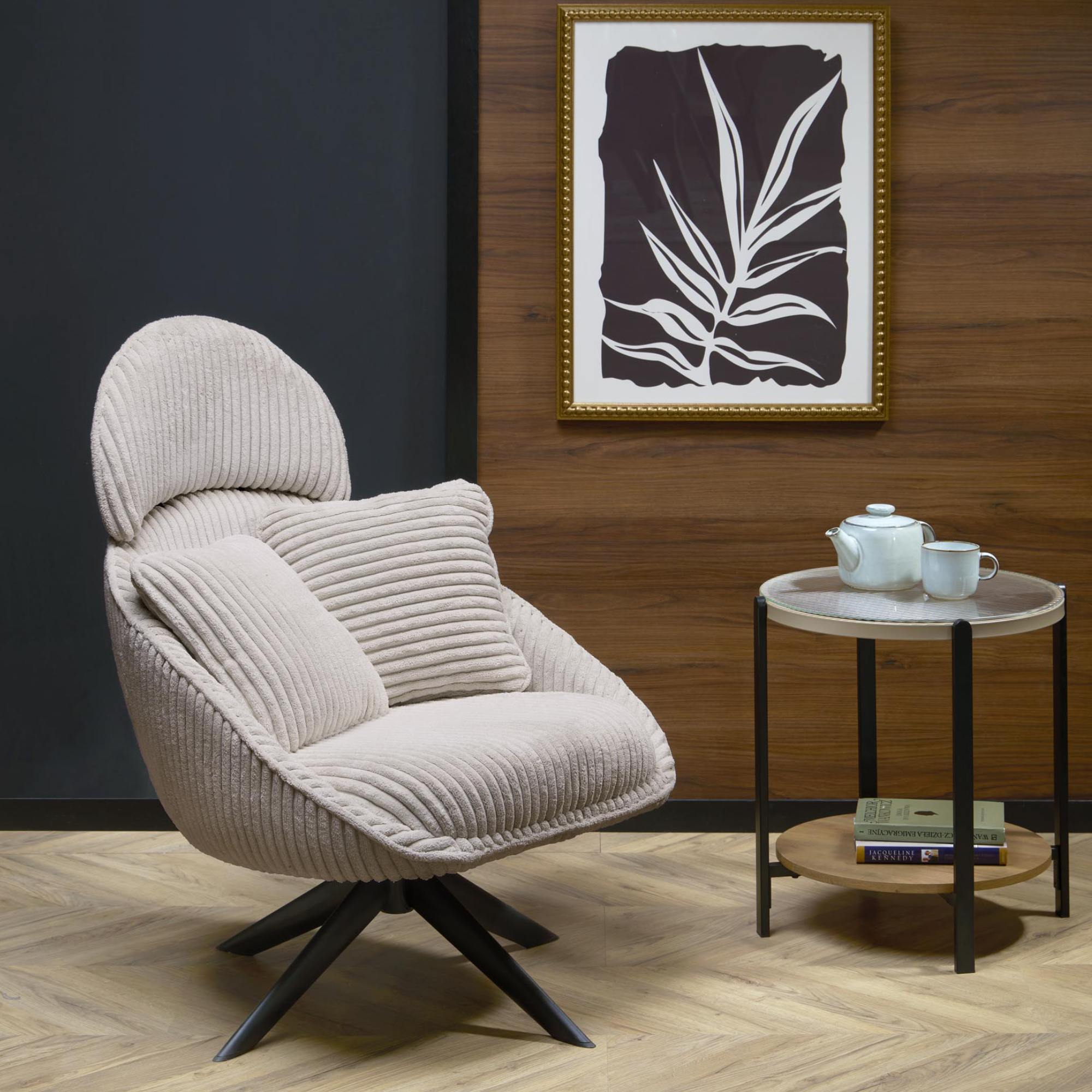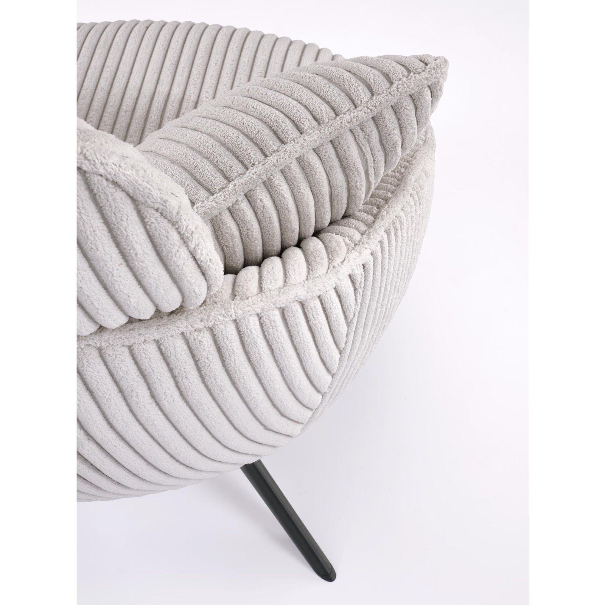 Stabilné nohy tohto kresla sú vyrobené z kovu, ktorého povrch je práškovo lakovaný. Konštrukciu dopĺňa mäkký penový sedák a 2 vankúše. Kreslo je čalúnené hladkou tkaninou príjemnou na dotyk.