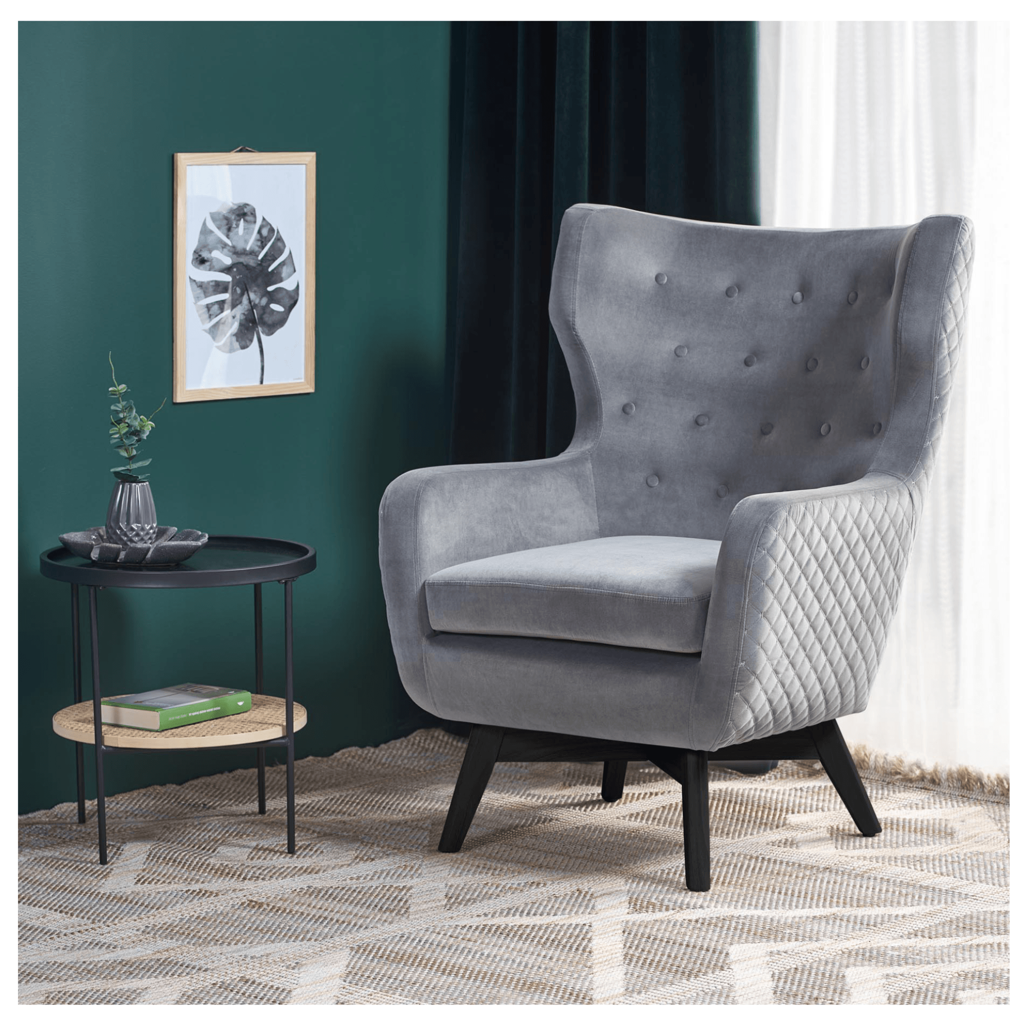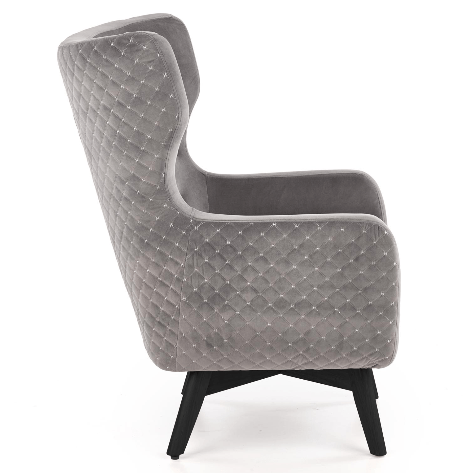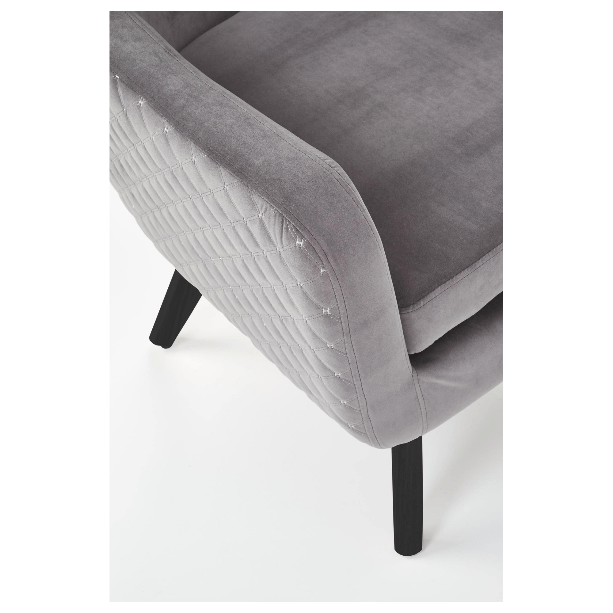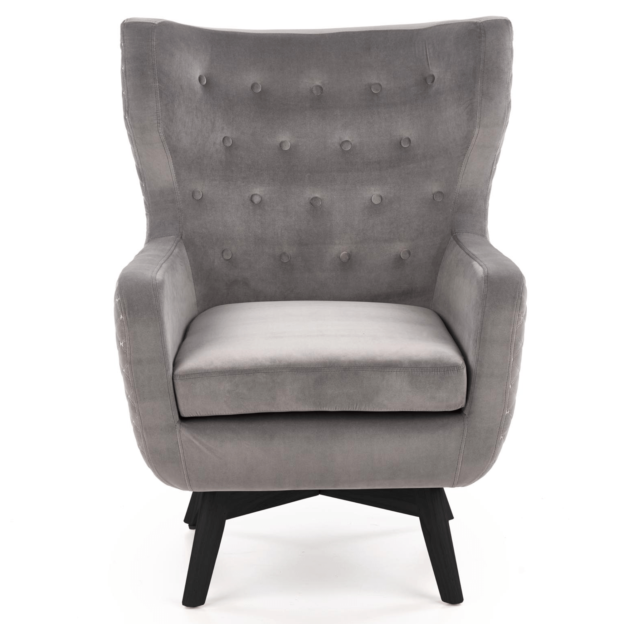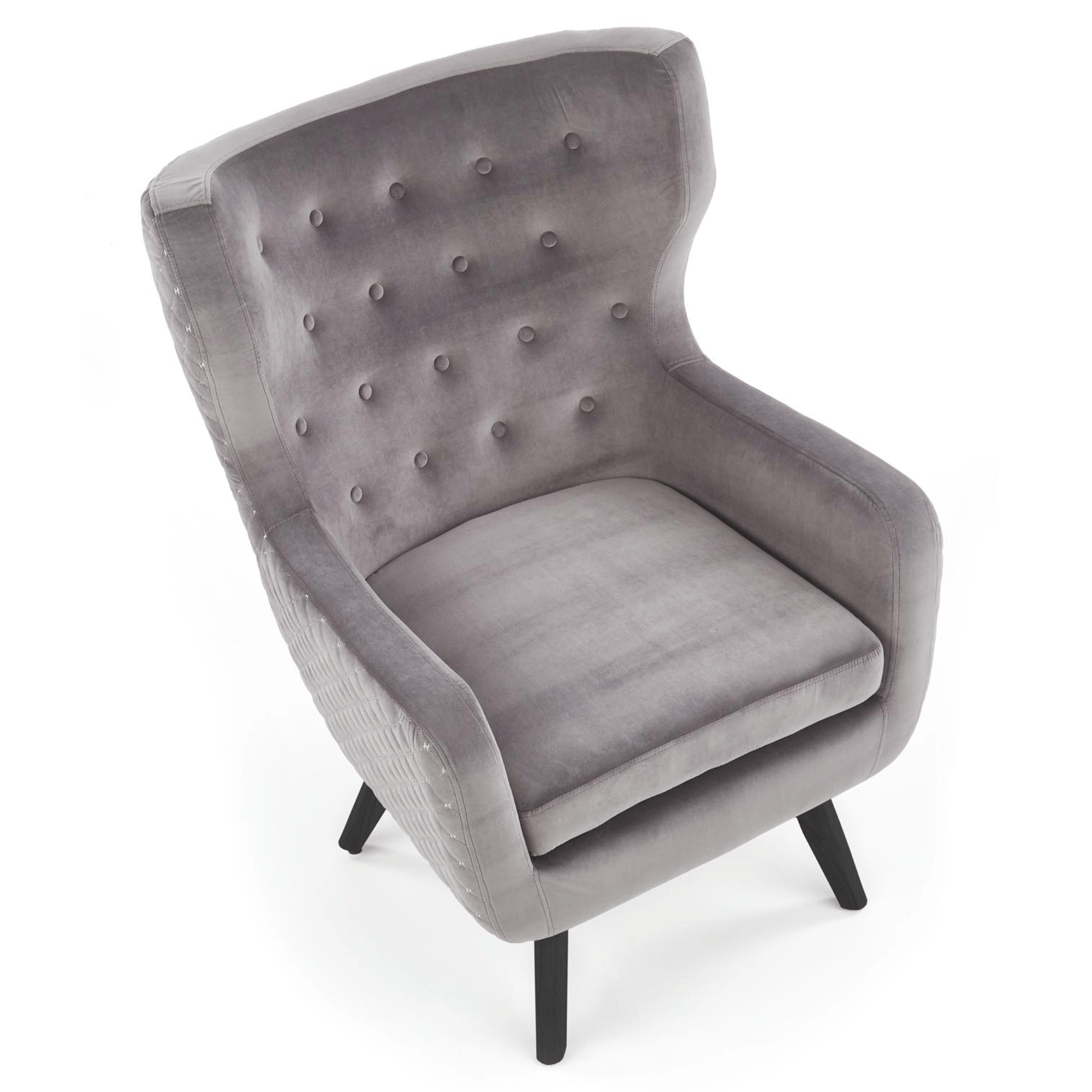 Kreslo je potiahnuté hladkou tkaninou zamatového vzhľadu, ktorá je príjemná pri styku s pokožkou. Vďaka hrubému sedadlu, vysokému chrbtovému operadlu a pohodlne tvarovaným podrúčkam vám kreslo umožňuje dopriať si maximálne pohodlie. Priestranné sedadlo podopierajú čierne nohy z masívneho dreva, ktoré kreslu dodávajú potrebnú stabilitu a zároveň vytvárajú elegantnejší dojem. Chrbát je z prednej strany ozdobený čalúnnickými gombíkmi a z druhej strany výrazným, ozdobným prešívaním. Kreslo je tak vhodné na postavenie do priestoru, kde vyniknú jeho jedinečné detaily.