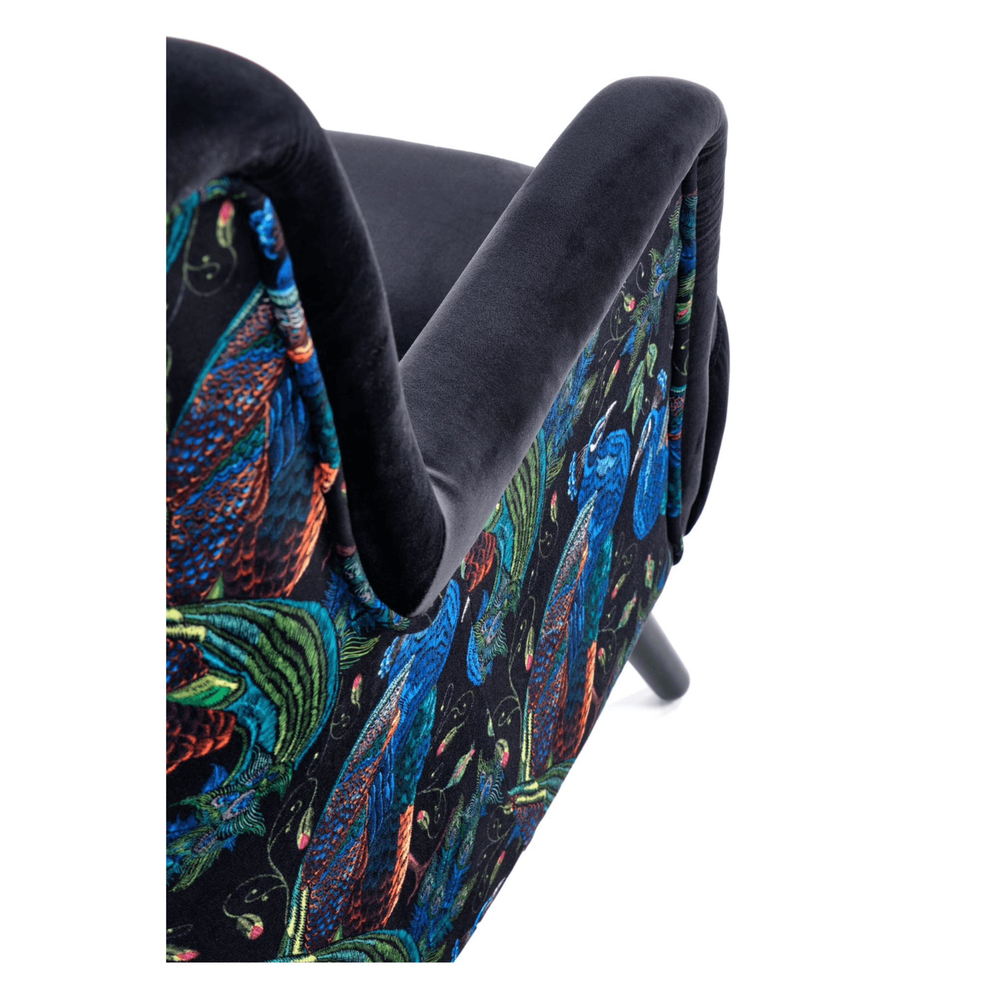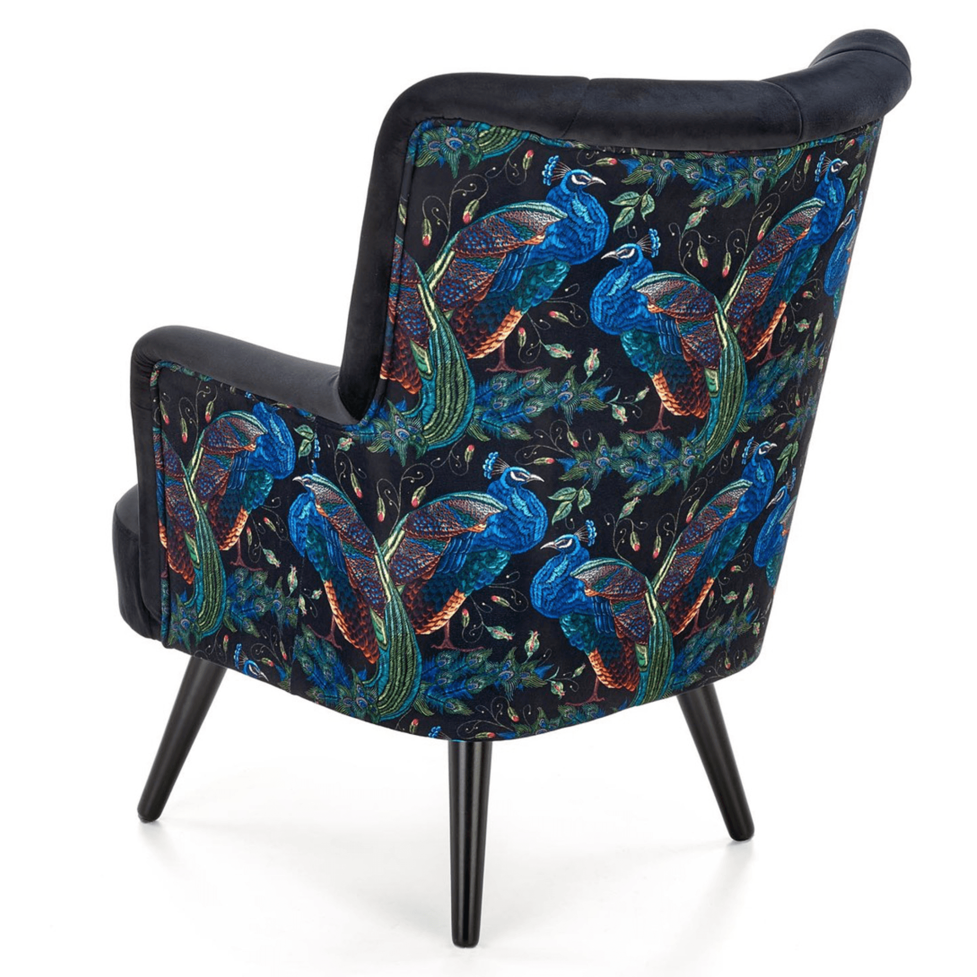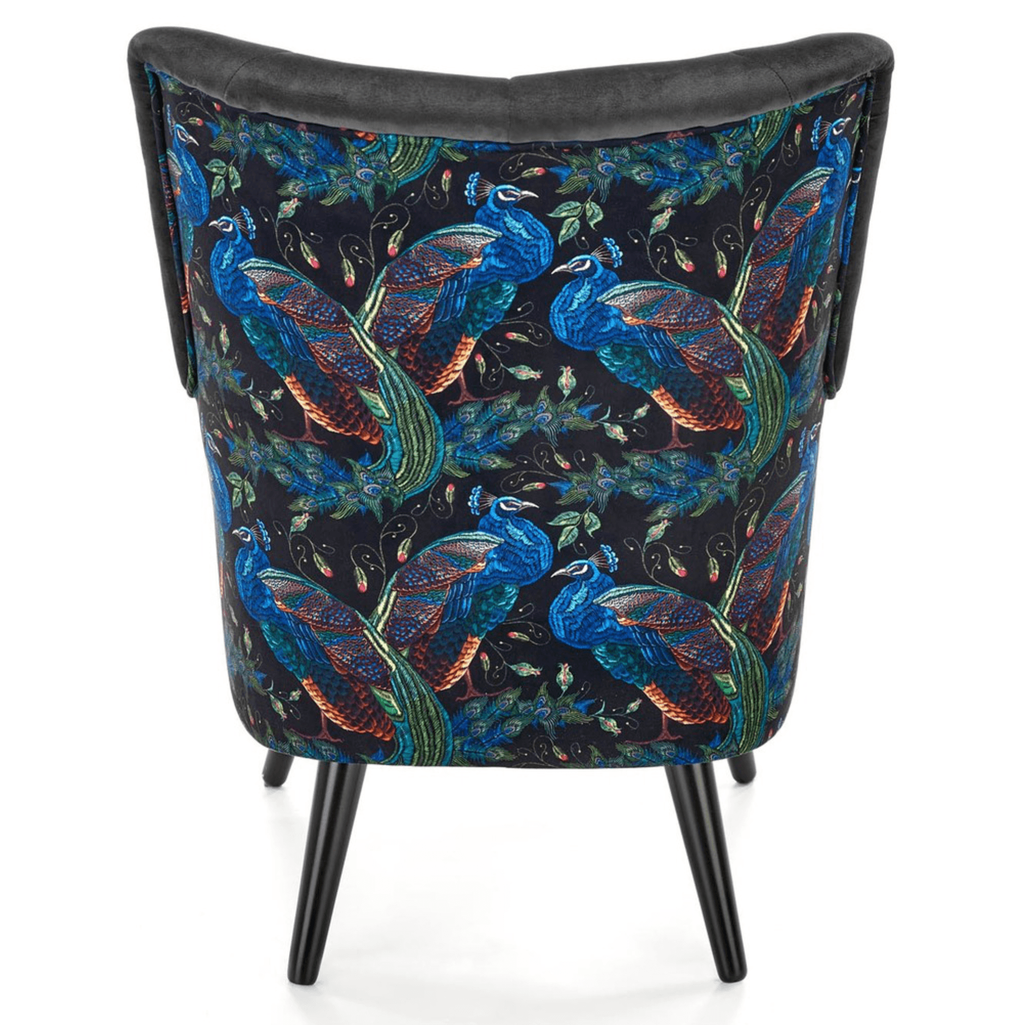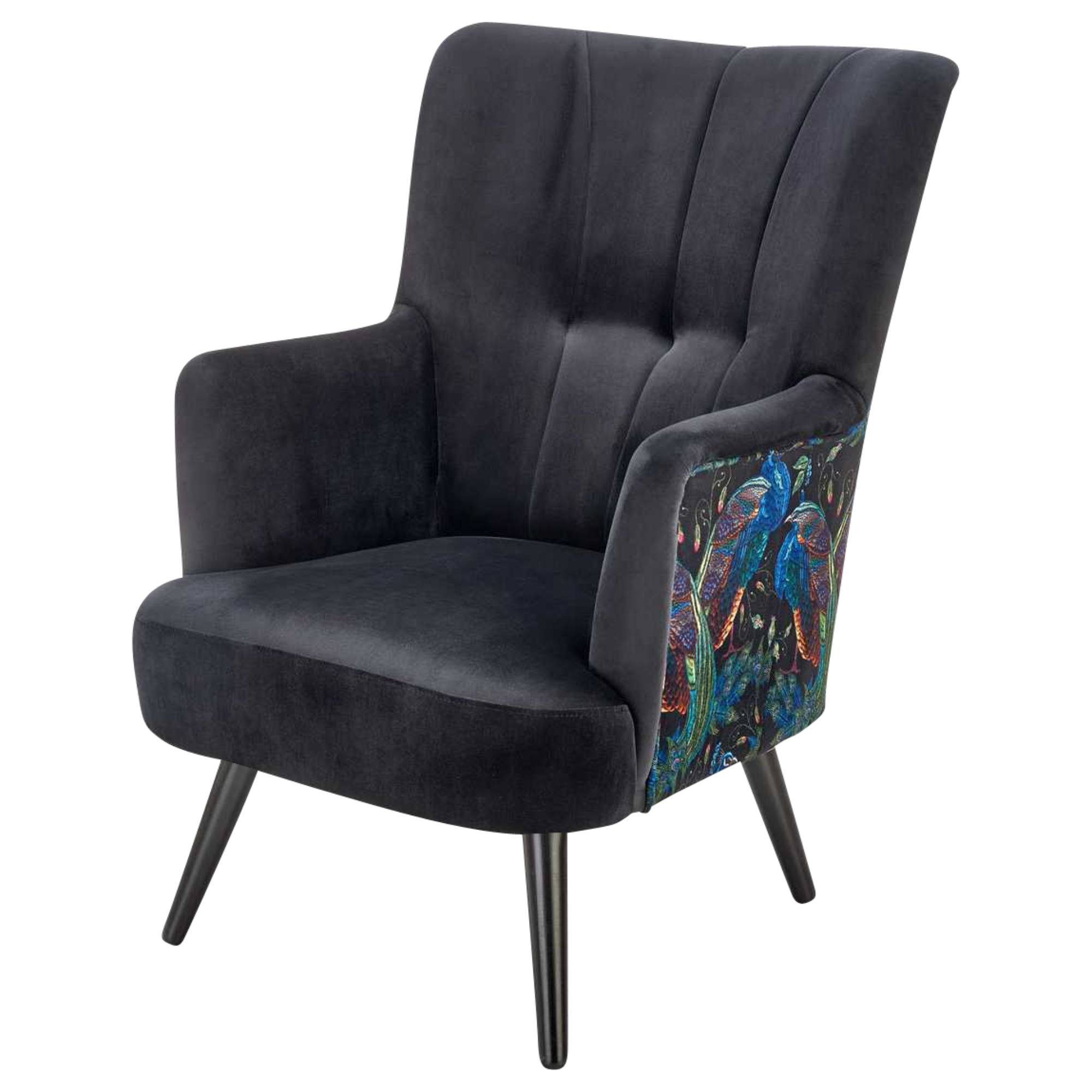 Svojím elegantným, ale napriek tomu výrazným vzhľadom skvele zapadne predovšetkým do moderných interiérov. Sedadlo spolu s operadlom sú potiahnuté zamatovo hladkou látkou príjemnou na dotyk. Priestranné sedadlo podopierajú čierne nohy vyrobené z masívneho dreva, ktoré dodávajú kreslu požadovanú stabilitu. Vďaka vysokému chrbtovému operadlu a pohodlne tvarovaným podrúčkam vám kreslo umožňuje dopriať si maximálne pohodlie. Operadlo je z prednej strany prešívané a doplnené o čalúnnické gombíky. Zadnú stranu kresla zdobí výrazný motív, ktorý z jednoduchého kresla vytvára nevšedný kus nábytku, ktorý ozvláštni akýkoľvek interiér.
