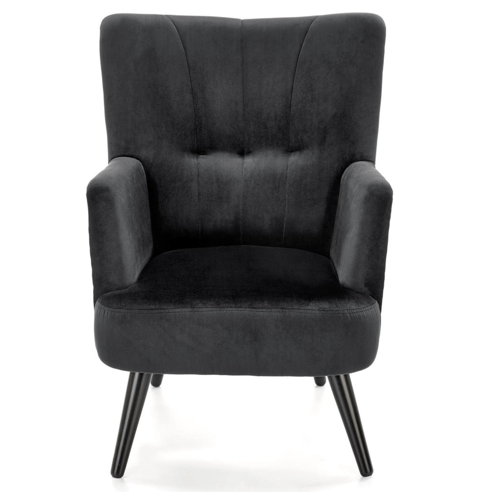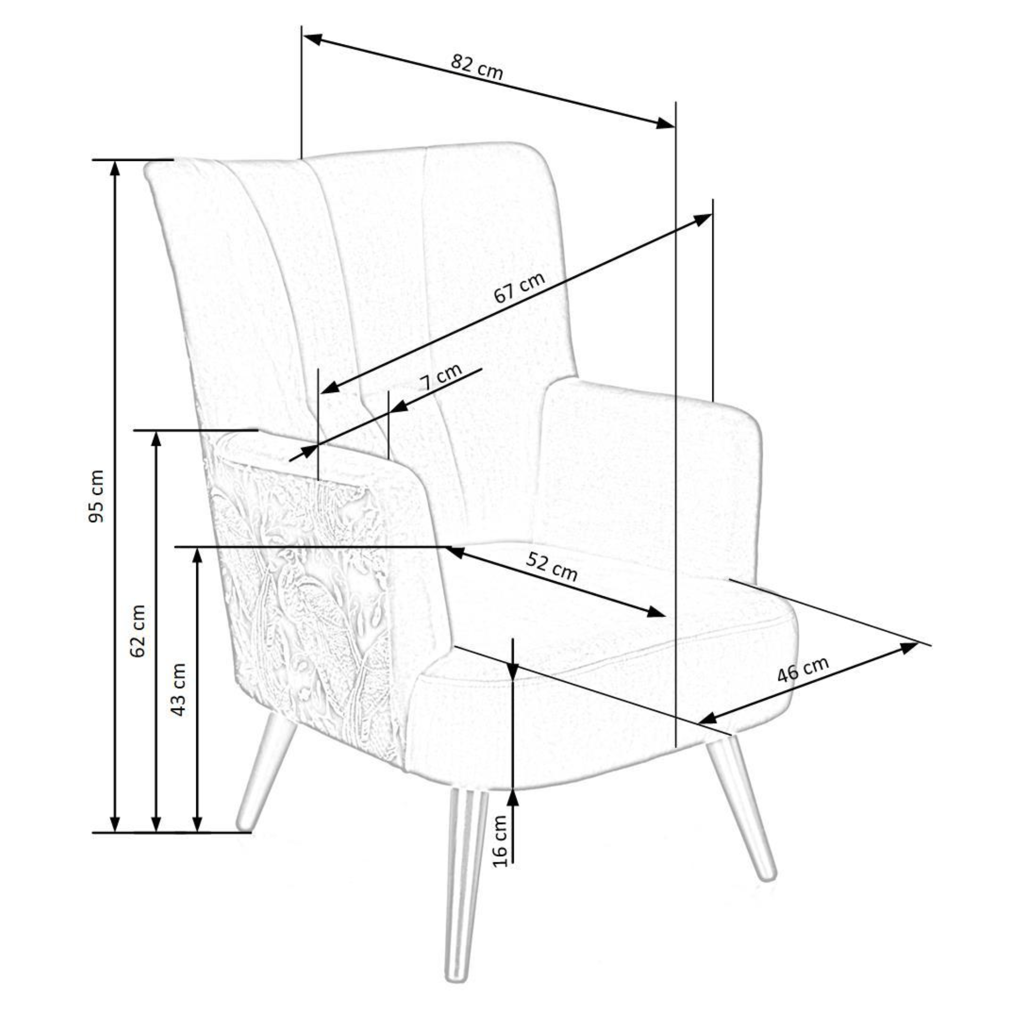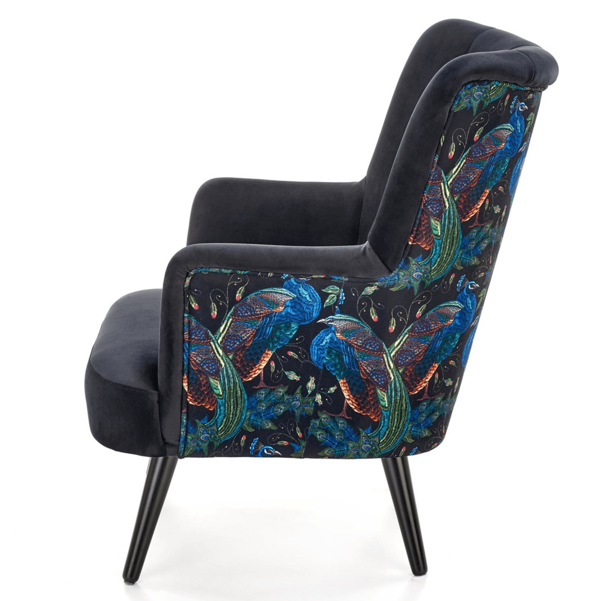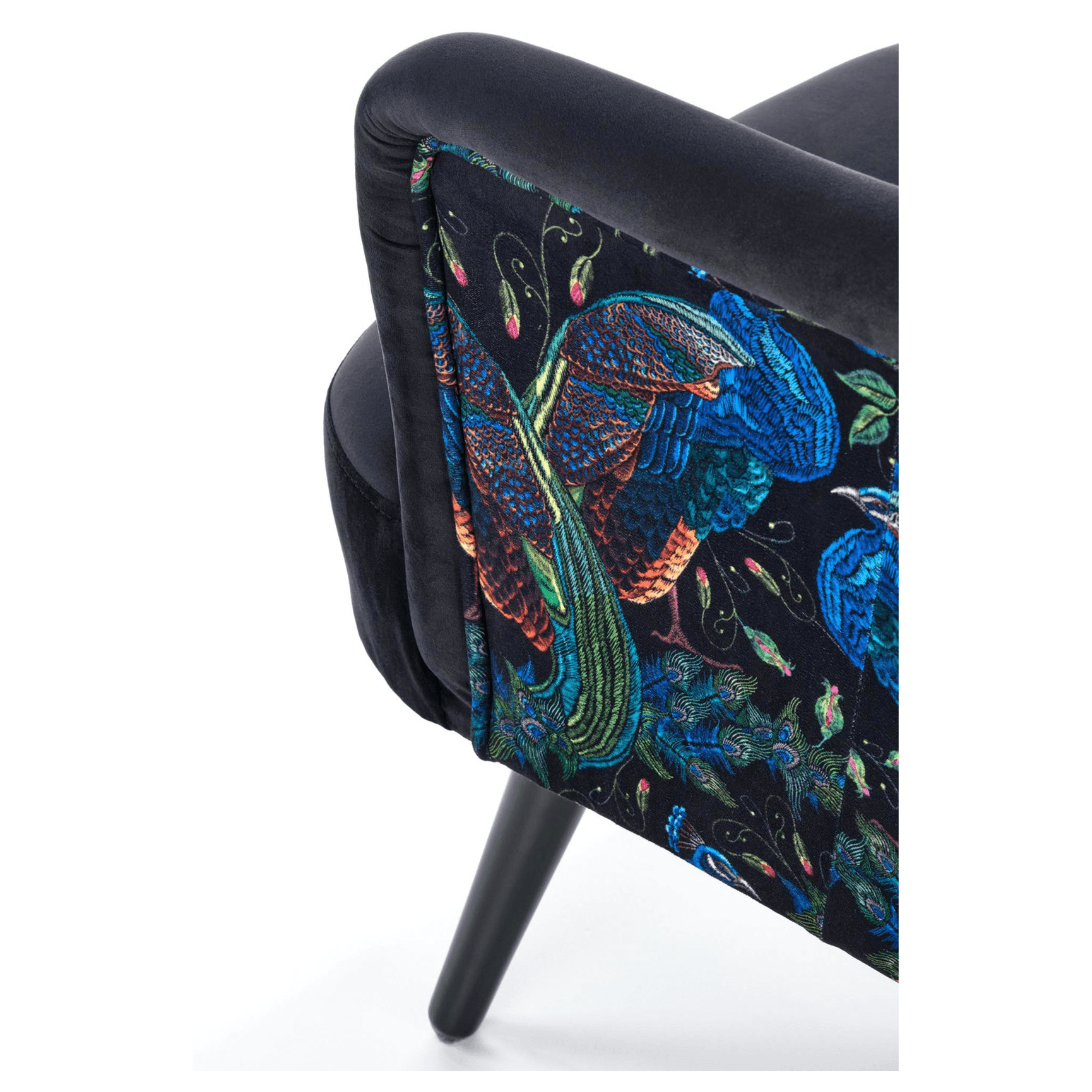 Svojím elegantným, ale napriek tomu výrazným vzhľadom skvele zapadne predovšetkým do moderných interiérov. Sedadlo spolu s operadlom sú potiahnuté zamatovo hladkou látkou príjemnou na dotyk. Priestranné sedadlo podopierajú čierne nohy vyrobené z masívneho dreva, ktoré dodávajú kreslu požadovanú stabilitu. Vďaka vysokému chrbtovému operadlu a pohodlne tvarovaným podrúčkam vám kreslo umožňuje dopriať si maximálne pohodlie. Operadlo je z prednej strany prešívané a doplnené o čalúnnické gombíky. Zadnú stranu kresla zdobí výrazný motív, ktorý z jednoduchého kresla vytvára nevšedný kus nábytku, ktorý ozvláštni akýkoľvek interiér.