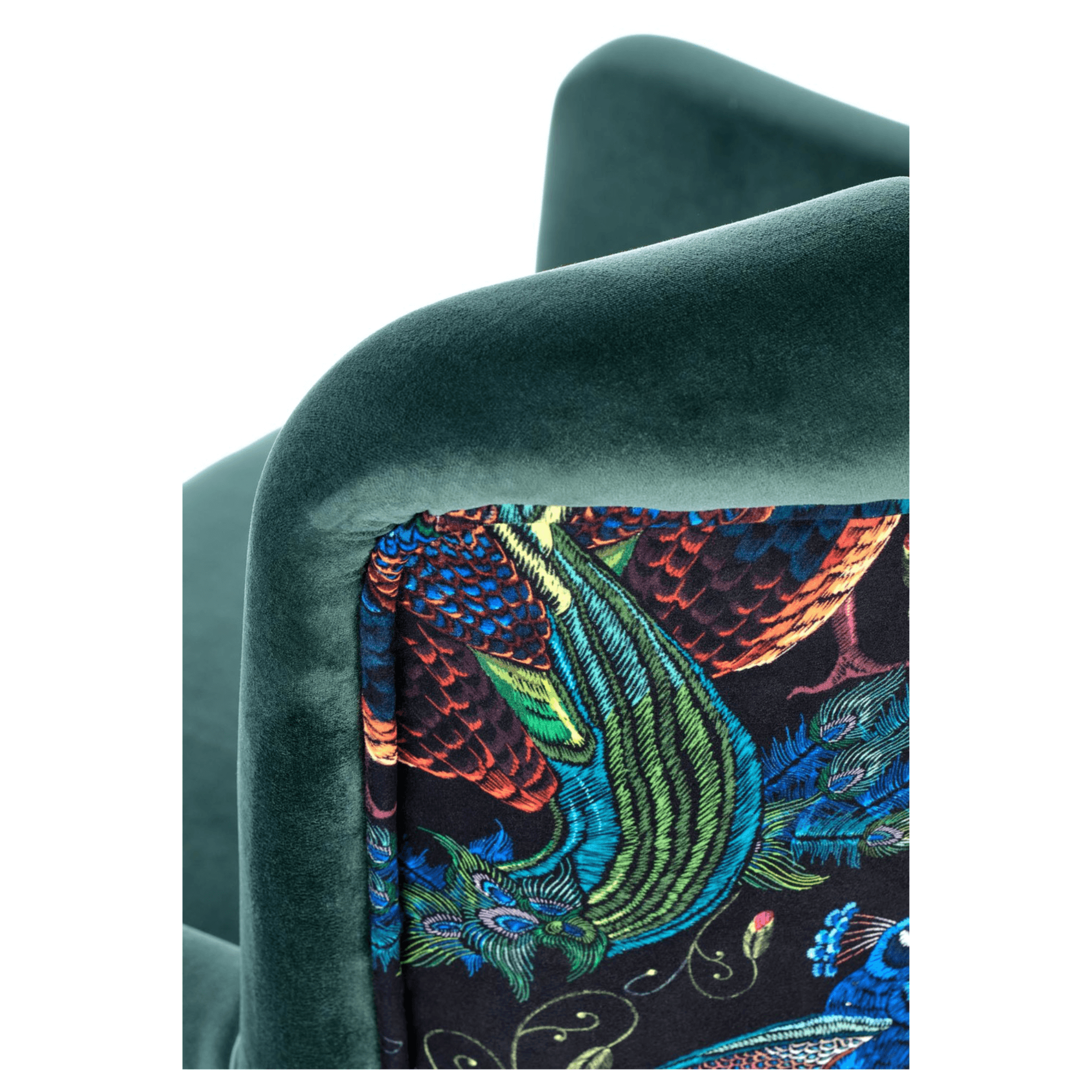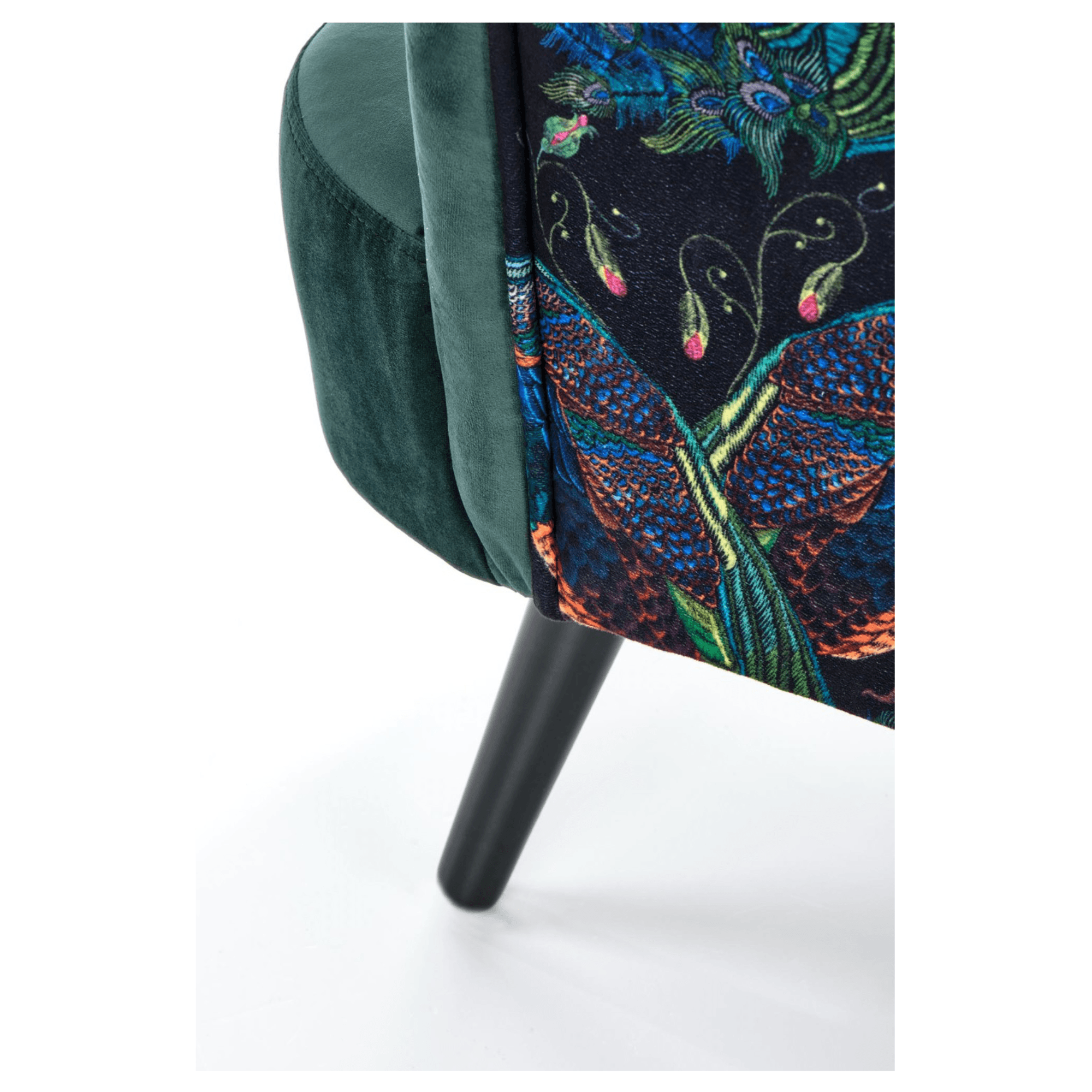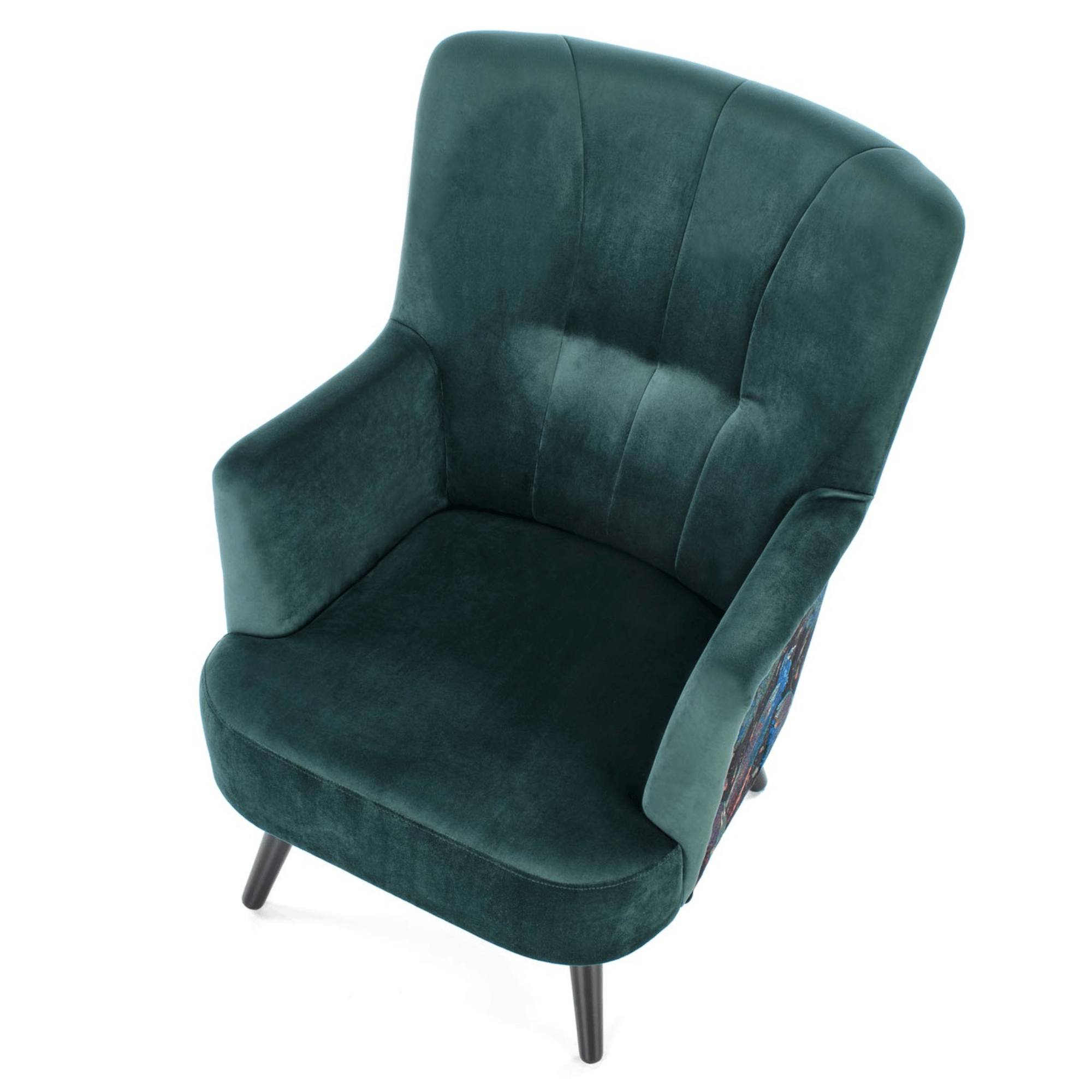 Svojím elegantným, ale napriek tomu výrazným vzhľadom skvele zapadne predovšetkým do moderných interiérov. Sedadlo spolu s operadlom sú potiahnuté zamatovo hladkou látkou príjemnou na dotyk. Priestranné sedadlo podopierajú čierne nohy vyrobené z masívneho dreva, ktoré dodávajú kreslu požadovanú stabilitu. Vďaka vysokému chrbtovému operadlu a pohodlne tvarovaným podrúčkam vám kreslo umožňuje dopriať si maximálne pohodlie. Operadlo je z prednej strany prešívané a doplnené o čalúnnické gombíky. Zadnú stranu kresla zdobí výrazný motív, ktorý z jednoduchého kresla vytvára nevšedný kus nábytku, ktorý ozvláštni akýkoľvek interiér.