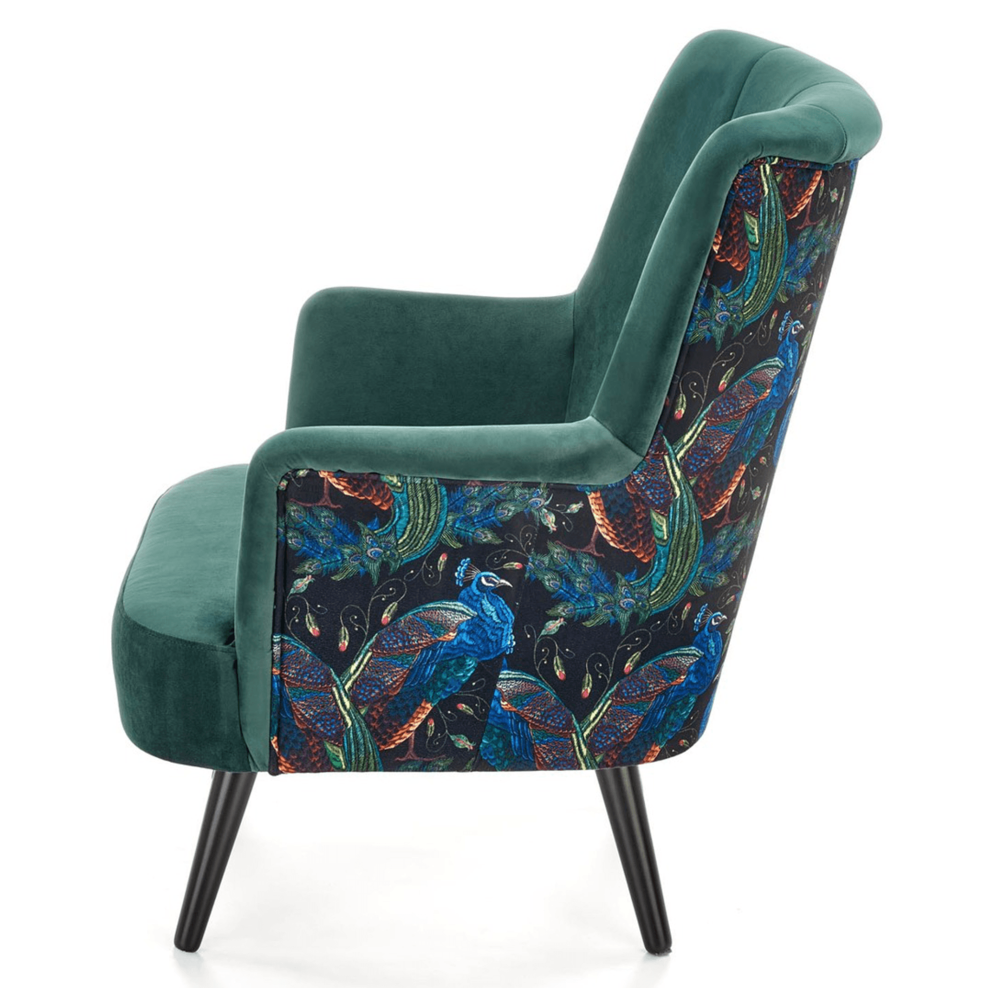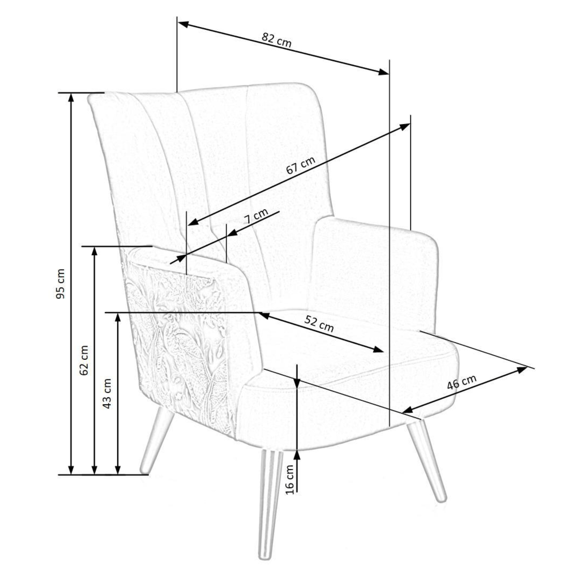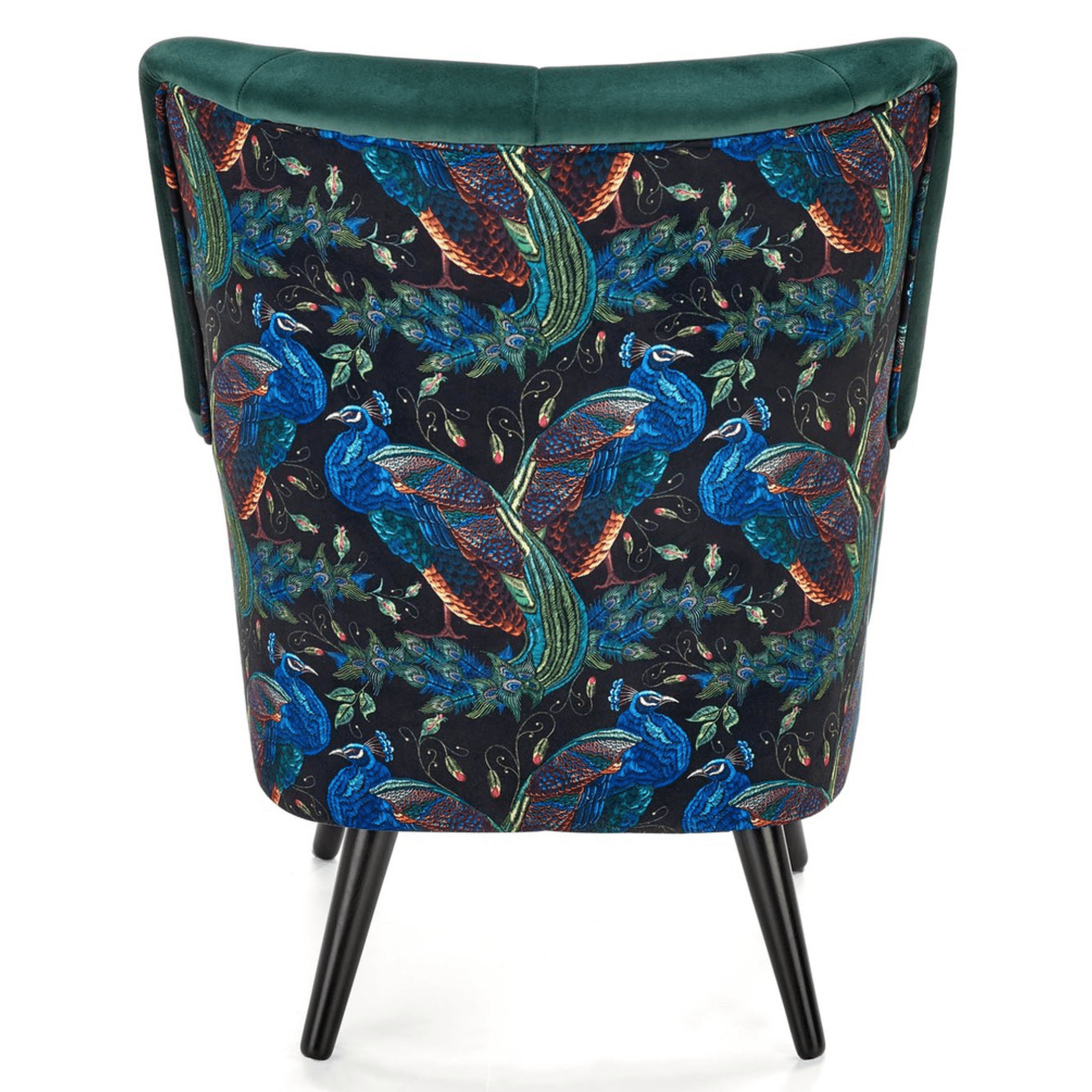 Svojím elegantným, ale napriek tomu výrazným vzhľadom skvele zapadne predovšetkým do moderných interiérov. Sedadlo spolu s operadlom sú potiahnuté zamatovo hladkou látkou príjemnou na dotyk. Priestranné sedadlo podopierajú čierne nohy vyrobené z masívneho dreva, ktoré dodávajú kreslu požadovanú stabilitu. Vďaka vysokému chrbtovému operadlu a pohodlne tvarovaným podrúčkam vám kreslo umožňuje dopriať si maximálne pohodlie. Operadlo je z prednej strany prešívané a doplnené o čalúnnické gombíky. Zadnú stranu kresla zdobí výrazný motív, ktorý z jednoduchého kresla vytvára nevšedný kus nábytku, ktorý ozvláštni akýkoľvek interiér.