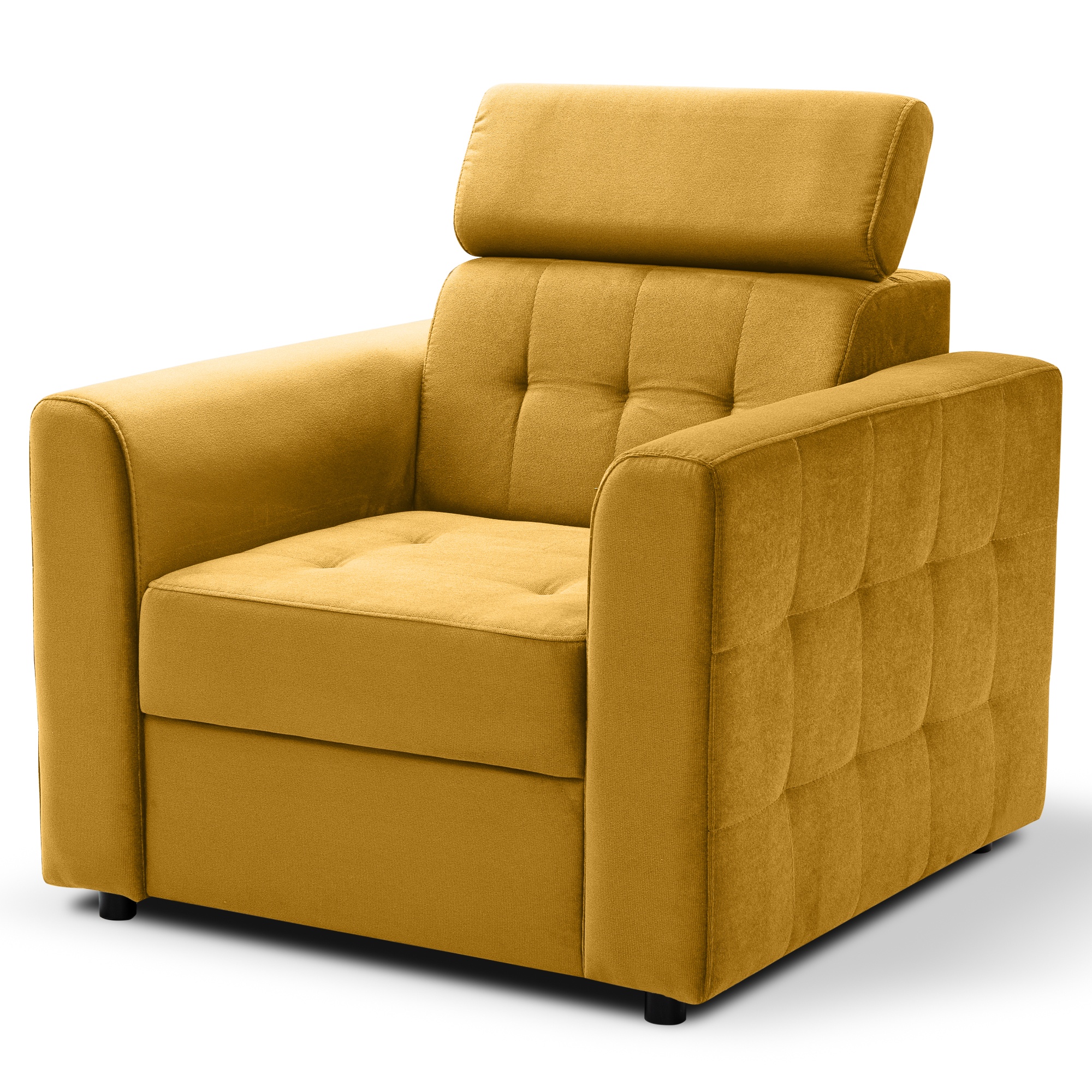 Pohodlie je zaistené vysokým operadlom s nastaviteľnou opierkou hlavy a praktickými podrúčkami. Sedák je vybavený pružinovým jadrom spojeným s mäkkou penovou výplňou, ktorá vám poskytne maximálny komfort. Je potiahnuté príjemnou látkou zamatového vzhľadu, jemnou na dotyk. Vďaka krátkemu hladkému vlasu má jemný trblietavý odlesk. Zaujme svojím elegantným prešívaním, ktoré v kombinácii s látkou vytvára luxusný nádych kresla. Je doplnené malými nožičkami, ktoré uľahčia upratovanie.