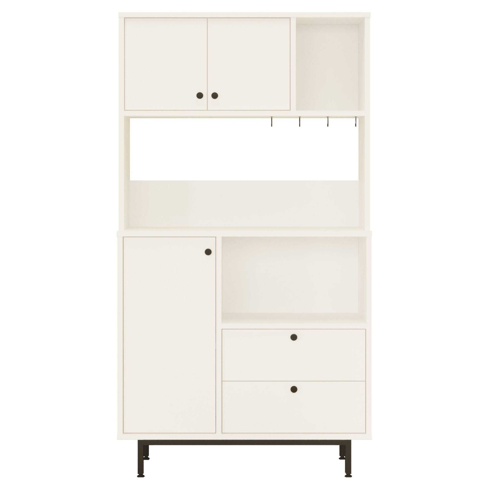 Skrinka je vybavená 1 vloženou policou ukrytou za dvierkami a 2 zásuvkami. Nechýba ani priestor na mikrovlnnú rúru. Aby sa s dvierkami a zásuvkami ľahšie manipulovalo, sú vybavené rúčkami.