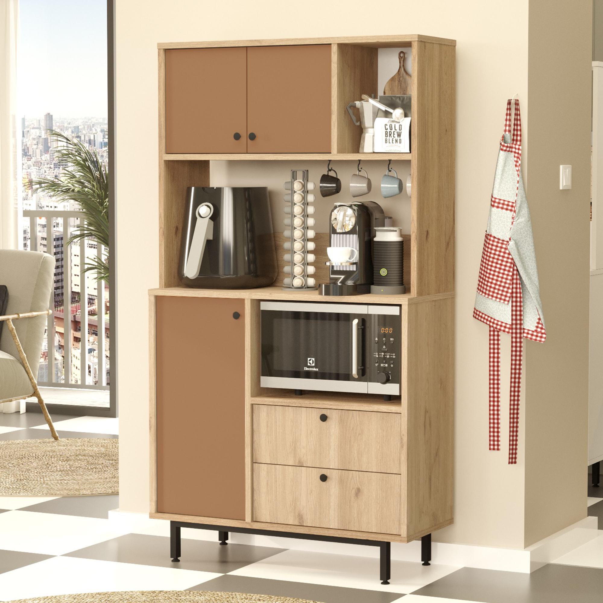 Skrinka je vybavená 1 vloženou policou ukrytou za dvierkami a 2 zásuvkami. Nechýba ani priestor na mikrovlnnú rúru. Aby sa s dvierkami a zásuvkami ľahšie manipulovalo, sú vybavené rúčkami.