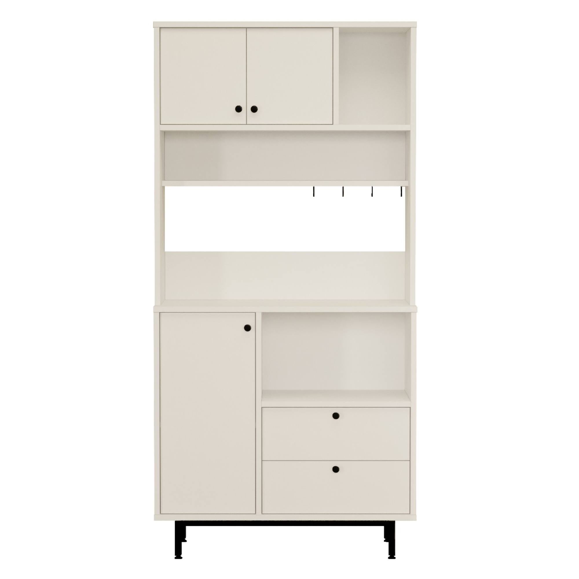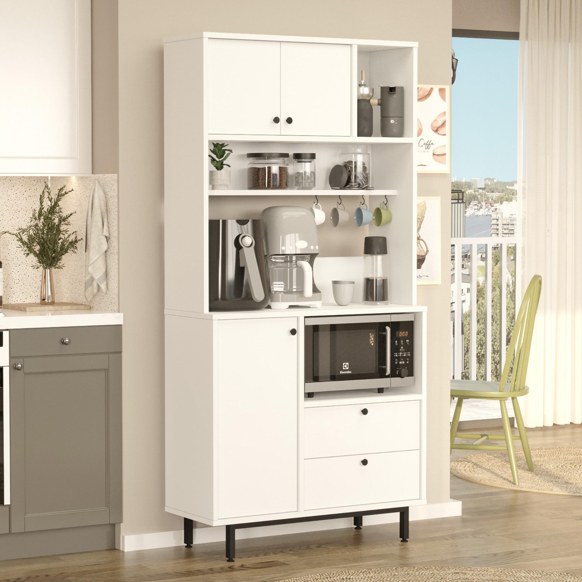 Skrinka je vybavená 2 vloženými policami, z ktorých 1 je ukrytá za dvierkami, 2 zásuvkami a 4 háčikmi. Nechýba ani priestor na mikrovlnnú rúru. Aby sa s dvierkami a zásuvkami ľahšie manipulovalo, sú vybavené rúčkami.