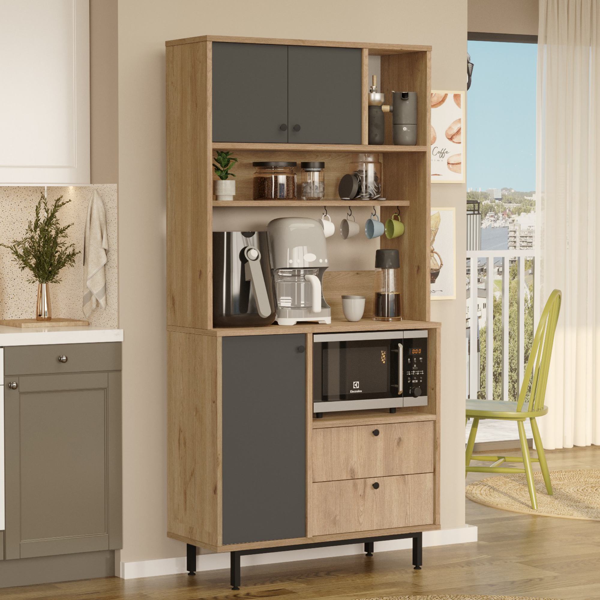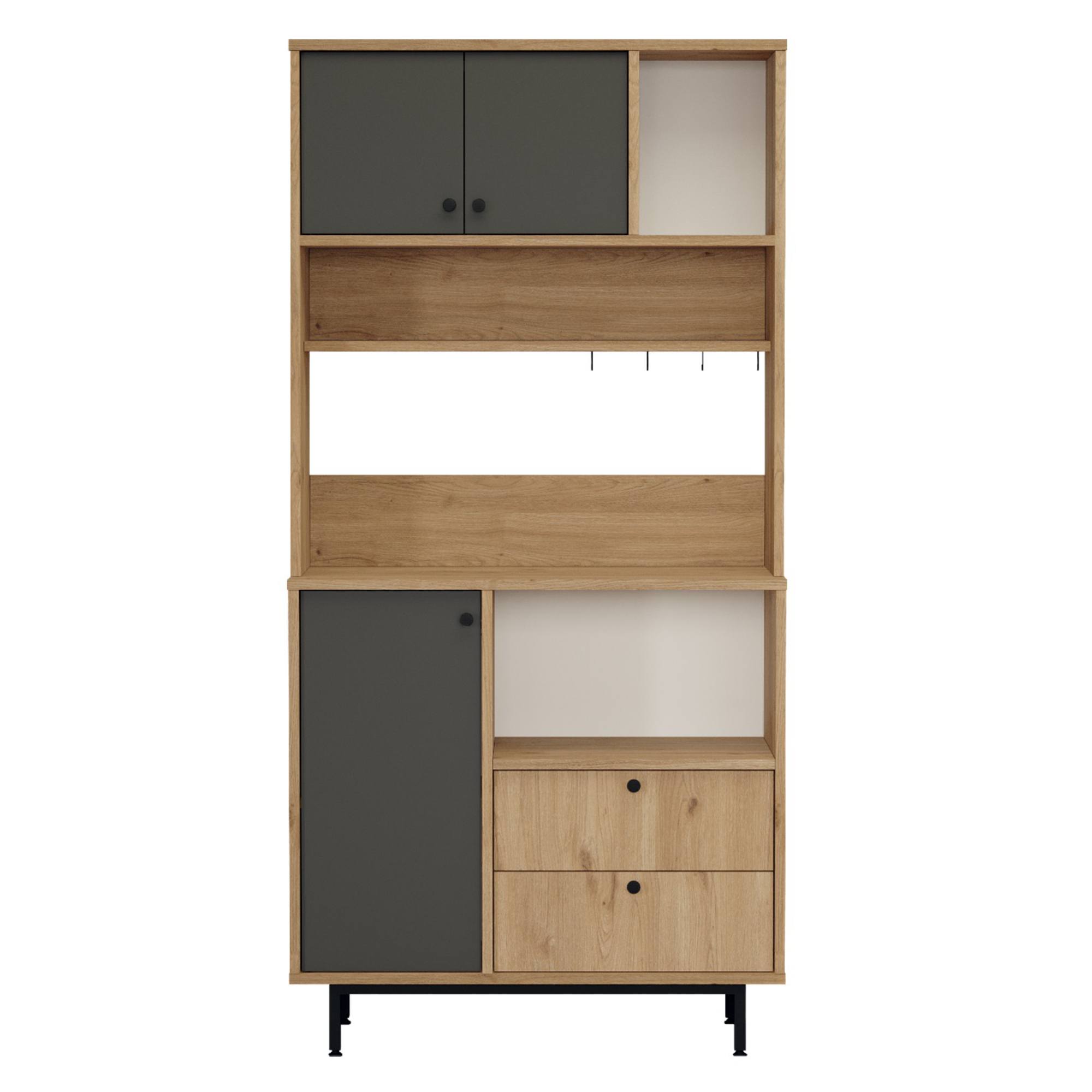 Skrinka je vybavená 2 vloženými policami, z ktorých 1 je ukrytá za dvierkami, 2 zásuvkami a 4 háčikmi. Nechýba ani priestor na mikrovlnnú rúru. Aby sa s dvierkami a zásuvkami ľahšie manipulovalo, sú vybavené rúčkami.