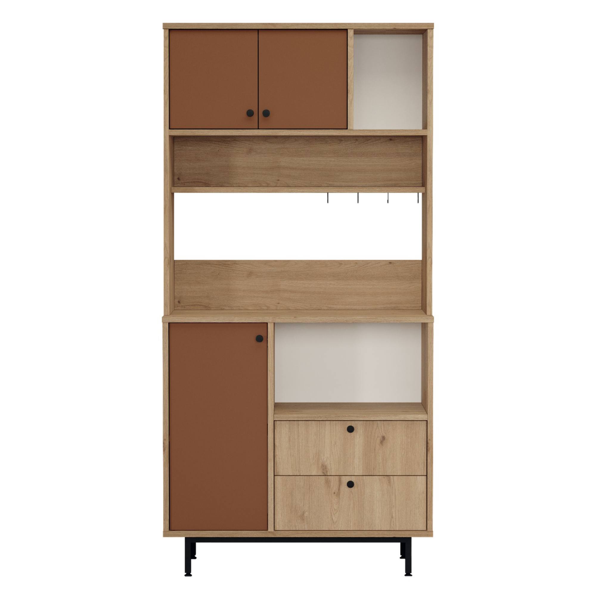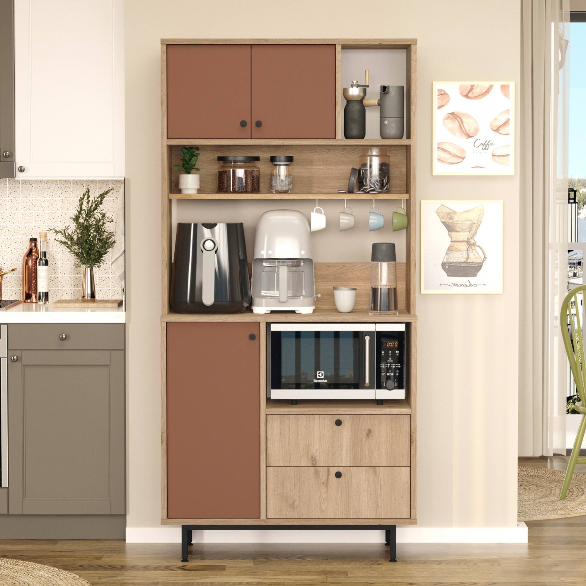 Skrinka je vybavená 2 vloženými policami, z ktorých 1 je ukrytá za dvierkami, 2 zásuvkami a 4 háčikmi. Nechýba ani priestor na mikrovlnnú rúru. Aby sa s dvierkami a zásuvkami ľahšie manipulovalo, sú vybavené rúčkami.