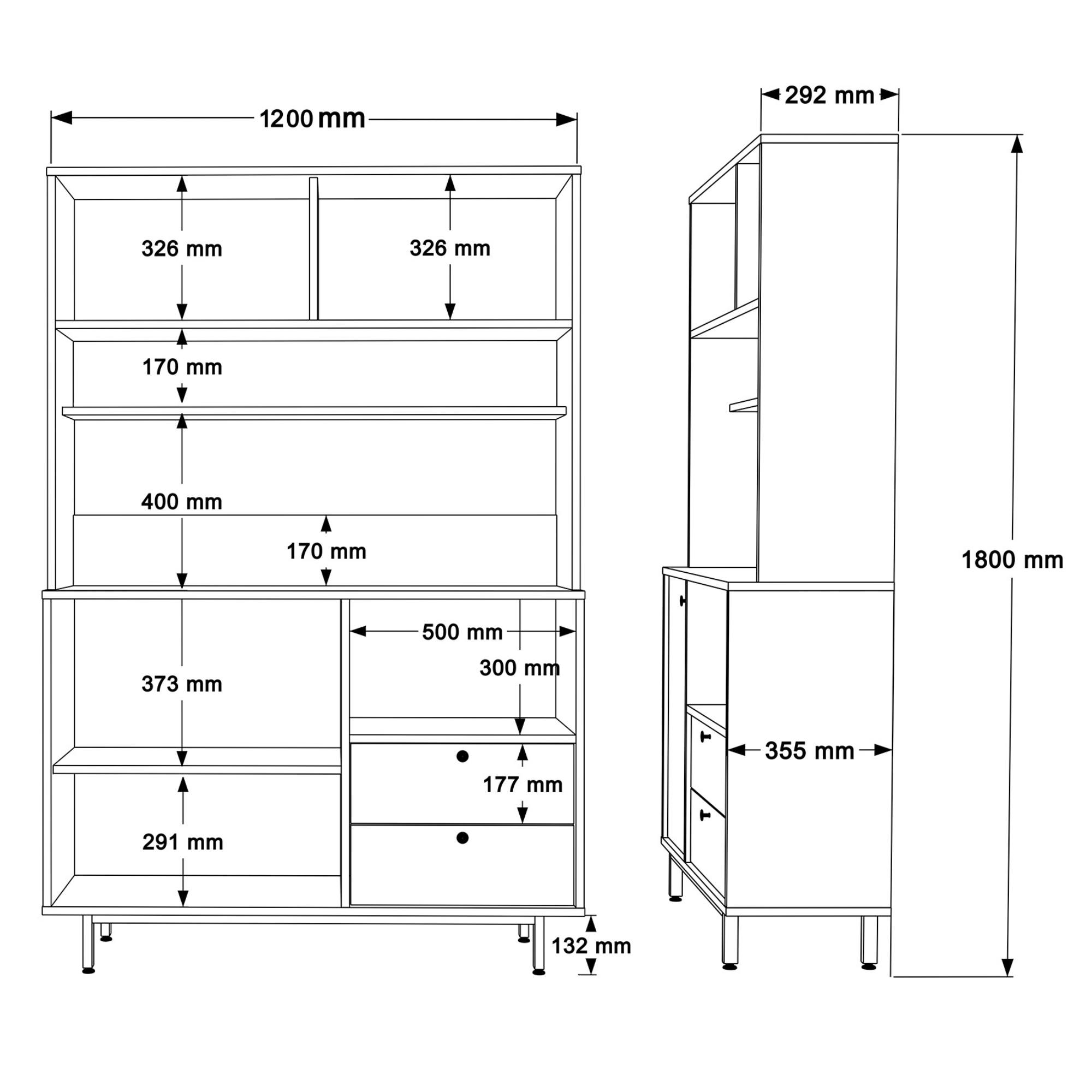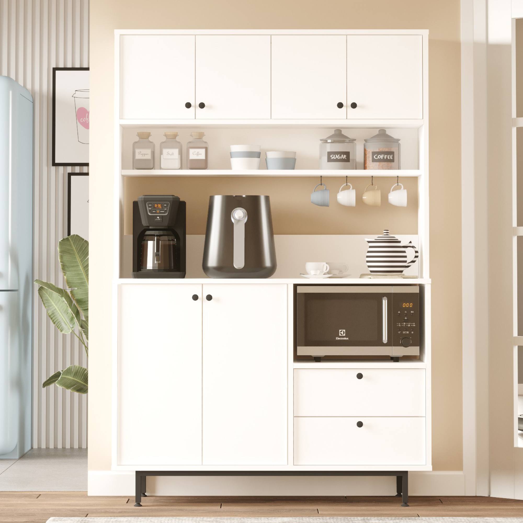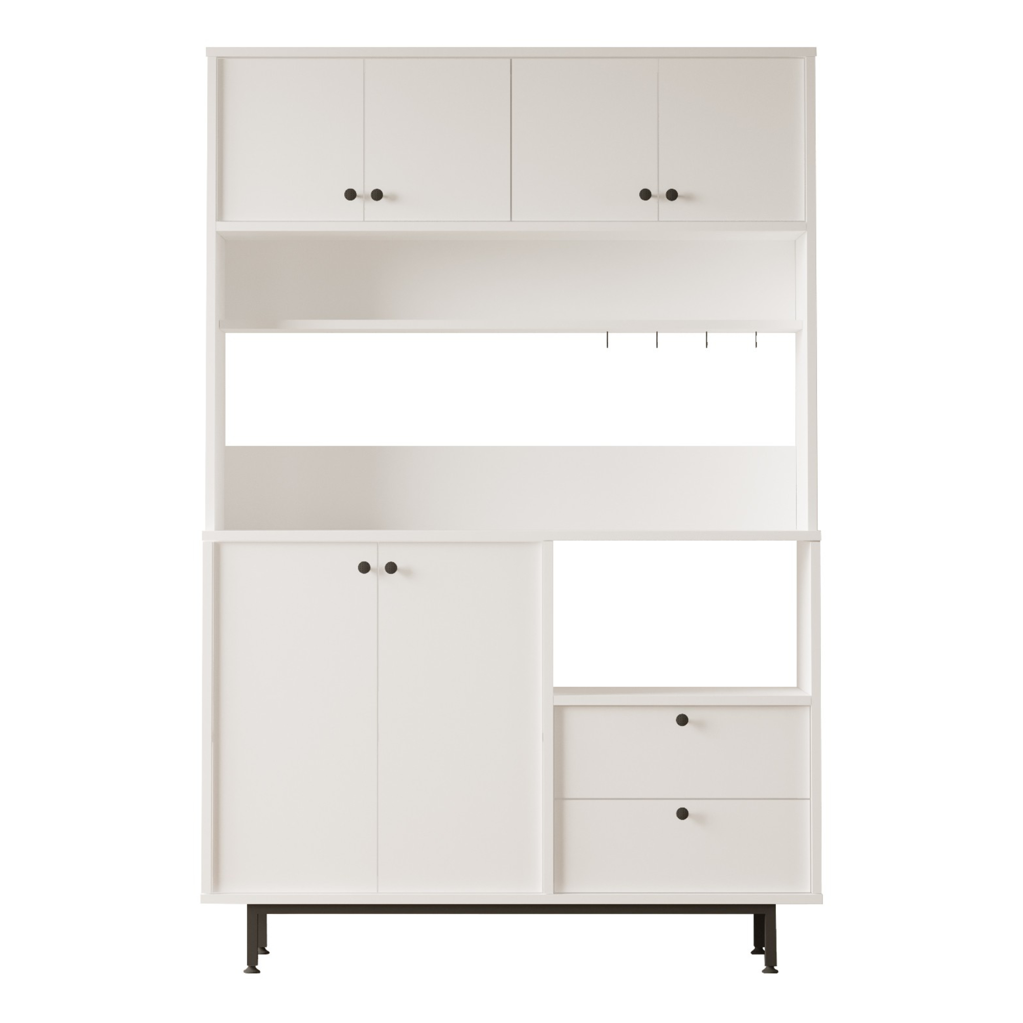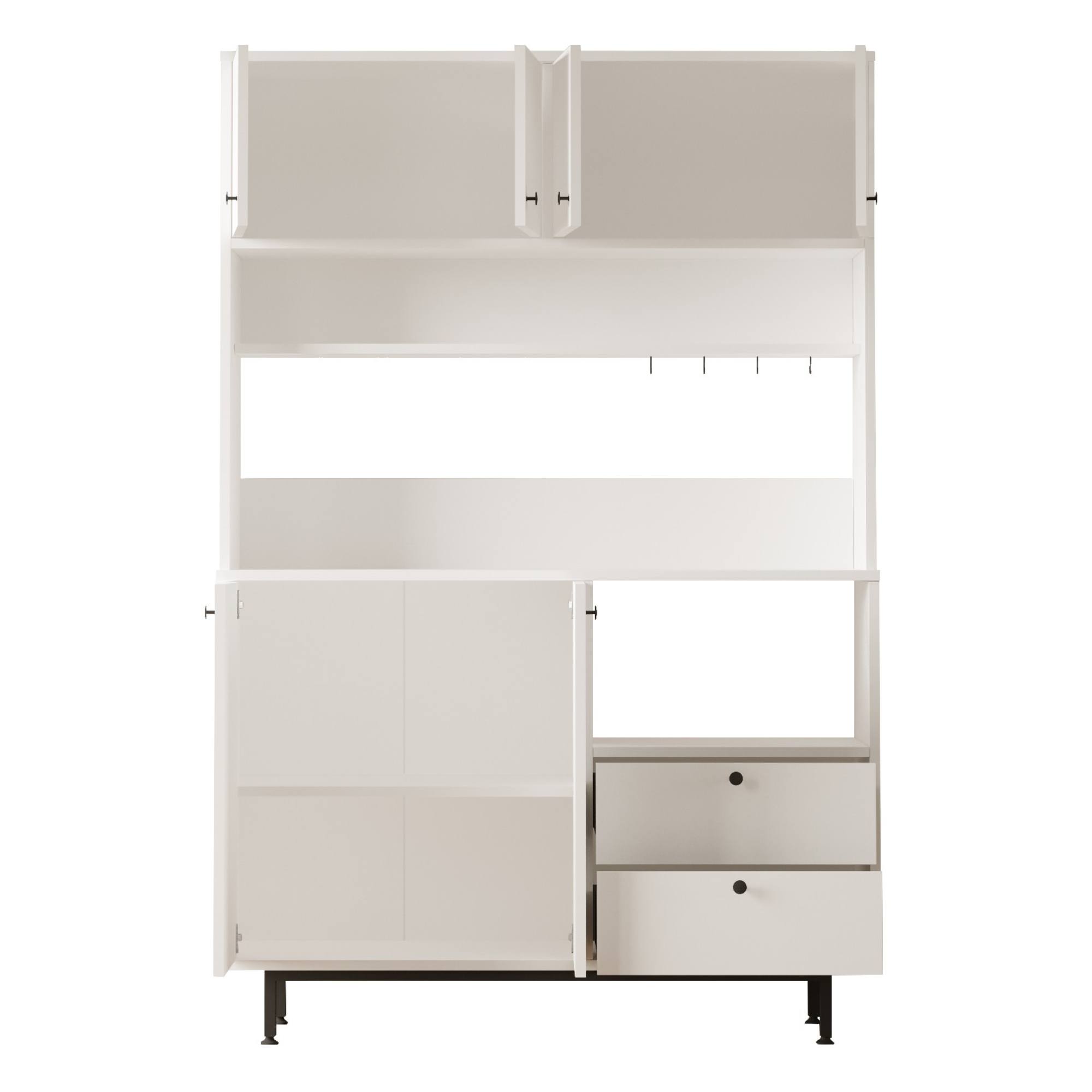 Skrinka je vybavená 2 vloženými policami, z ktorých 1 je ukrytá za dvierkami, 2 zásuvkami a 4 háčikmi. Nechýba ani priestor na mikrovlnnú rúru. Aby sa s dvierkami a zásuvkami ľahšie manipulovalo, sú vybavené rúčkami.