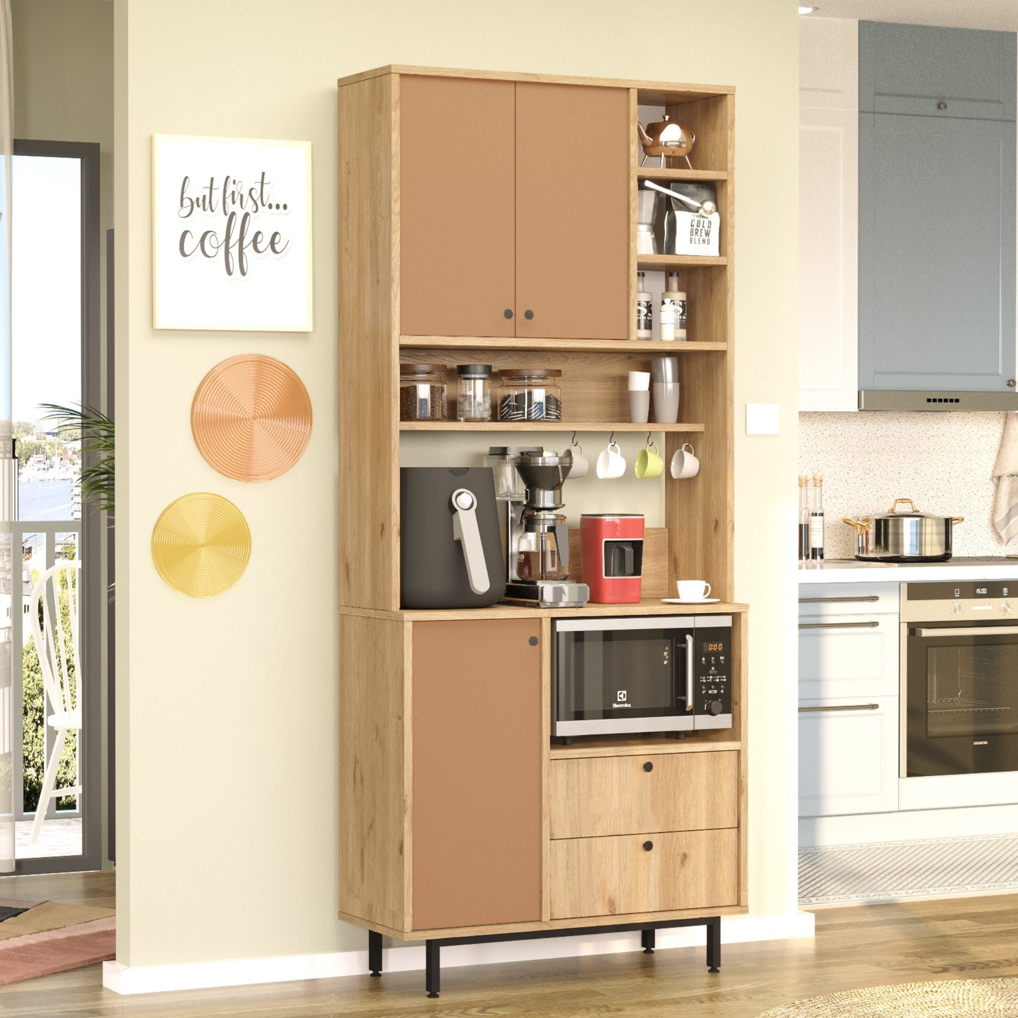 Skrinka je vybavená 7 vloženými policami, z ktorých 2 sú ukryté za dvierkami. Obsahuje tiež 2 zásuvky a 4 háčiky kam umiestnite ďalšie menšie predmety. Nechýba ani priestor na mikrovlnnú rúru. Aby sa s dvierkami a zásuvkami ľahšie manipulovalo, sú vybavené kovovými rúčkami.