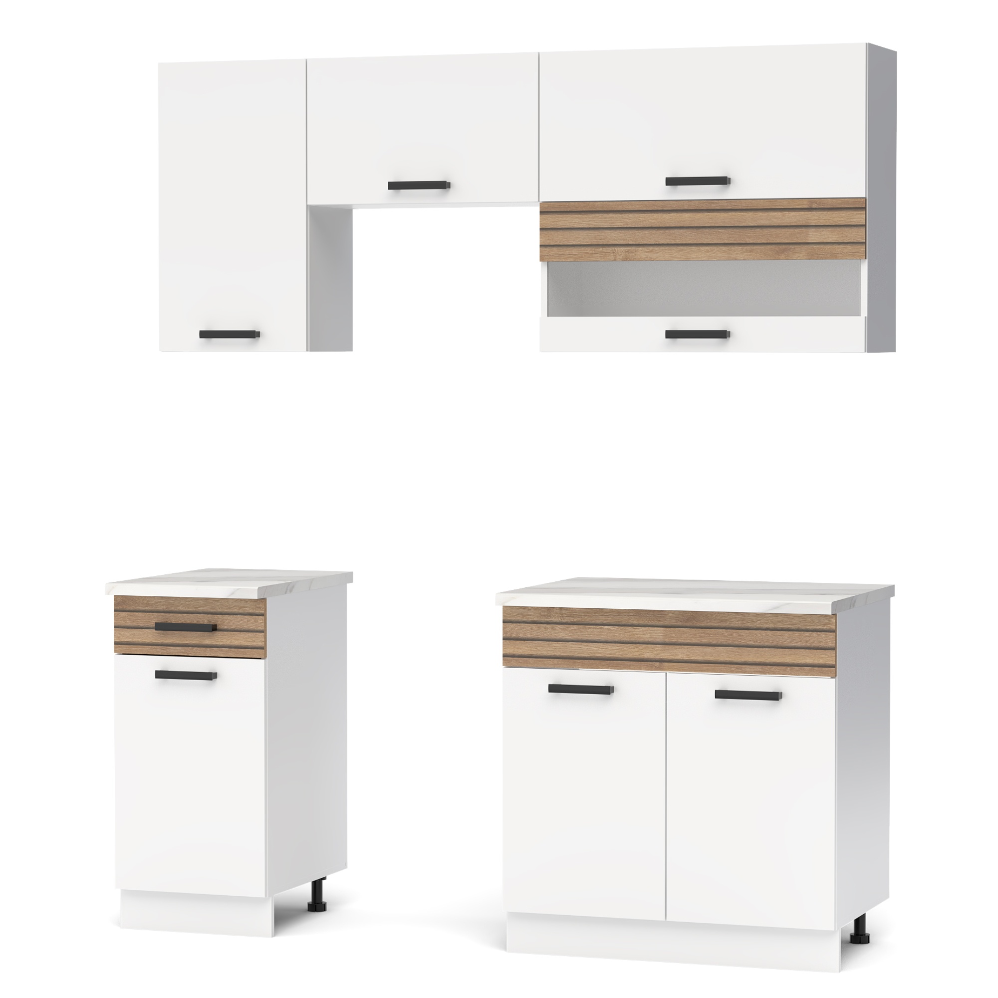 Horná časť bloku sa skladá z 2 horných skriniek, z ktorých 1 je vybavená 2 policami, a z 1 skrinky nad digestor. Spodná časť je tvorená 2 skrinkami, z ktorých 1 disponuje 1 vloženou policou a 1 zásuvkou. Aby sa s dvierkami a zásuvkou dobre manipulovalo, sú ich súčasťou čierne rúčky.