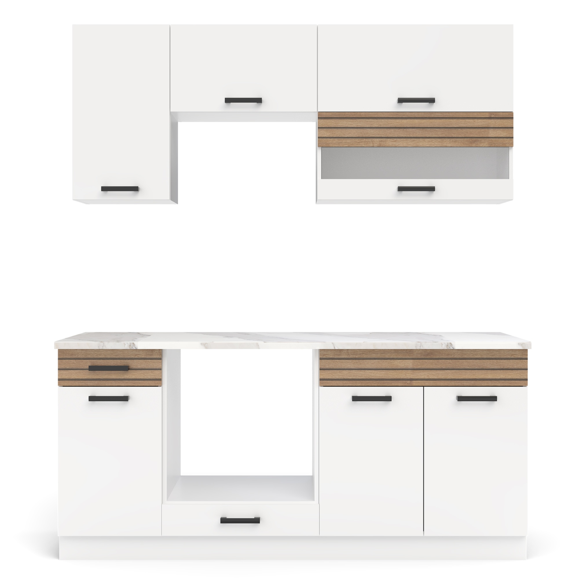 Horná časť bloku sa skladá z 2 horných skriniek, z ktorých 1 je vybavená 2 policami, a z 1 skrinky nad digestor. Spodná časť je tvorená 2 spodnými skrinkami, z ktorých 1 disponuje 1 vloženou policou a 1 zásuvkou, a 1 skrinkou na rúru. Tá ponúka priestor pre plechy uzatvárateľný výklopnými dvierkami. Aby sa s dvierkami a zásuvkou dobre manipulovalo, sú ich súčasťou čierne rúčky.