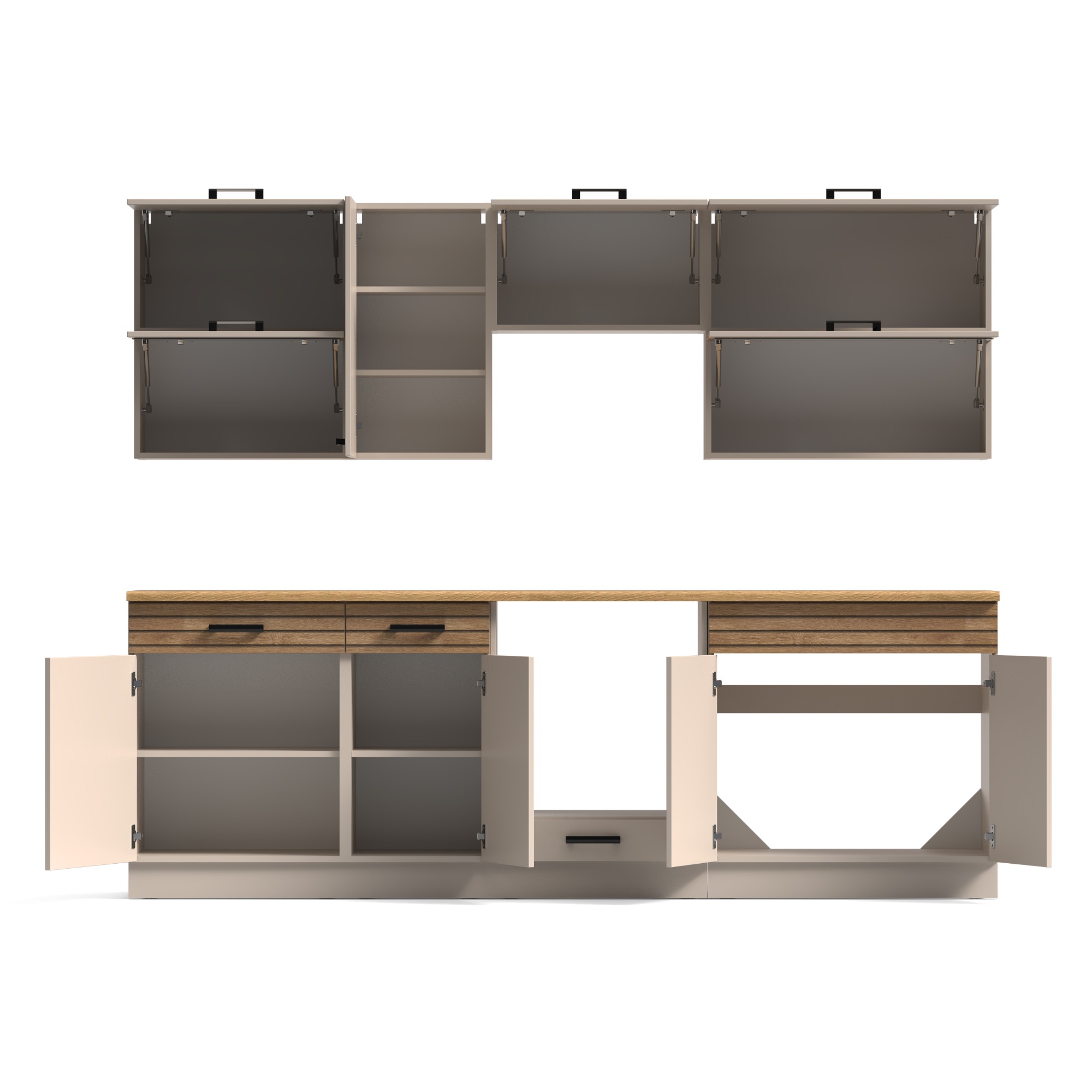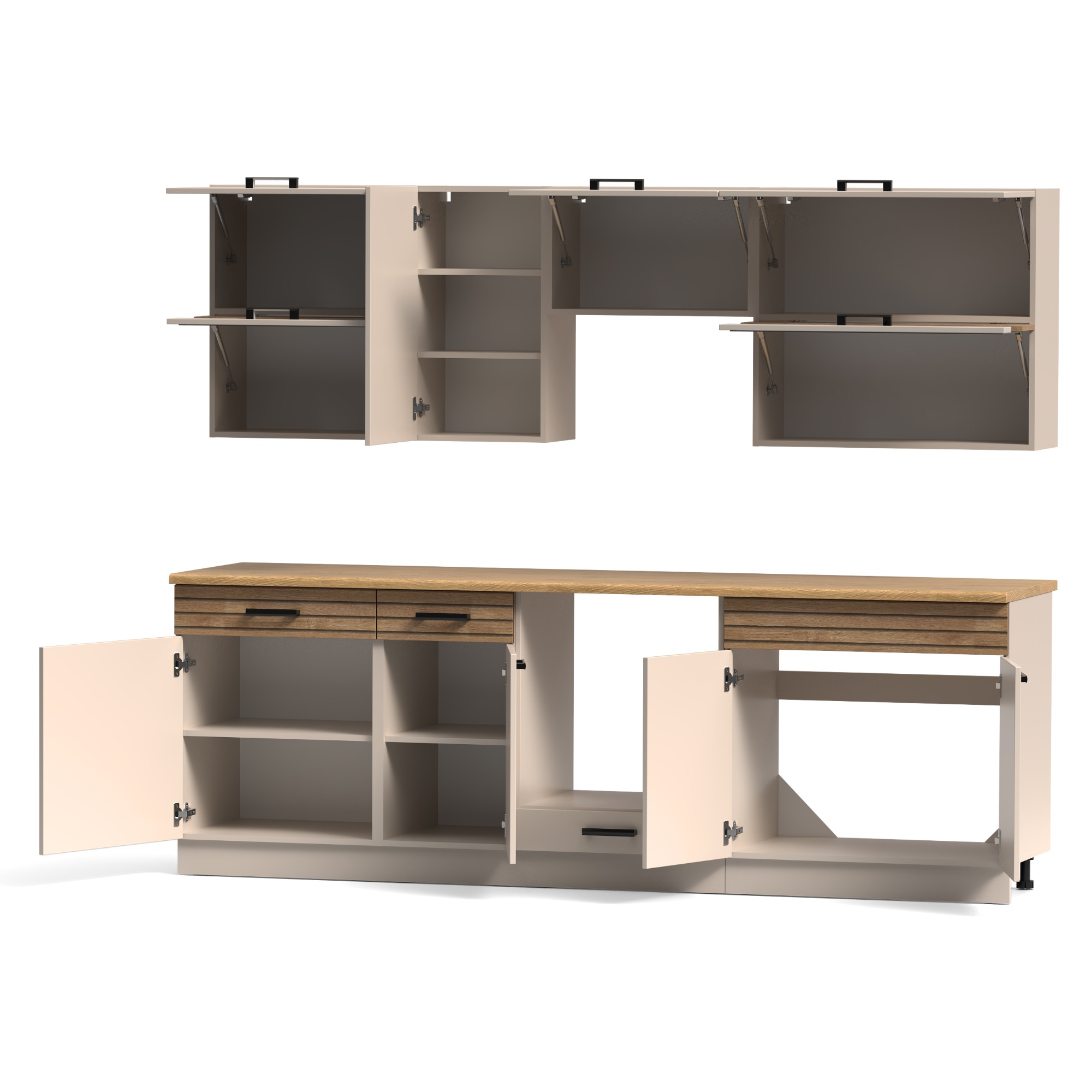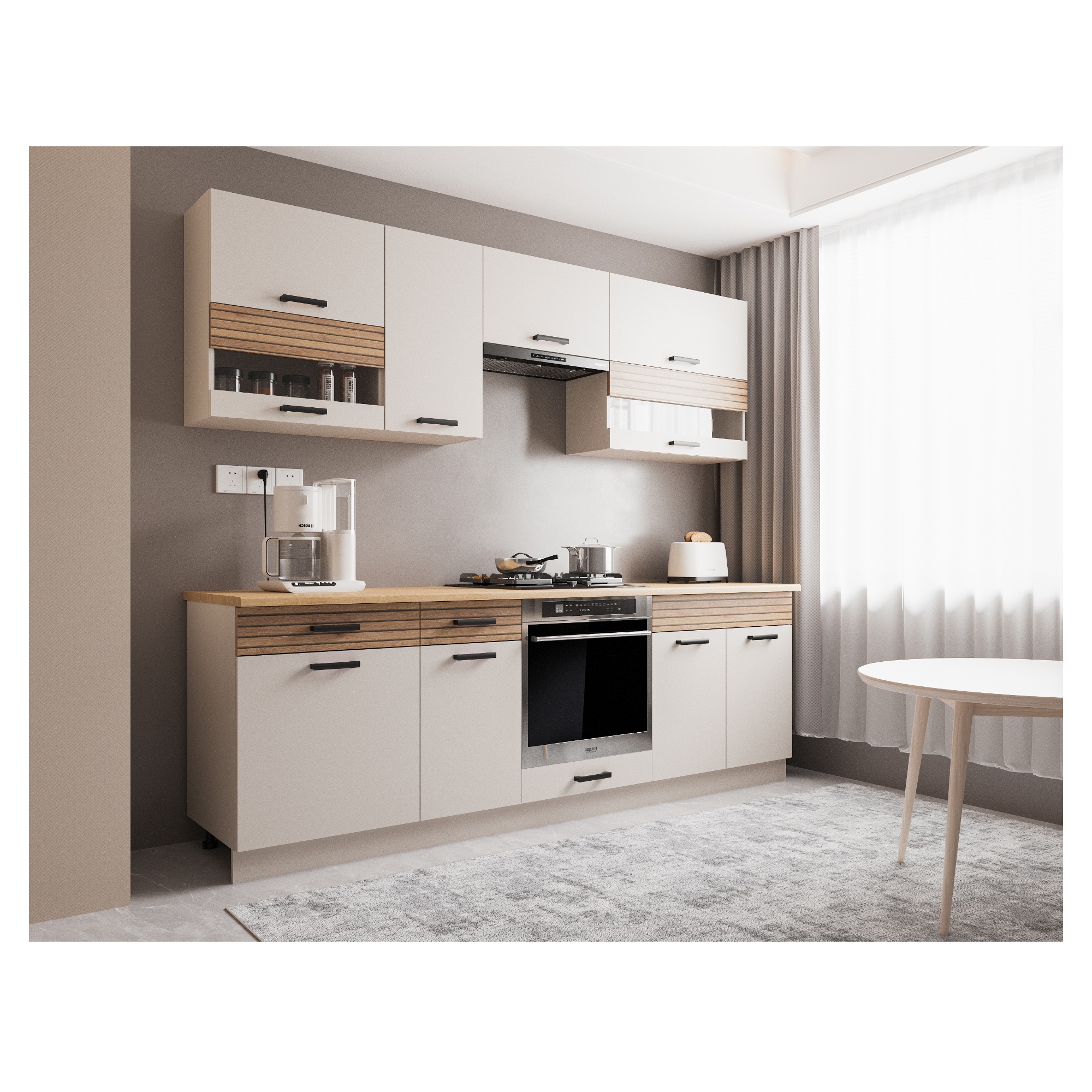 Horná časť bloku sa skladá z 3 horných skriniek, z ktorých 1 je vybavená 2 policami, a z 1 skrinky nad digestor. Spodná časť je tvorená 3 spodnými skrinkami, z ktorých 2 disponujú 1 vloženou policou a 1 zásuvkou, a 1 skrinkou na rúru. Tá ponúka priestor pre plechy uzatvárateľný výklopnými dvierkami. Aby sa s dvierkami a zásuvkami dobre manipulovalo, sú ich súčasťou čierne rúčky.