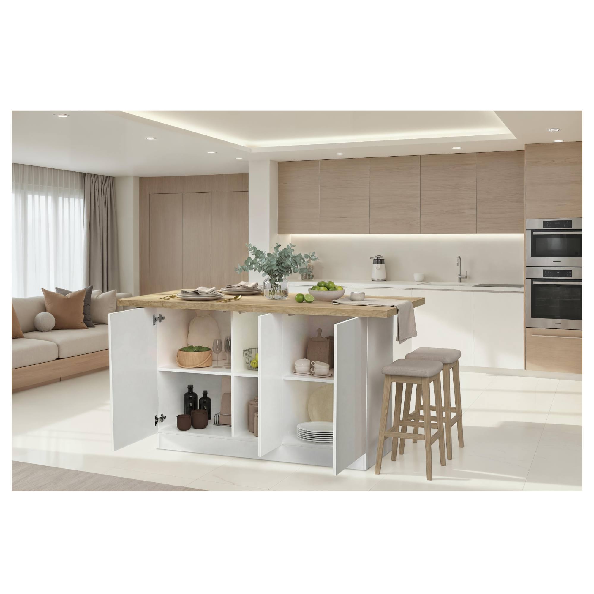 Ostrovček poskytne dodatočný úložný priestor pre všetko, čo potrebujete mať v kuchyni po ruke. Okrem pracovnej dosky disponuje tiež 3 vloženými policami, ktoré sú umiestnené za bezrúčkovými dvierkami.