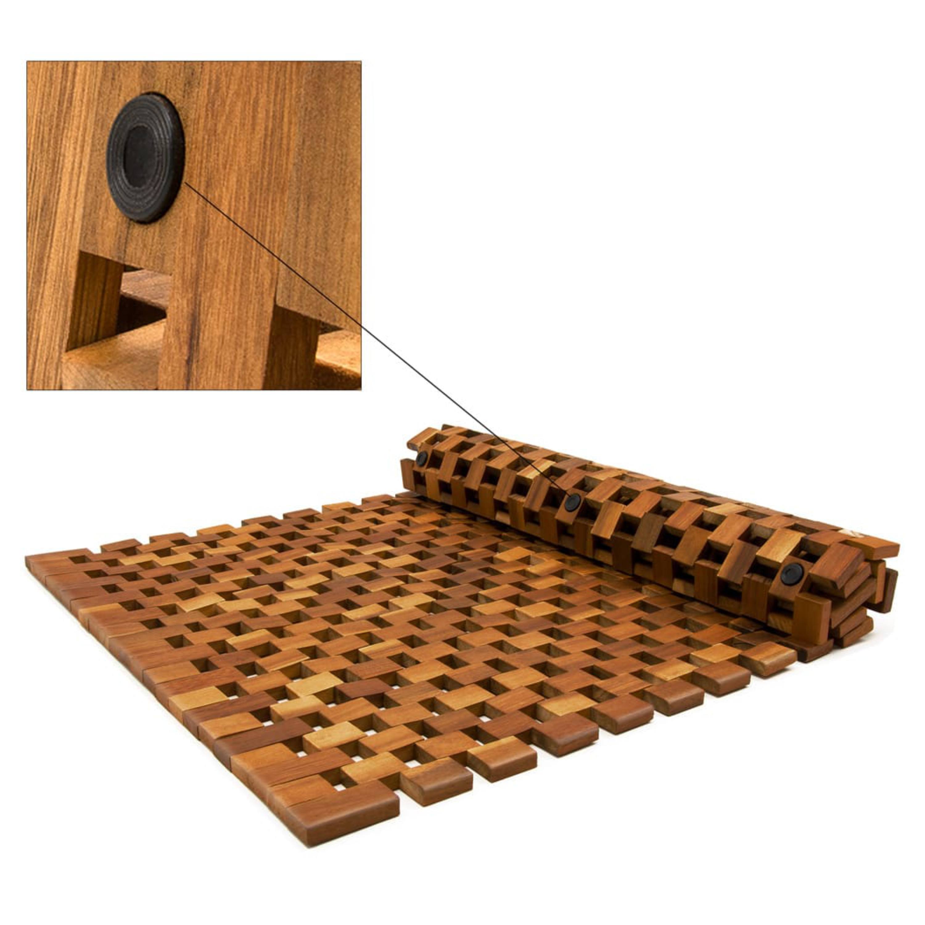 Vyrobená je z akáciového dreva a jej povrch je dodatočne olejovaný, čo zvyšuje odolnosť voči vlhkosti a poveternostným vplyvom. Konštrukcia zabezpečuje dobrú cirkuláciu vzduchu a rýchlejšie schnutie, čo prispieva k hygienickému používaniu. Na spodnej strane sú umiestnené protišmykové gumové chrániče podlahy, ktoré zároveň držia predložku na mieste.