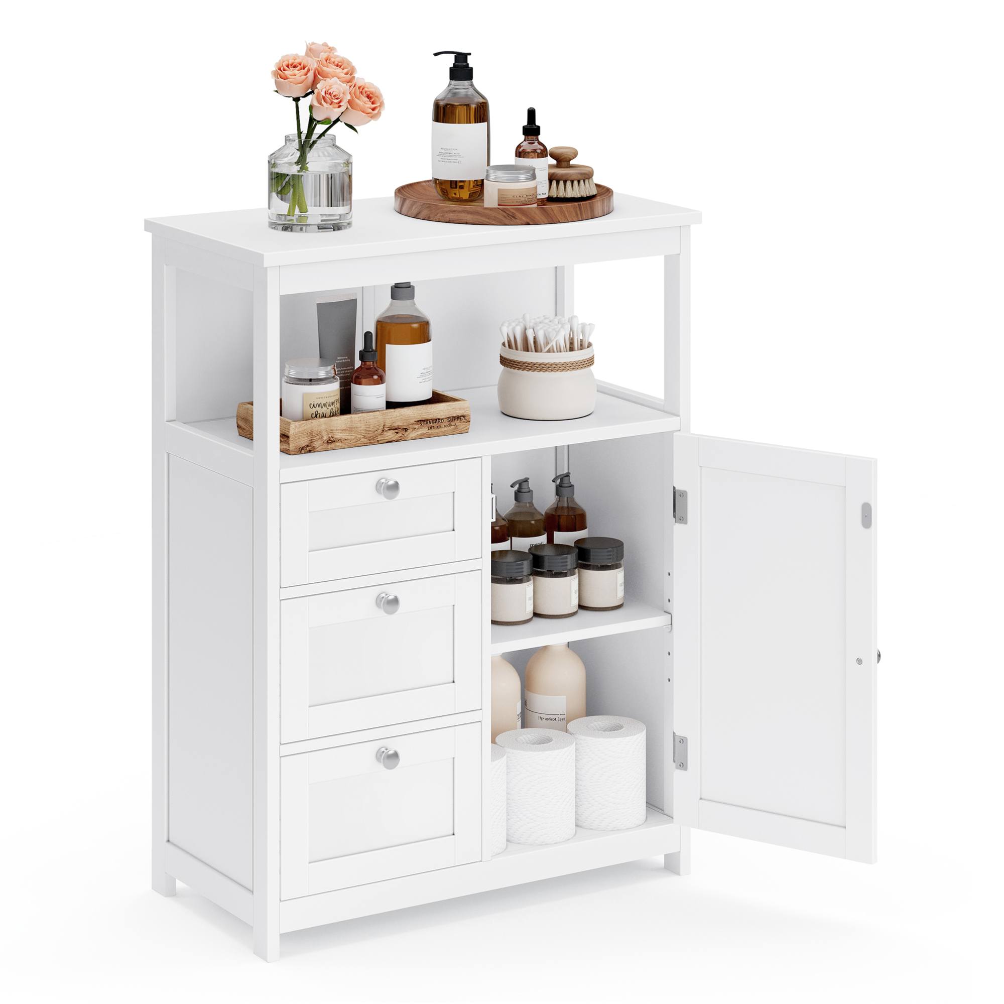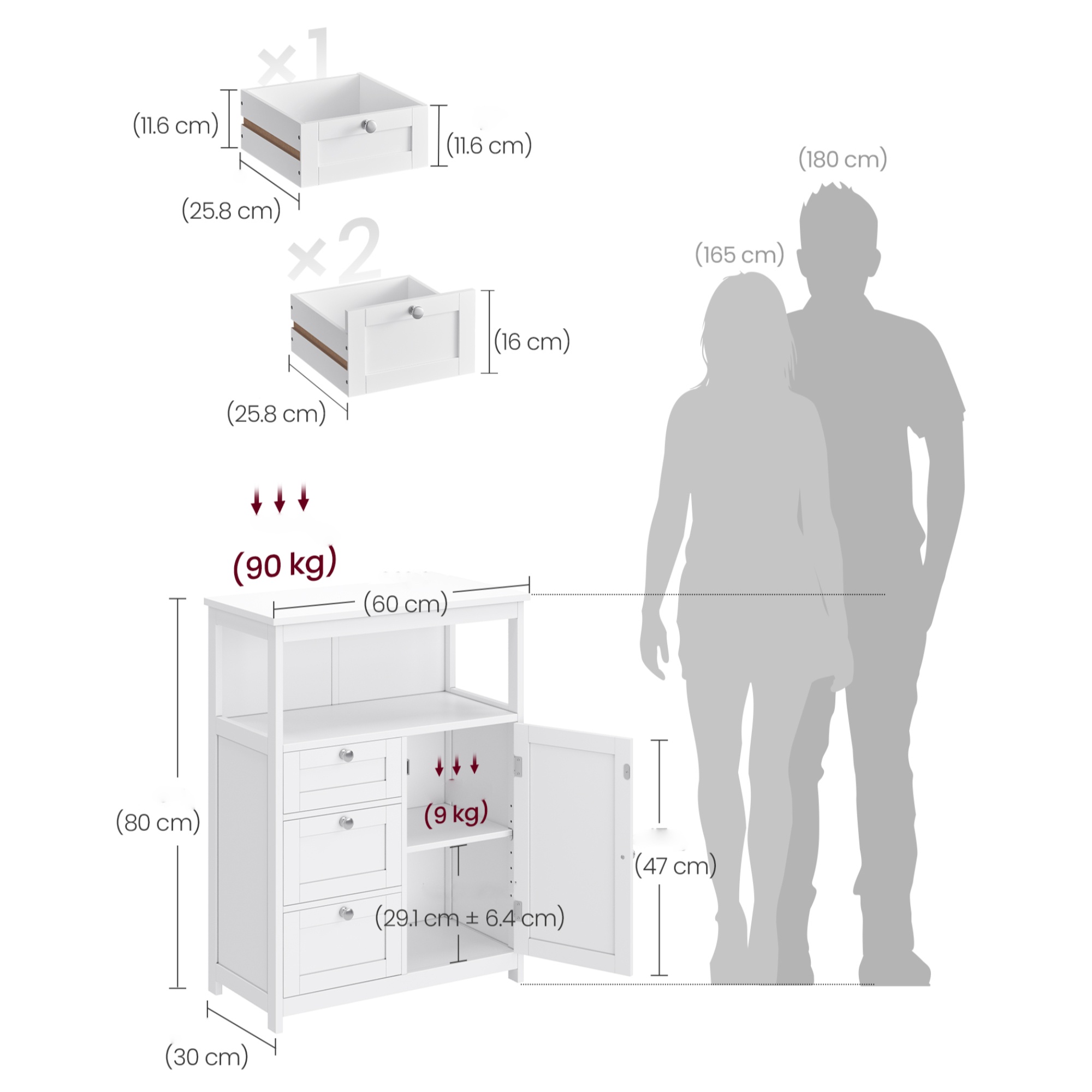 Jej súčasťou sú nielen 3 zásuvky, ale aj 1 nastaviteľná vložená polica, ktorú je možné umiestniť do 5 rôznych výšok. Zásuvky sú vybavené plastovými záchytkami, ktoré zabraňujú ich vypadnutiu zo skrinky počas manipulácie. Na zásuvkách a dvierkach sa nachádzajú praktické rúčky.