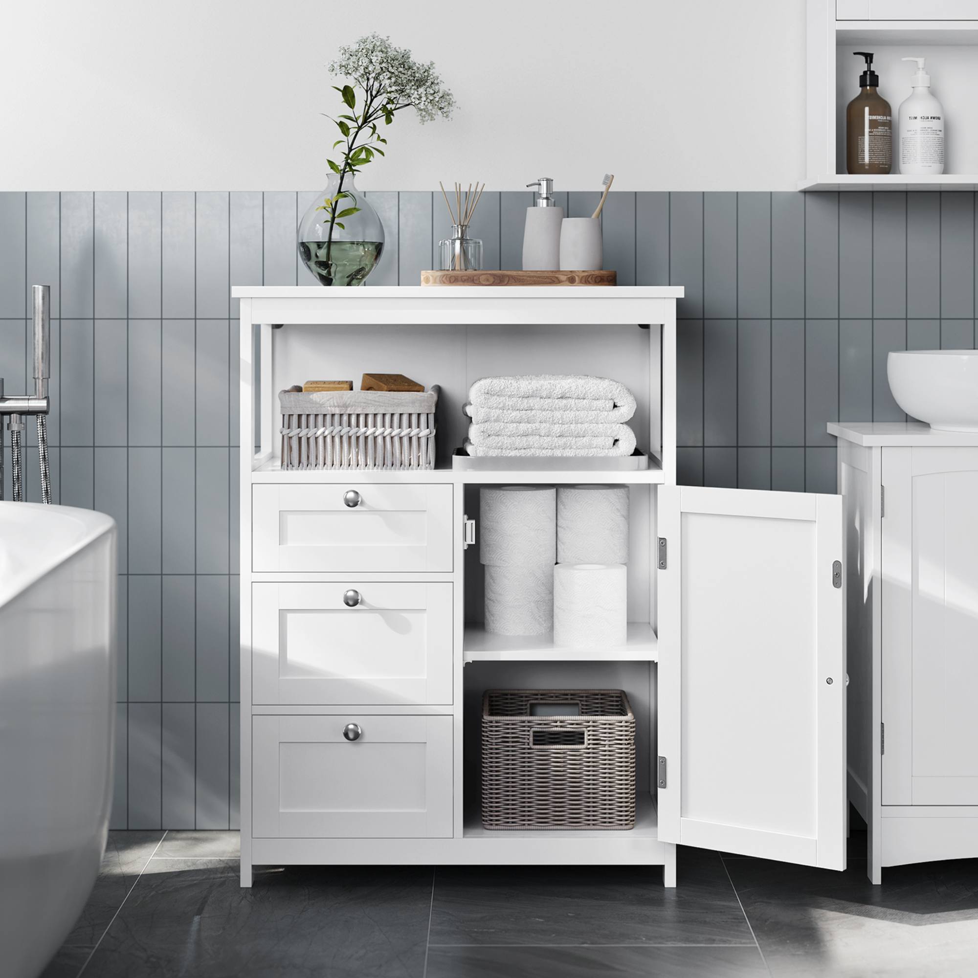 Kúpeľňová skrinka CLOUDE 1 ponúka dostatok otvoreného aj uzatvárateľného úložného priestoru, vďaka čomu nájde využitie v každej kúpeľni.